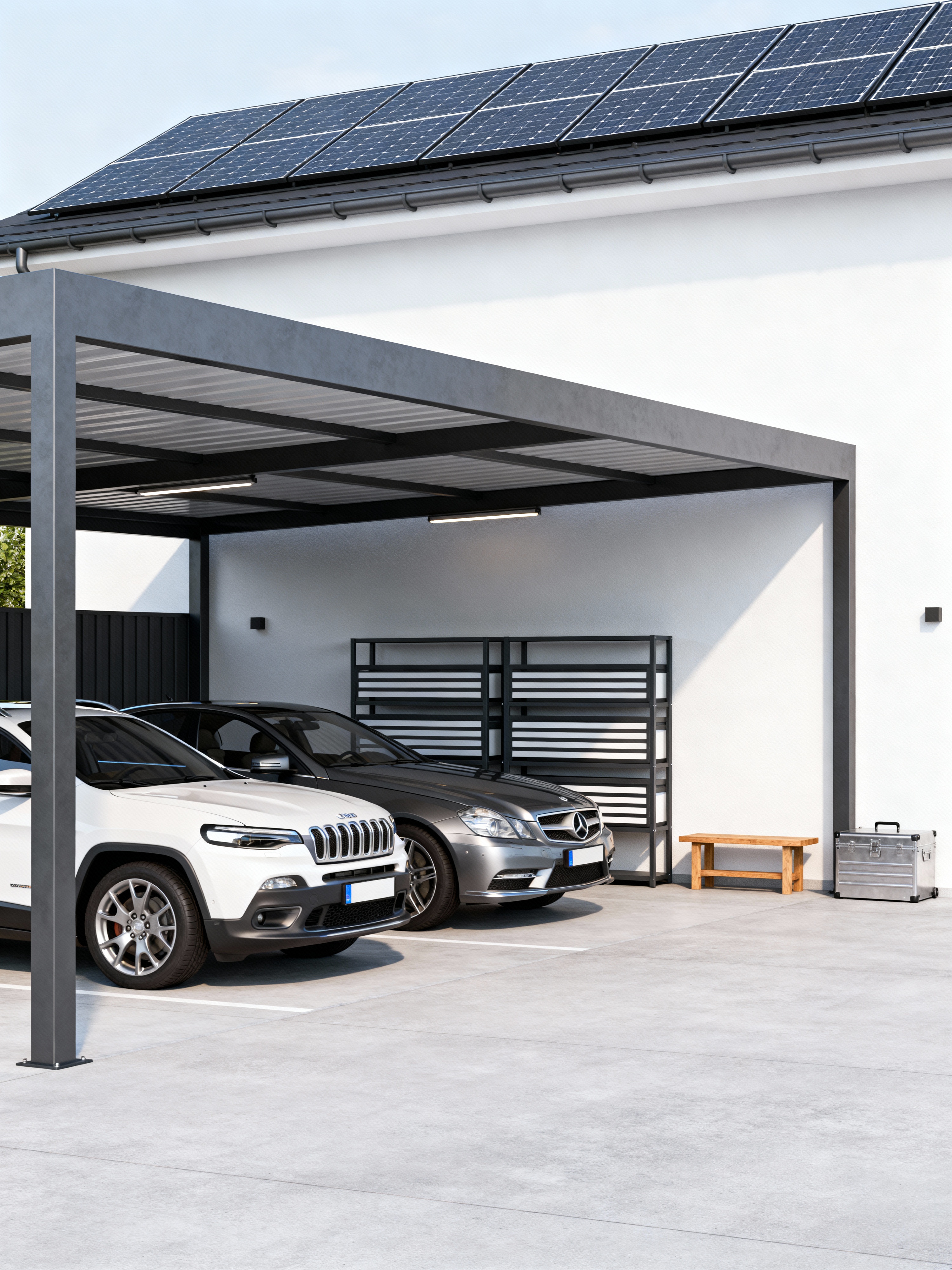 carport with simple style with carport and carport roof and canopy and roof solar panels and cars and storage racks and carport. . with streamlined look and functional furniture and basic elements and pure simplicity and clean design and calm atmosphere and understated style and uncluttered space