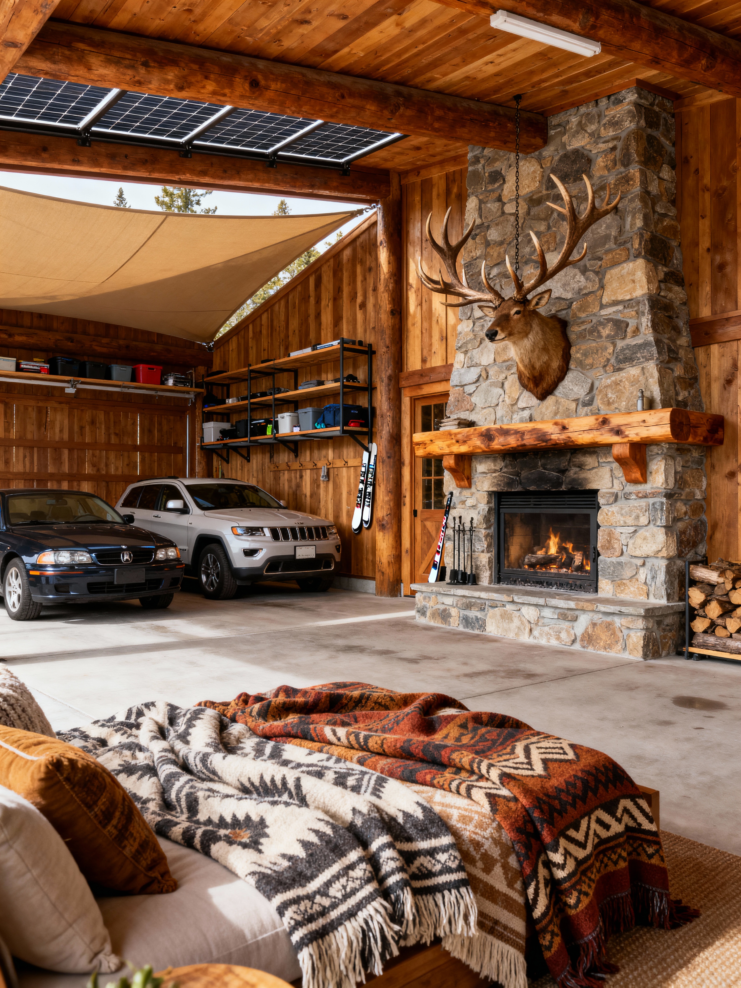 carport with ski chalet style with cars and carport and storage racks and canopy and roof solar panels and carport roof and cars. . with nature-inspired and hanging wall elk antler and stone fireplace and exposed timber and richly patterned fabrics and stone fireplace and layered textiles and wooden walls