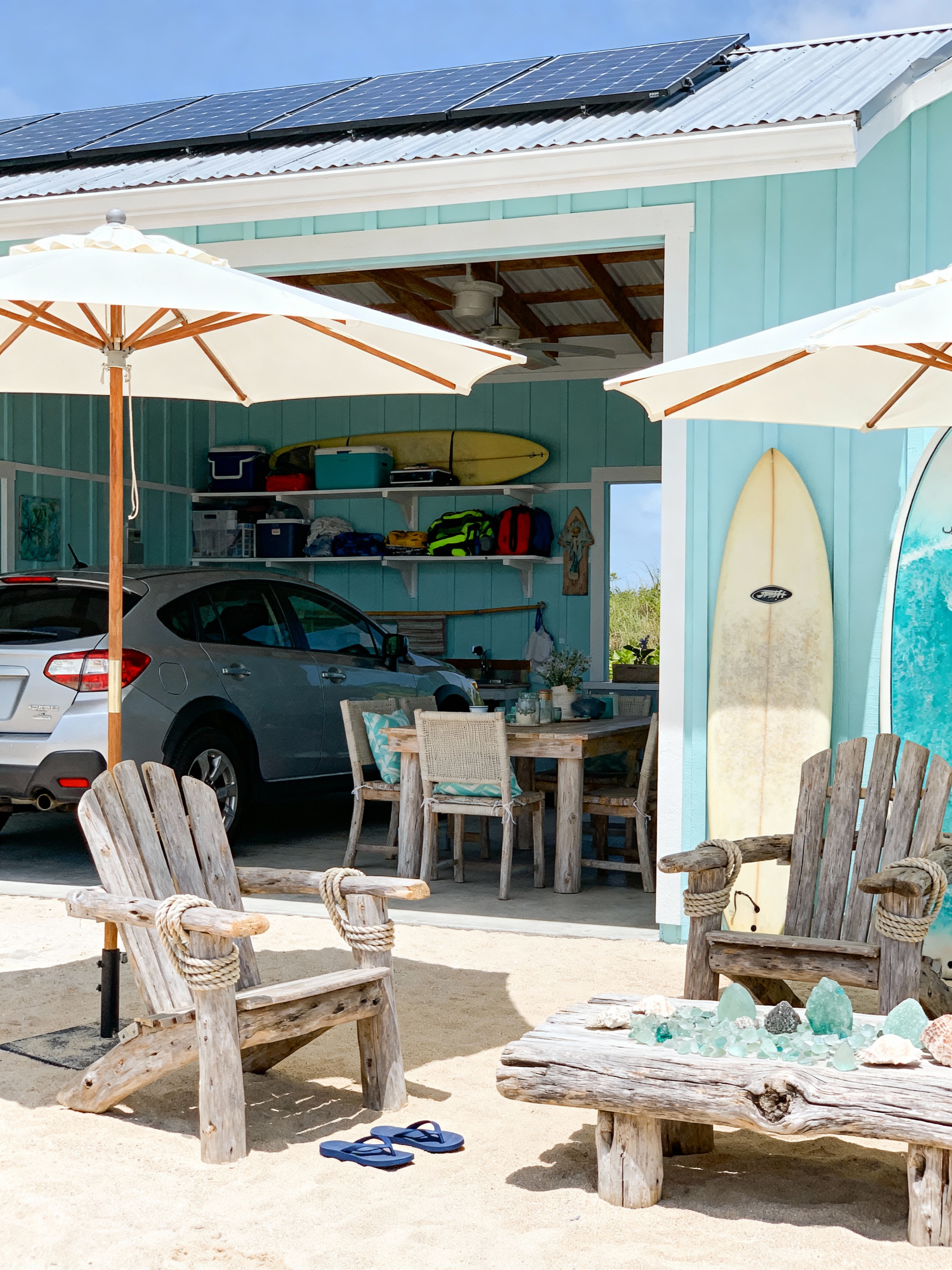 carport with surf shack style with carport roof and carport and cars and canopy and roof solar panels and storage racks and carport roof. . with beach umbrellas and casual dining and driftwood furniture and flip-flops and surfboard decor and beach chairs and sea glass and nautical rope