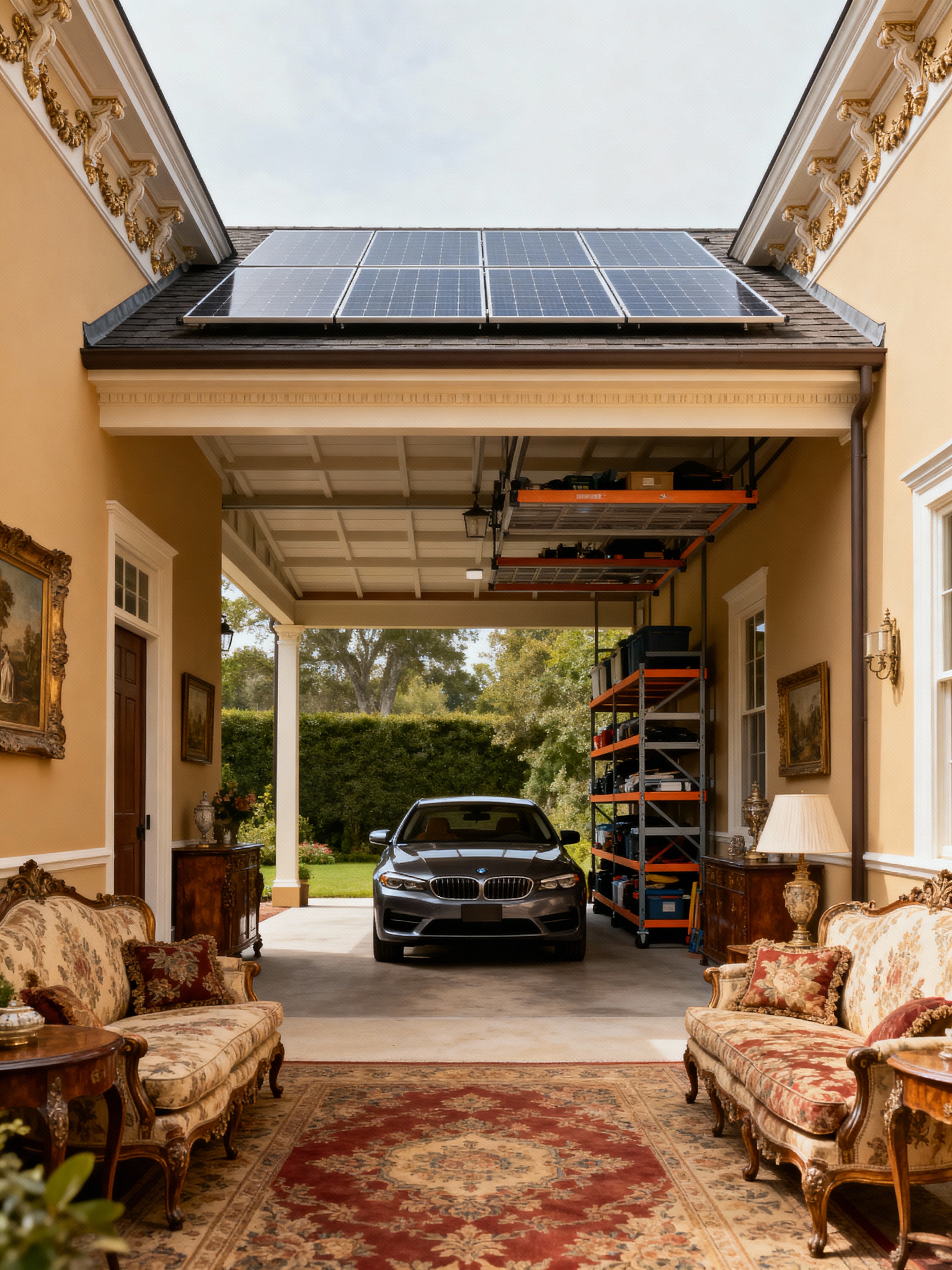carport with traditional style with cars and canopy and roof solar panels and storage racks and carport roof and carport and cars. . with symmetrical layout and formal furniture and antique pieces and rich fabrics and ornate details and classic elegance and crown molding and warm colors