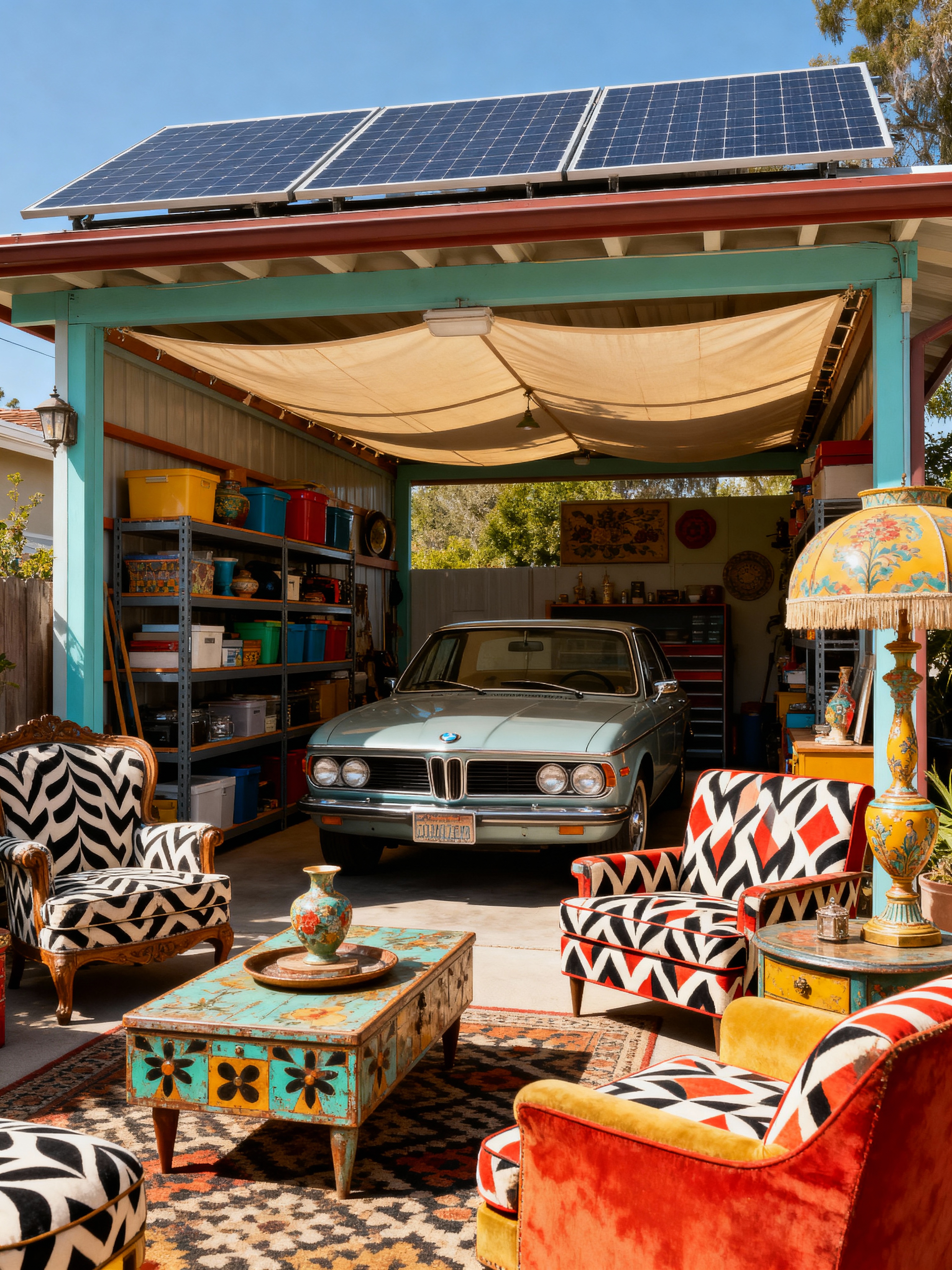 carport with vintage style with carport roof and roof solar panels and carport and cars and storage racks and canopy and carport roof. . with colorful accents and upcycled furniture and bold patterns and eclectic and nostalgic feel and ornate details and mid-century and timeless pieces