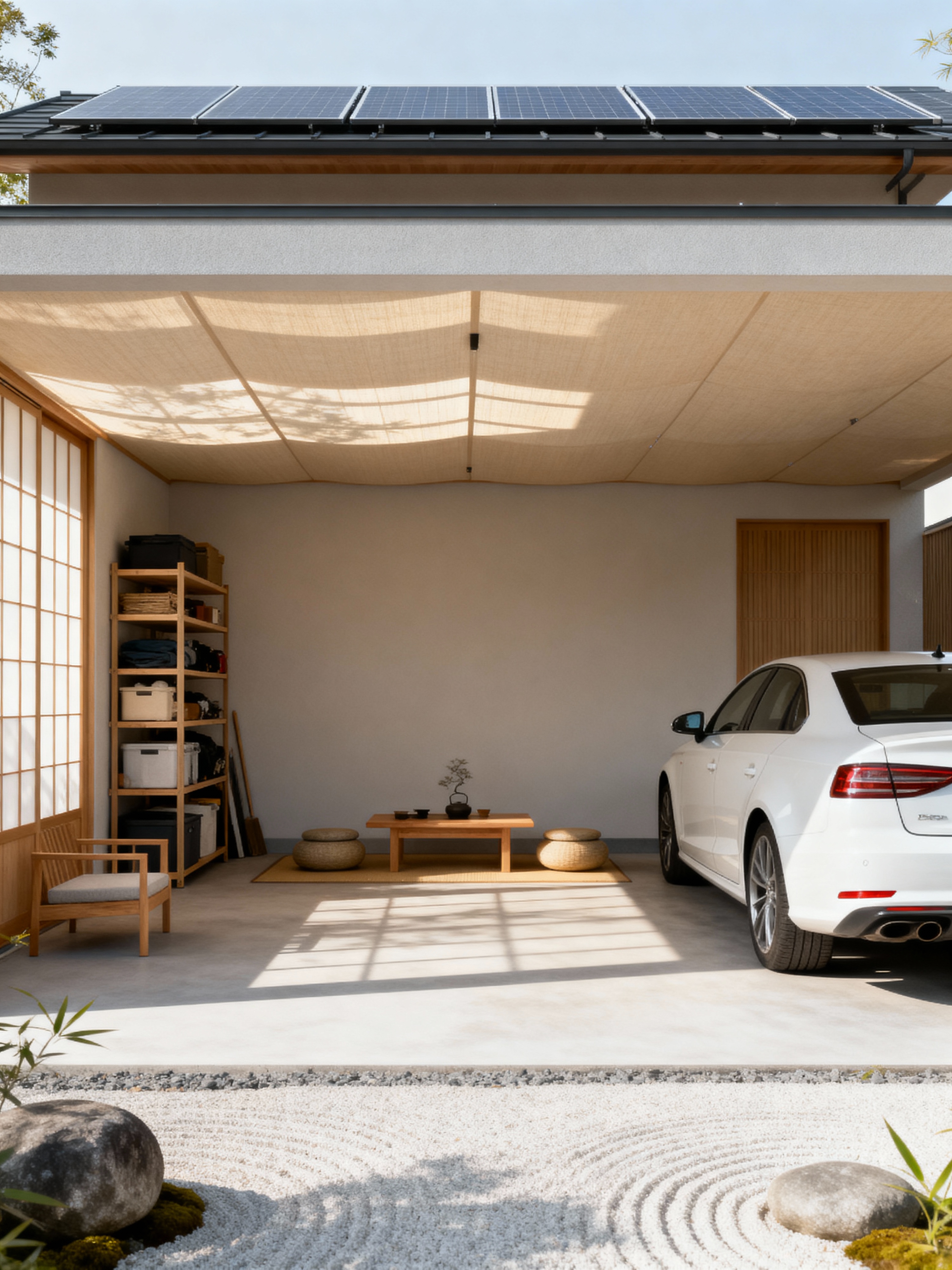 carport with zen style with canopy and cars and carport and storage racks and roof solar panels and carport roof and canopy. . with calm and neutral colors and japanese minimalist interior and asian interior and japanese interior and asian zen interior and asian zen interior and clean lines and simple furniture
