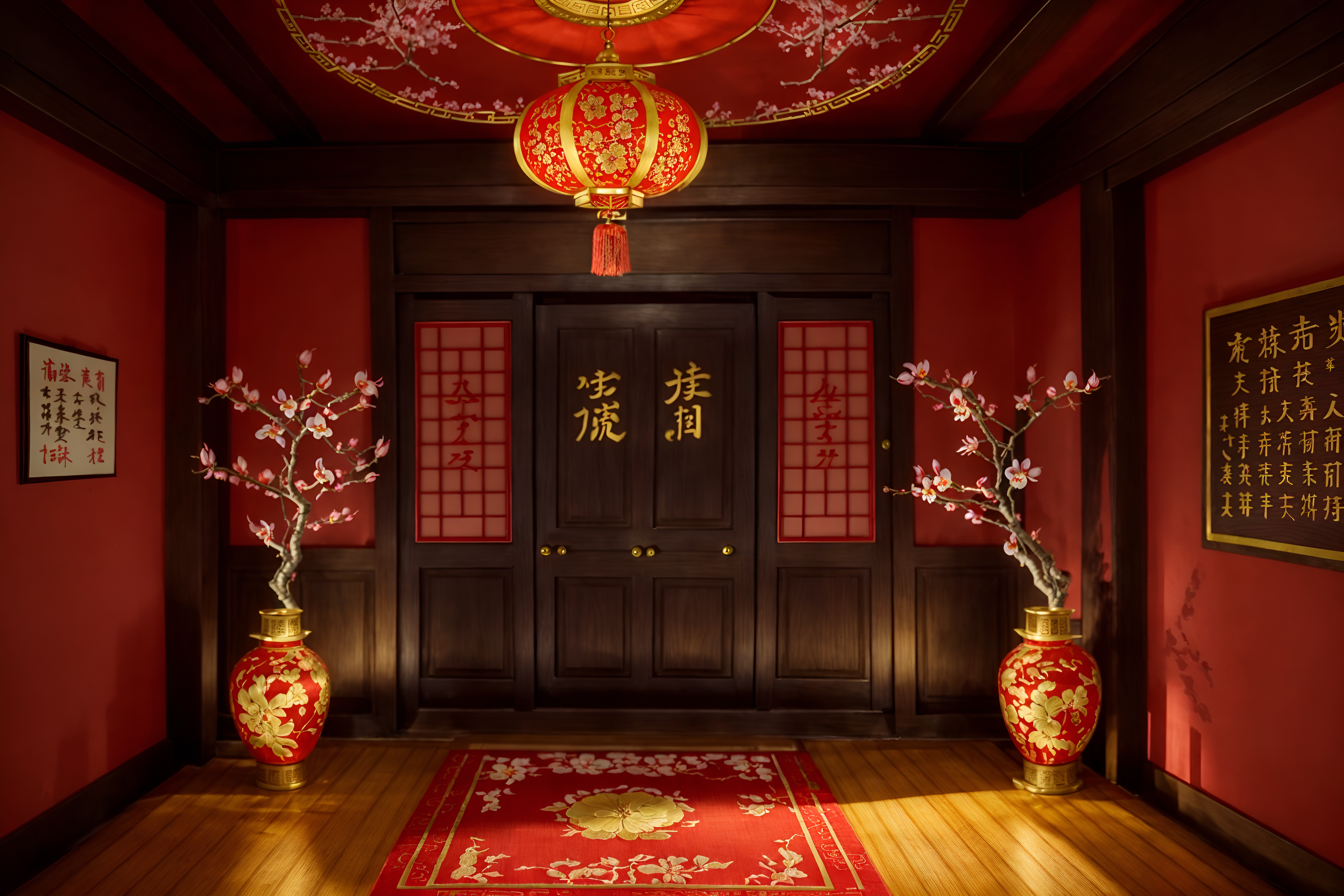 photo from pinterest of chinese new year-style interior designed (attic interior) . with vases of plum blossoms and orchids and red and gold tassels and door couplets and zodiac calendar and orange trees and red and gold candles and money tree and paper cuttings. . cinematic photo, highly detailed, cinematic lighting, ultra-detailed, ultrarealistic, photorealism, 8k. trending on pinterest. chinese new year interior design style. masterpiece, cinematic light, ultrarealistic+, photorealistic+, 8k, raw photo, realistic, sharp focus on eyes, (symmetrical eyes), (intact eyes), hyperrealistic, highest quality, best quality, , highly detailed, masterpiece, best quality, extremely detailed 8k wallpaper, masterpiece, best quality, ultra-detailed, best shadow, detailed background, detailed face, detailed eyes, high contrast, best illumination, detailed face, dulux, caustic, dynamic angle, detailed glow. dramatic lighting. highly detailed, insanely detailed hair, symmetrical, intricate details, professionally retouched, 8k high definition. strong bokeh. award winning photo.