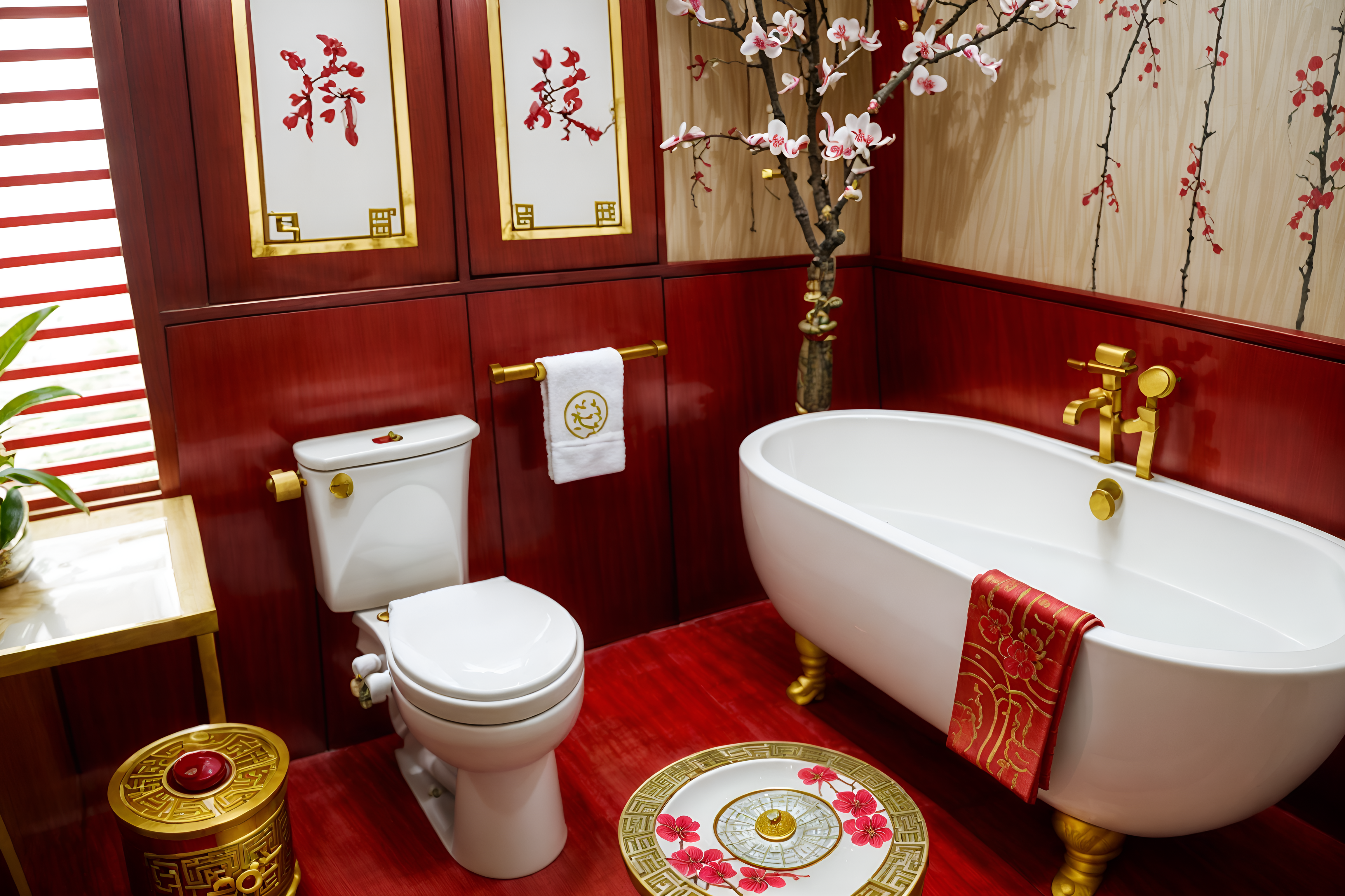 photo from pinterest of chinese new year-style interior designed (bathroom interior) with bathroom sink with faucet and toilet seat and bathtub and bath towel and bath rail and plant and shower and mirror. . with kumquat trees and vases of plum blossoms and orchids and money tree and mei hwa flowers and gold ingots and red fabric & pillows and zodiac calendar and paper cuttings. . cinematic photo, highly detailed, cinematic lighting, ultra-detailed, ultrarealistic, photorealism, 8k. trending on pinterest. chinese new year interior design style. masterpiece, cinematic light, ultrarealistic+, photorealistic+, 8k, raw photo, realistic, sharp focus on eyes, (symmetrical eyes), (intact eyes), hyperrealistic, highest quality, best quality, , highly detailed, masterpiece, best quality, extremely detailed 8k wallpaper, masterpiece, best quality, ultra-detailed, best shadow, detailed background, detailed face, detailed eyes, high contrast, best illumination, detailed face, dulux, caustic, dynamic angle, detailed glow. dramatic lighting. highly detailed, insanely detailed hair, symmetrical, intricate details, professionally retouched, 8k high definition. strong bokeh. award winning photo.