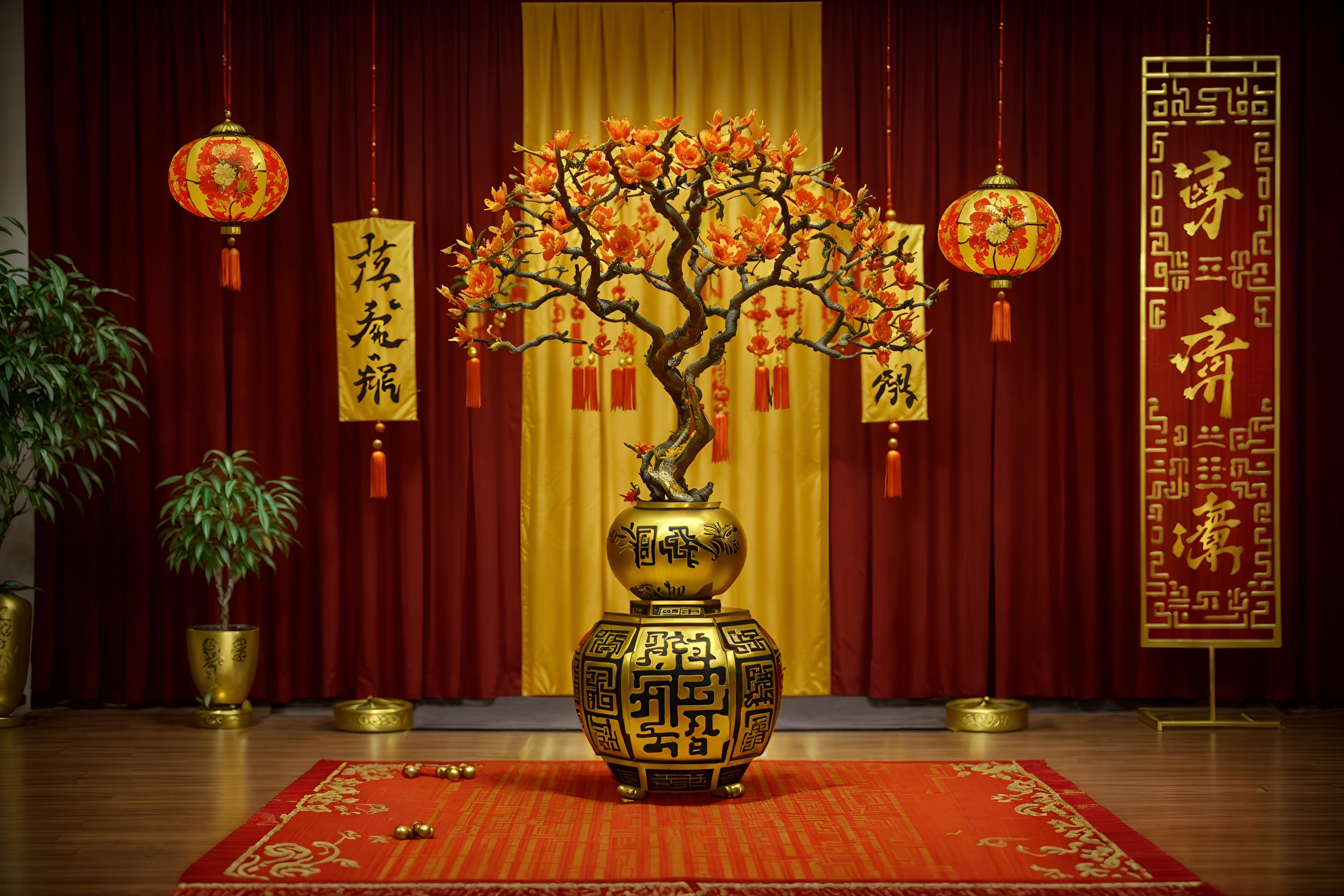 photo from pinterest of chinese new year-style interior designed (clothing store interior) . with fai chun banners and mei hwa flowers and chinese knots and gold ingots and orange trees and money tree and red and gold tassels and zodiac calendar. . cinematic photo, highly detailed, cinematic lighting, ultra-detailed, ultrarealistic, photorealism, 8k. trending on pinterest. chinese new year interior design style. masterpiece, cinematic light, ultrarealistic+, photorealistic+, 8k, raw photo, realistic, sharp focus on eyes, (symmetrical eyes), (intact eyes), hyperrealistic, highest quality, best quality, , highly detailed, masterpiece, best quality, extremely detailed 8k wallpaper, masterpiece, best quality, ultra-detailed, best shadow, detailed background, detailed face, detailed eyes, high contrast, best illumination, detailed face, dulux, caustic, dynamic angle, detailed glow. dramatic lighting. highly detailed, insanely detailed hair, symmetrical, intricate details, professionally retouched, 8k high definition. strong bokeh. award winning photo.