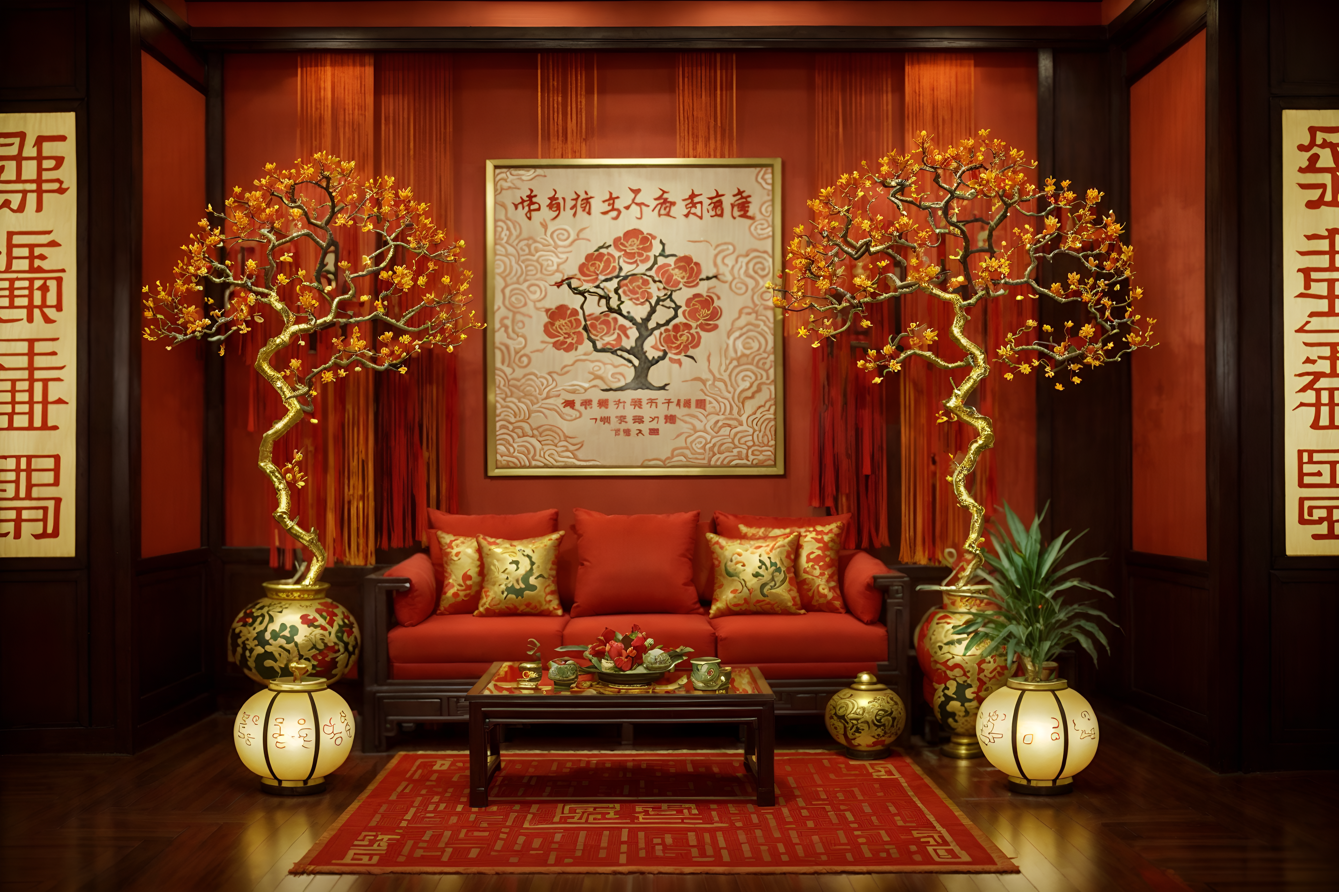photo from pinterest of chinese new year-style interior designed (clothing store interior) . with fai chun banners and mei hwa flowers and chinese knots and gold ingots and orange trees and money tree and red and gold tassels and zodiac calendar. . cinematic photo, highly detailed, cinematic lighting, ultra-detailed, ultrarealistic, photorealism, 8k. trending on pinterest. chinese new year interior design style. masterpiece, cinematic light, ultrarealistic+, photorealistic+, 8k, raw photo, realistic, sharp focus on eyes, (symmetrical eyes), (intact eyes), hyperrealistic, highest quality, best quality, , highly detailed, masterpiece, best quality, extremely detailed 8k wallpaper, masterpiece, best quality, ultra-detailed, best shadow, detailed background, detailed face, detailed eyes, high contrast, best illumination, detailed face, dulux, caustic, dynamic angle, detailed glow. dramatic lighting. highly detailed, insanely detailed hair, symmetrical, intricate details, professionally retouched, 8k high definition. strong bokeh. award winning photo.