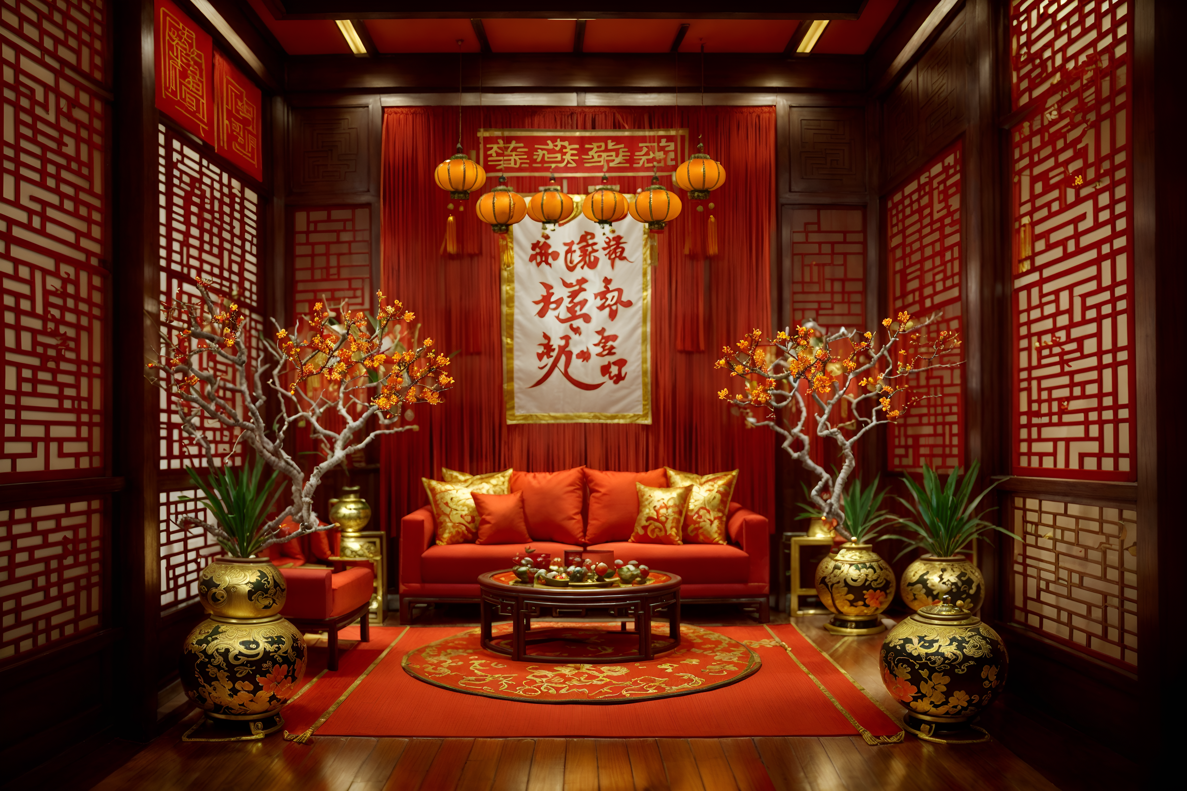 photo from pinterest of chinese new year-style interior designed (clothing store interior) . with fai chun banners and mei hwa flowers and chinese knots and gold ingots and orange trees and money tree and red and gold tassels and zodiac calendar. . cinematic photo, highly detailed, cinematic lighting, ultra-detailed, ultrarealistic, photorealism, 8k. trending on pinterest. chinese new year interior design style. masterpiece, cinematic light, ultrarealistic+, photorealistic+, 8k, raw photo, realistic, sharp focus on eyes, (symmetrical eyes), (intact eyes), hyperrealistic, highest quality, best quality, , highly detailed, masterpiece, best quality, extremely detailed 8k wallpaper, masterpiece, best quality, ultra-detailed, best shadow, detailed background, detailed face, detailed eyes, high contrast, best illumination, detailed face, dulux, caustic, dynamic angle, detailed glow. dramatic lighting. highly detailed, insanely detailed hair, symmetrical, intricate details, professionally retouched, 8k high definition. strong bokeh. award winning photo.