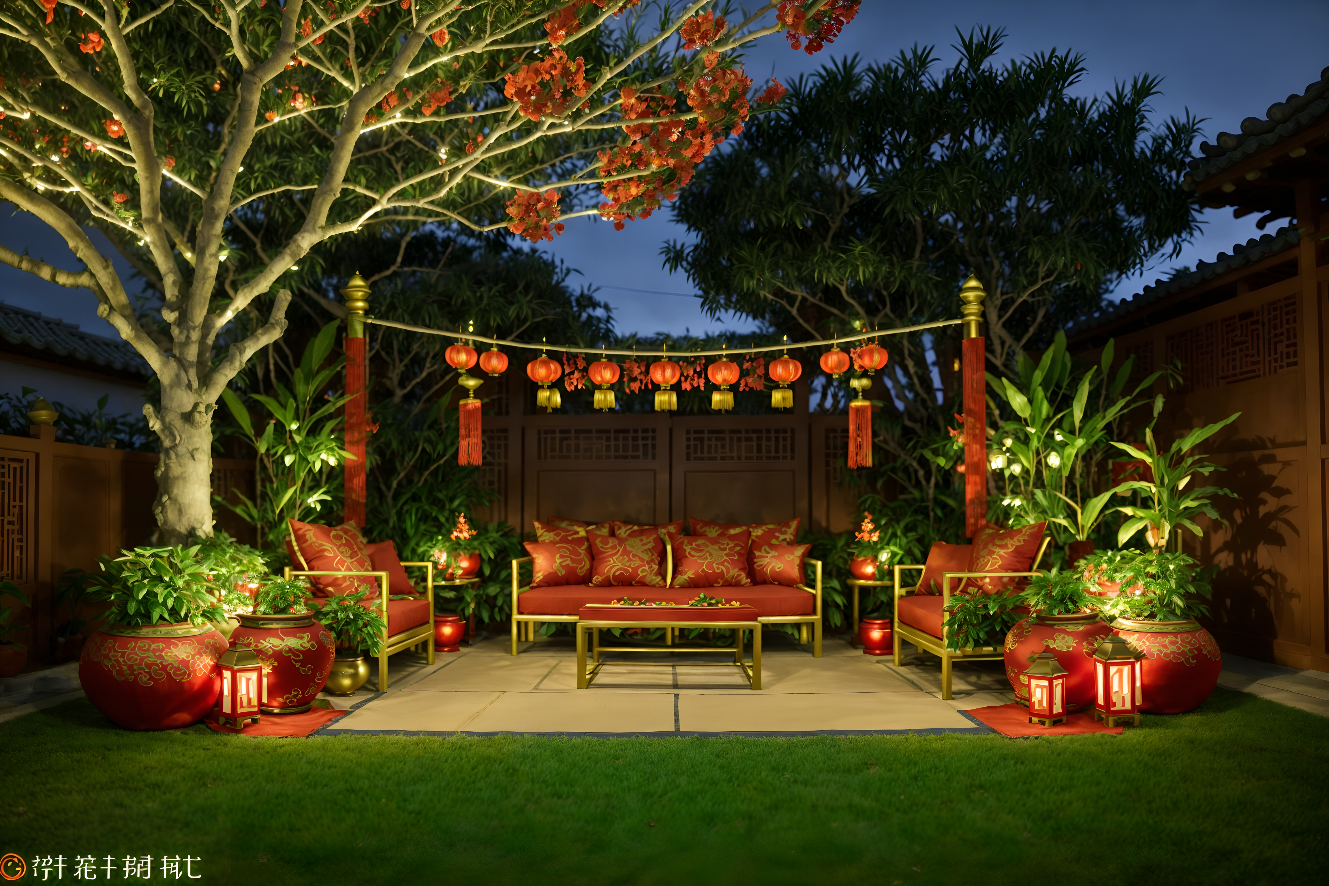 photo from pinterest of chinese new year-style designed (outdoor garden ) with garden plants and grass and garden tree and garden plants. . with money tree and orange trees and red and gold candles and red fabric & pillows and red and gold tassels and vases of plum blossoms and orchids and mei hwa flowers and zodiac calendar. . cinematic photo, highly detailed, cinematic lighting, ultra-detailed, ultrarealistic, photorealism, 8k. trending on pinterest. chinese new year design style. masterpiece, cinematic light, ultrarealistic+, photorealistic+, 8k, raw photo, realistic, sharp focus on eyes, (symmetrical eyes), (intact eyes), hyperrealistic, highest quality, best quality, , highly detailed, masterpiece, best quality, extremely detailed 8k wallpaper, masterpiece, best quality, ultra-detailed, best shadow, detailed background, detailed face, detailed eyes, high contrast, best illumination, detailed face, dulux, caustic, dynamic angle, detailed glow. dramatic lighting. highly detailed, insanely detailed hair, symmetrical, intricate details, professionally retouched, 8k high definition. strong bokeh. award winning photo.