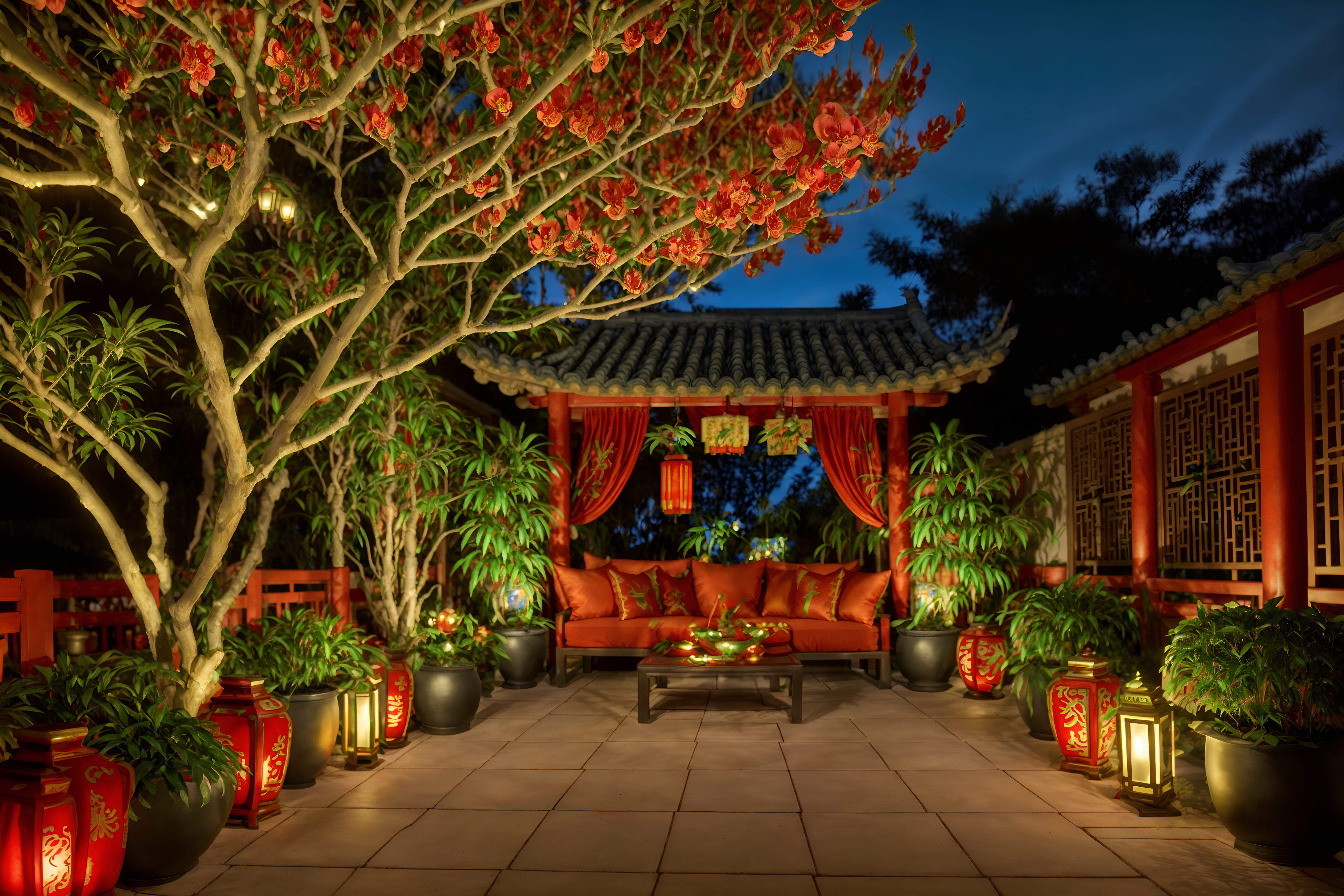 photo from pinterest of chinese new year-style designed (outdoor garden ) with garden plants and grass and garden tree and garden plants. . with money tree and orange trees and red and gold candles and red fabric & pillows and red and gold tassels and vases of plum blossoms and orchids and mei hwa flowers and zodiac calendar. . cinematic photo, highly detailed, cinematic lighting, ultra-detailed, ultrarealistic, photorealism, 8k. trending on pinterest. chinese new year design style. masterpiece, cinematic light, ultrarealistic+, photorealistic+, 8k, raw photo, realistic, sharp focus on eyes, (symmetrical eyes), (intact eyes), hyperrealistic, highest quality, best quality, , highly detailed, masterpiece, best quality, extremely detailed 8k wallpaper, masterpiece, best quality, ultra-detailed, best shadow, detailed background, detailed face, detailed eyes, high contrast, best illumination, detailed face, dulux, caustic, dynamic angle, detailed glow. dramatic lighting. highly detailed, insanely detailed hair, symmetrical, intricate details, professionally retouched, 8k high definition. strong bokeh. award winning photo.