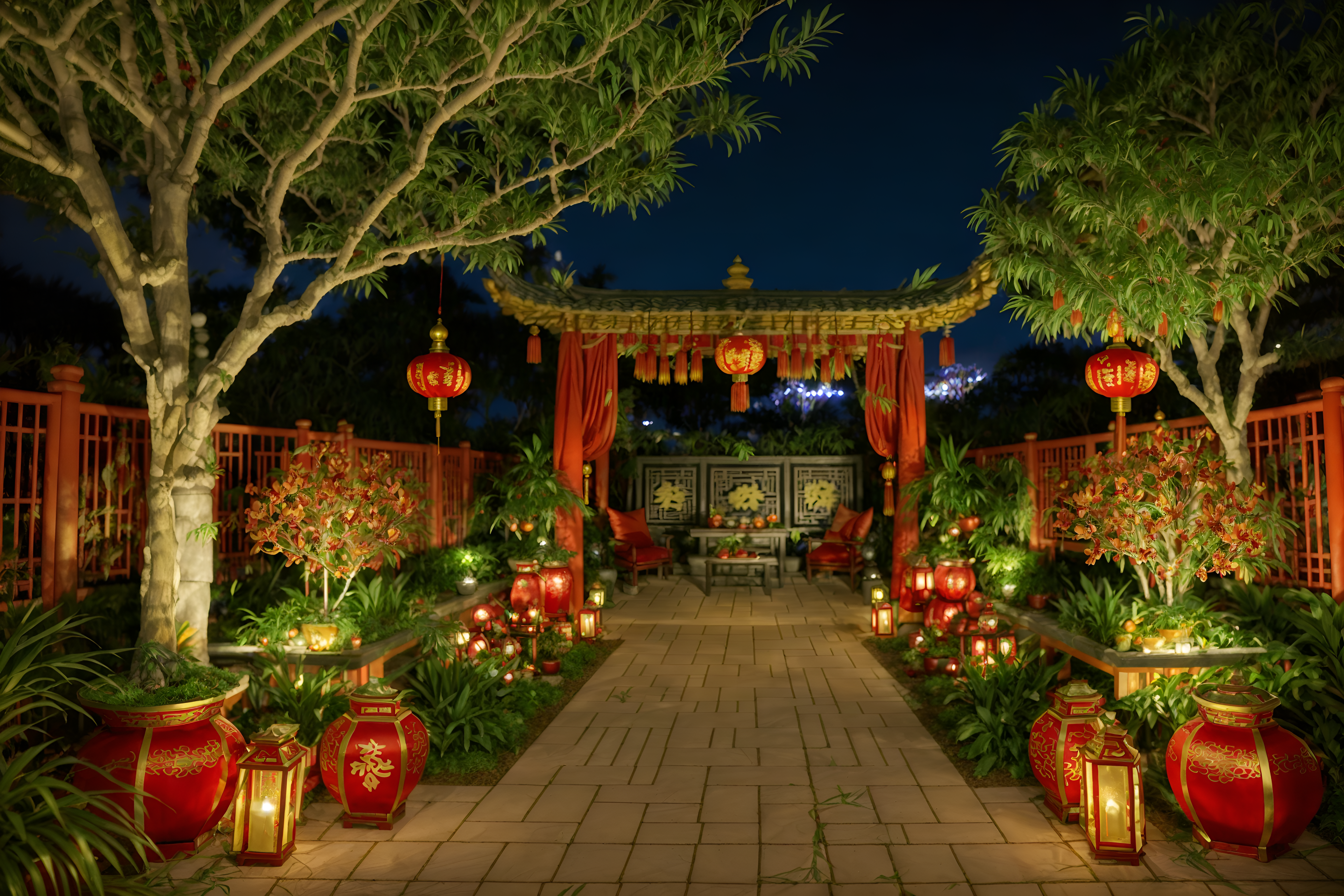 photo from pinterest of chinese new year-style designed (outdoor garden ) with garden plants and grass and garden tree and garden plants. . with money tree and orange trees and red and gold candles and red fabric & pillows and red and gold tassels and vases of plum blossoms and orchids and mei hwa flowers and zodiac calendar. . cinematic photo, highly detailed, cinematic lighting, ultra-detailed, ultrarealistic, photorealism, 8k. trending on pinterest. chinese new year design style. masterpiece, cinematic light, ultrarealistic+, photorealistic+, 8k, raw photo, realistic, sharp focus on eyes, (symmetrical eyes), (intact eyes), hyperrealistic, highest quality, best quality, , highly detailed, masterpiece, best quality, extremely detailed 8k wallpaper, masterpiece, best quality, ultra-detailed, best shadow, detailed background, detailed face, detailed eyes, high contrast, best illumination, detailed face, dulux, caustic, dynamic angle, detailed glow. dramatic lighting. highly detailed, insanely detailed hair, symmetrical, intricate details, professionally retouched, 8k high definition. strong bokeh. award winning photo.