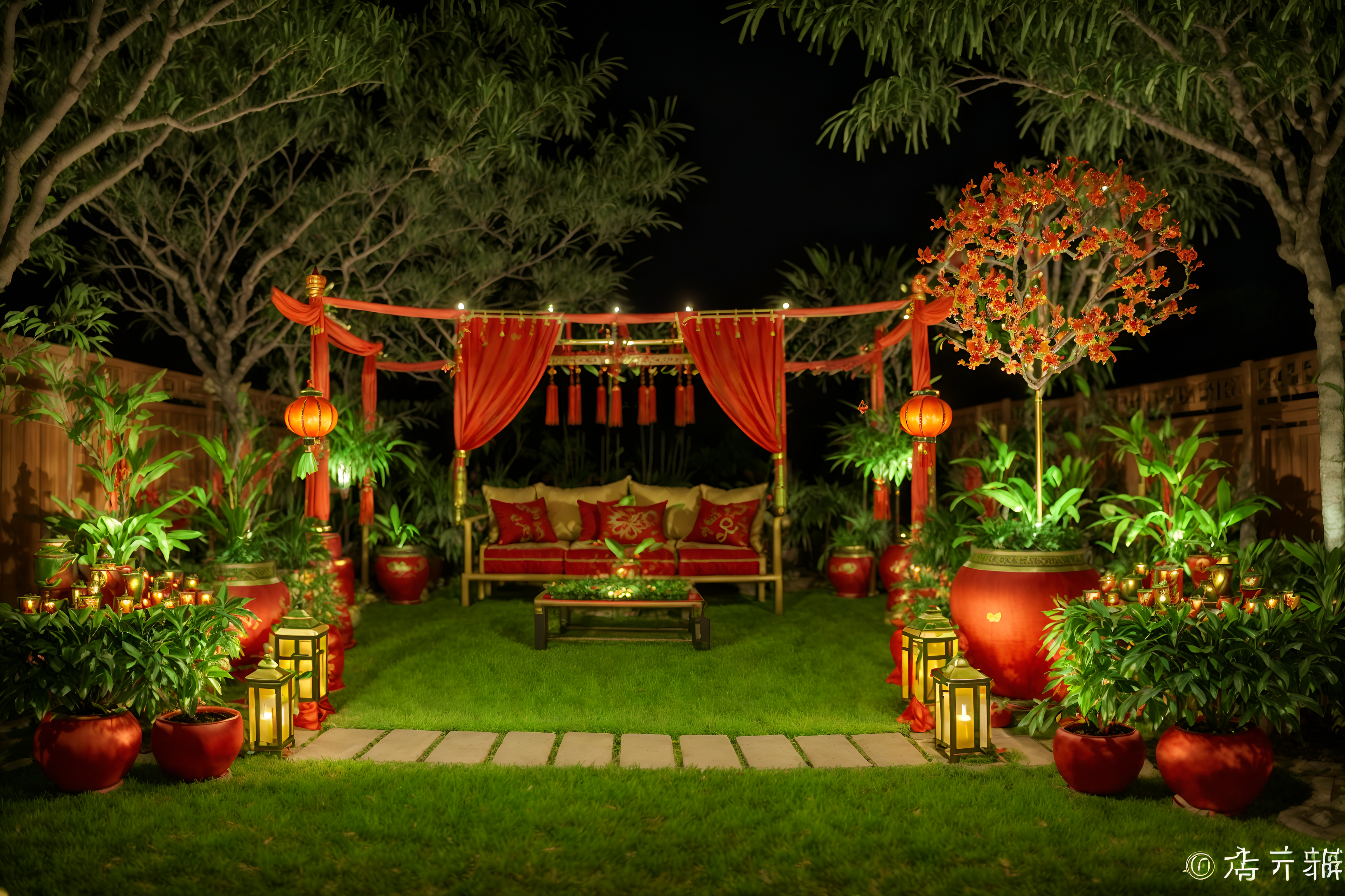Chinese New Year outdoor gardensinterior decorate this outdoor garden with chinese new year style. . . with garden plants and garden tree and grass and garden plants. . with orange trees and chinese knots and money tree and door couplets and chinese red lanterns and kumquat trees and red fabric & pillows and gold ingots. . .