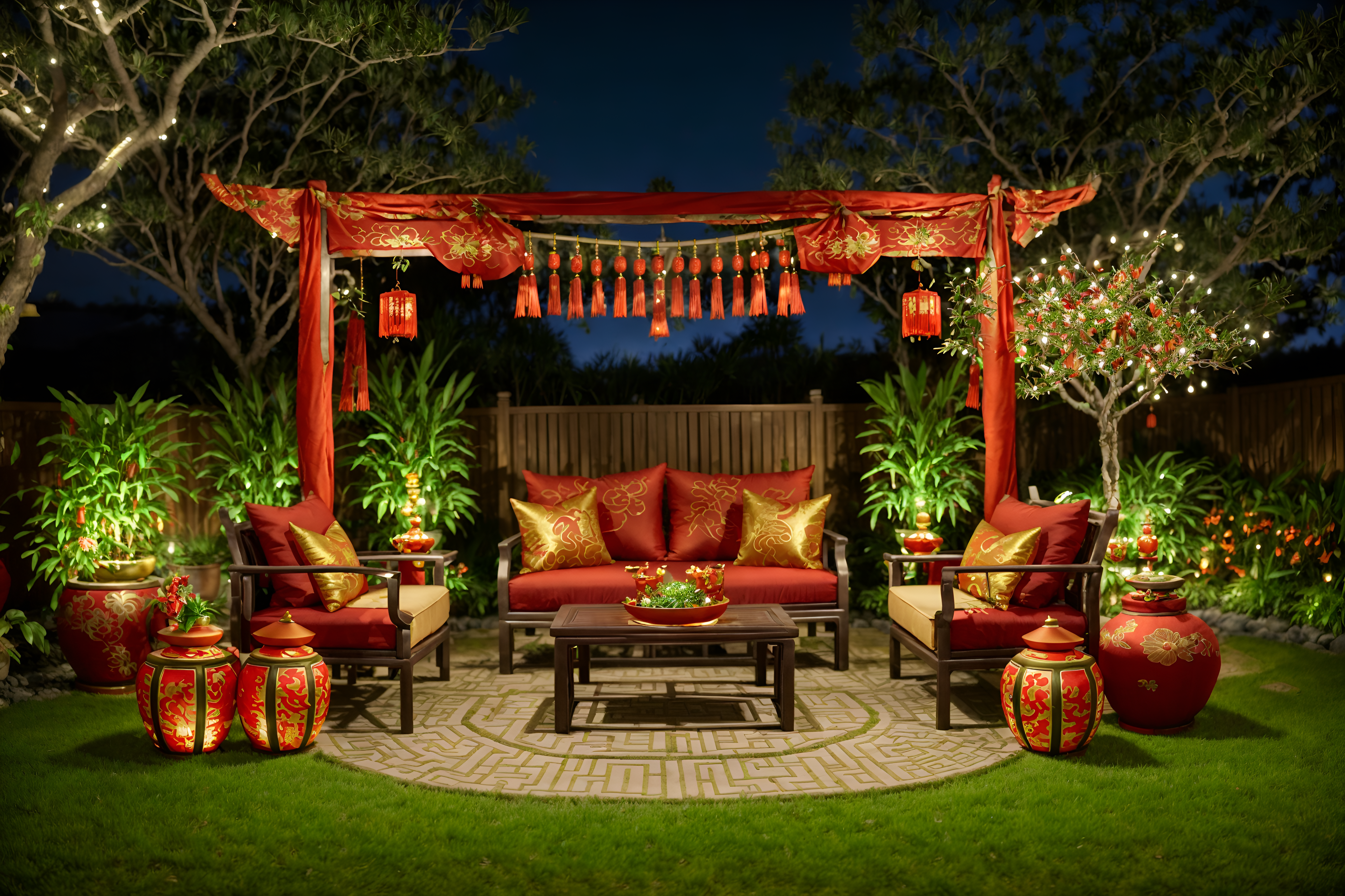 photo from pinterest of chinese new year-style designed (outdoor garden ) with garden plants and grass and garden tree and garden plants. . with money tree and orange trees and red and gold candles and red fabric & pillows and red and gold tassels and vases of plum blossoms and orchids and mei hwa flowers and zodiac calendar. . cinematic photo, highly detailed, cinematic lighting, ultra-detailed, ultrarealistic, photorealism, 8k. trending on pinterest. chinese new year design style. masterpiece, cinematic light, ultrarealistic+, photorealistic+, 8k, raw photo, realistic, sharp focus on eyes, (symmetrical eyes), (intact eyes), hyperrealistic, highest quality, best quality, , highly detailed, masterpiece, best quality, extremely detailed 8k wallpaper, masterpiece, best quality, ultra-detailed, best shadow, detailed background, detailed face, detailed eyes, high contrast, best illumination, detailed face, dulux, caustic, dynamic angle, detailed glow. dramatic lighting. highly detailed, insanely detailed hair, symmetrical, intricate details, professionally retouched, 8k high definition. strong bokeh. award winning photo.