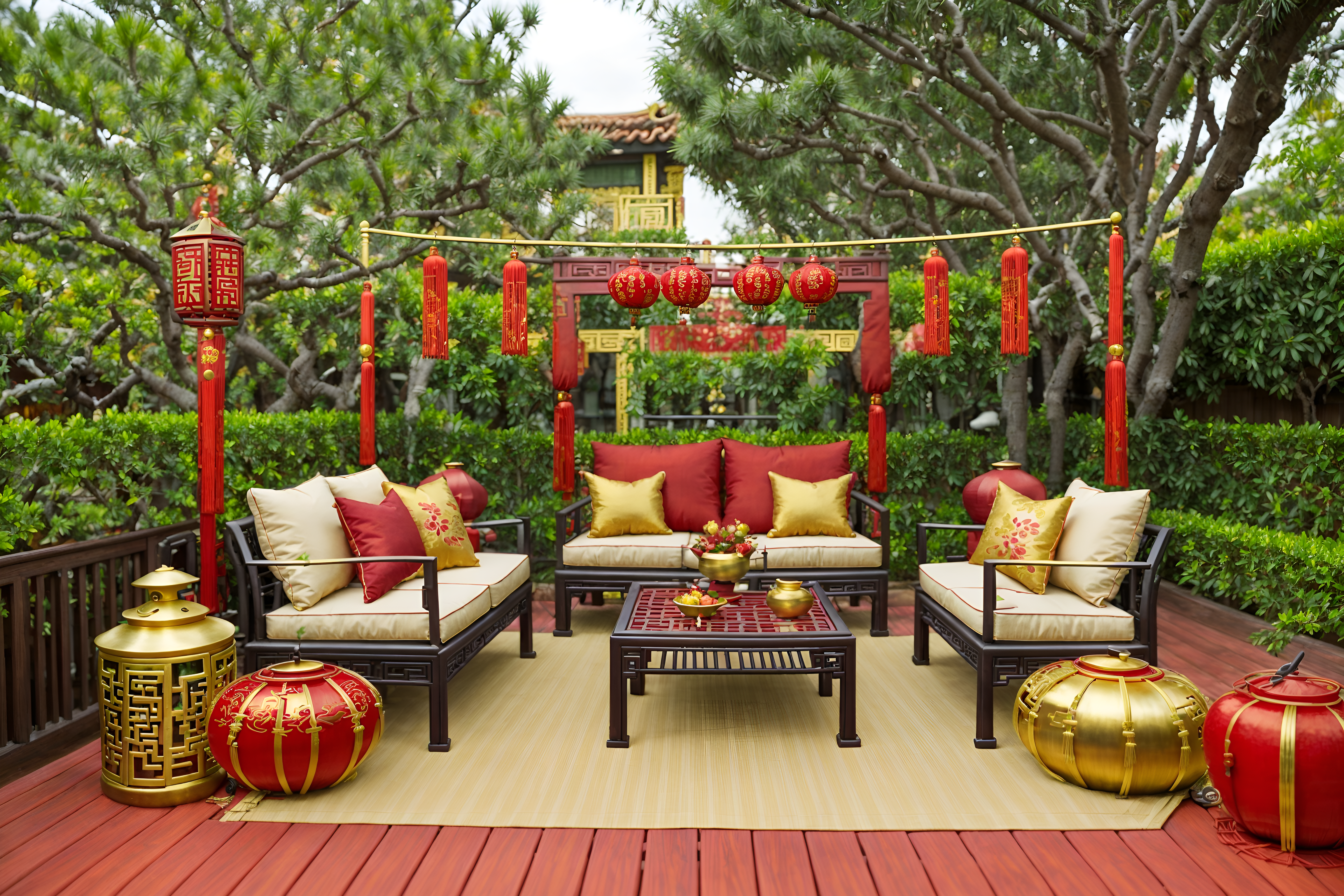 Chinese New Year outdoor patiosinterior decorate this outdoor patio with chinese new year style. . . with deck with deck chairs and barbeque or grill and plant and patio couch with pillows and grass and deck with deck chairs. . with fai chun banners and red and gold tassels and zodiac calendar and red and gold candles and chinese red lanterns and paper firecrackers and kumquat trees and orange trees. . .