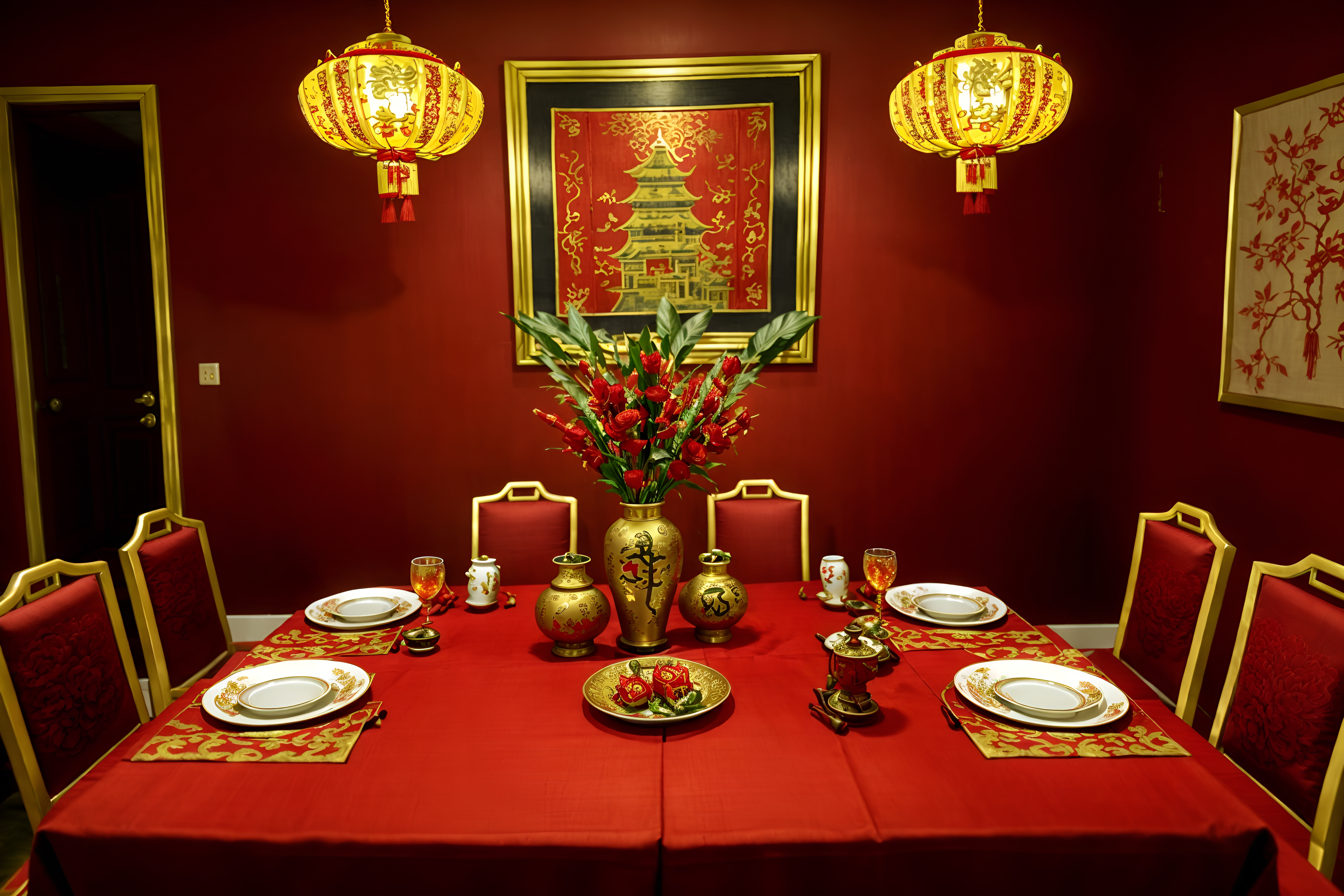 Chinese New Year dining roomsinterior decorate this dining room with chinese new year style. . . with plates, cutlery and glasses on dining table and dining table chairs and dining table and bookshelves and vase and table cloth and light or chandelier and painting or photo on wall. . with chinese red lanterns and red fabric & pillows and gold ingots and vases of plum blossoms and orchids and paper firecrackers and red and gold tassels and mei hwa flowers and chinese knots. . .