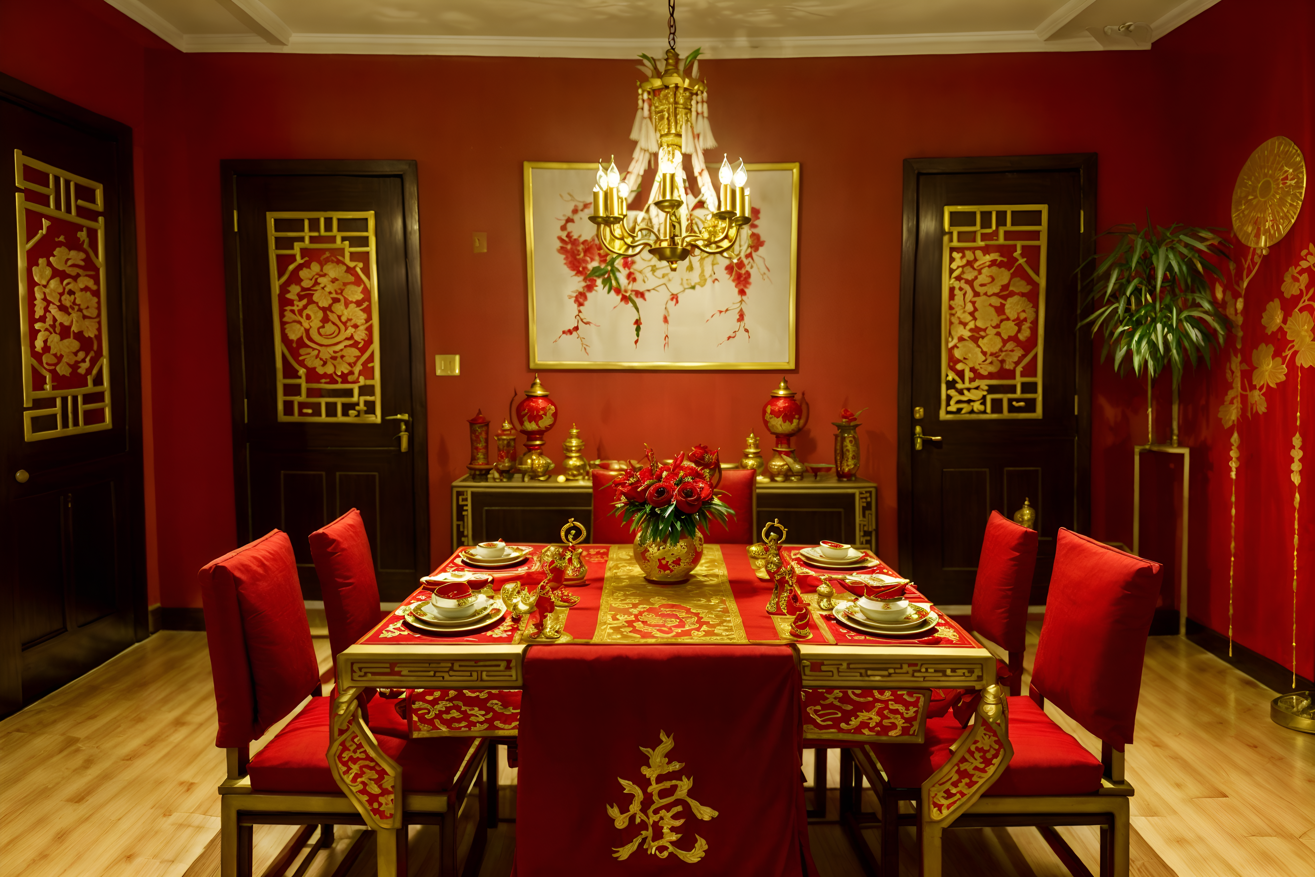 photo from pinterest of chinese new year-style interior designed (dining room interior) with painting or photo on wall and plant and vase and dining table chairs and dining table and light or chandelier and table cloth and plates, cutlery and glasses on dining table. . with fai chun banners and red and gold candles and red and gold tassels and red fabric & pillows and gold ingots and door couplets and kumquat trees and chinese knots. . cinematic photo, highly detailed, cinematic lighting, ultra-detailed, ultrarealistic, photorealism, 8k. trending on pinterest. chinese new year interior design style. masterpiece, cinematic light, ultrarealistic+, photorealistic+, 8k, raw photo, realistic, sharp focus on eyes, (symmetrical eyes), (intact eyes), hyperrealistic, highest quality, best quality, , highly detailed, masterpiece, best quality, extremely detailed 8k wallpaper, masterpiece, best quality, ultra-detailed, best shadow, detailed background, detailed face, detailed eyes, high contrast, best illumination, detailed face, dulux, caustic, dynamic angle, detailed glow. dramatic lighting. highly detailed, insanely detailed hair, symmetrical, intricate details, professionally retouched, 8k high definition. strong bokeh. award winning photo.