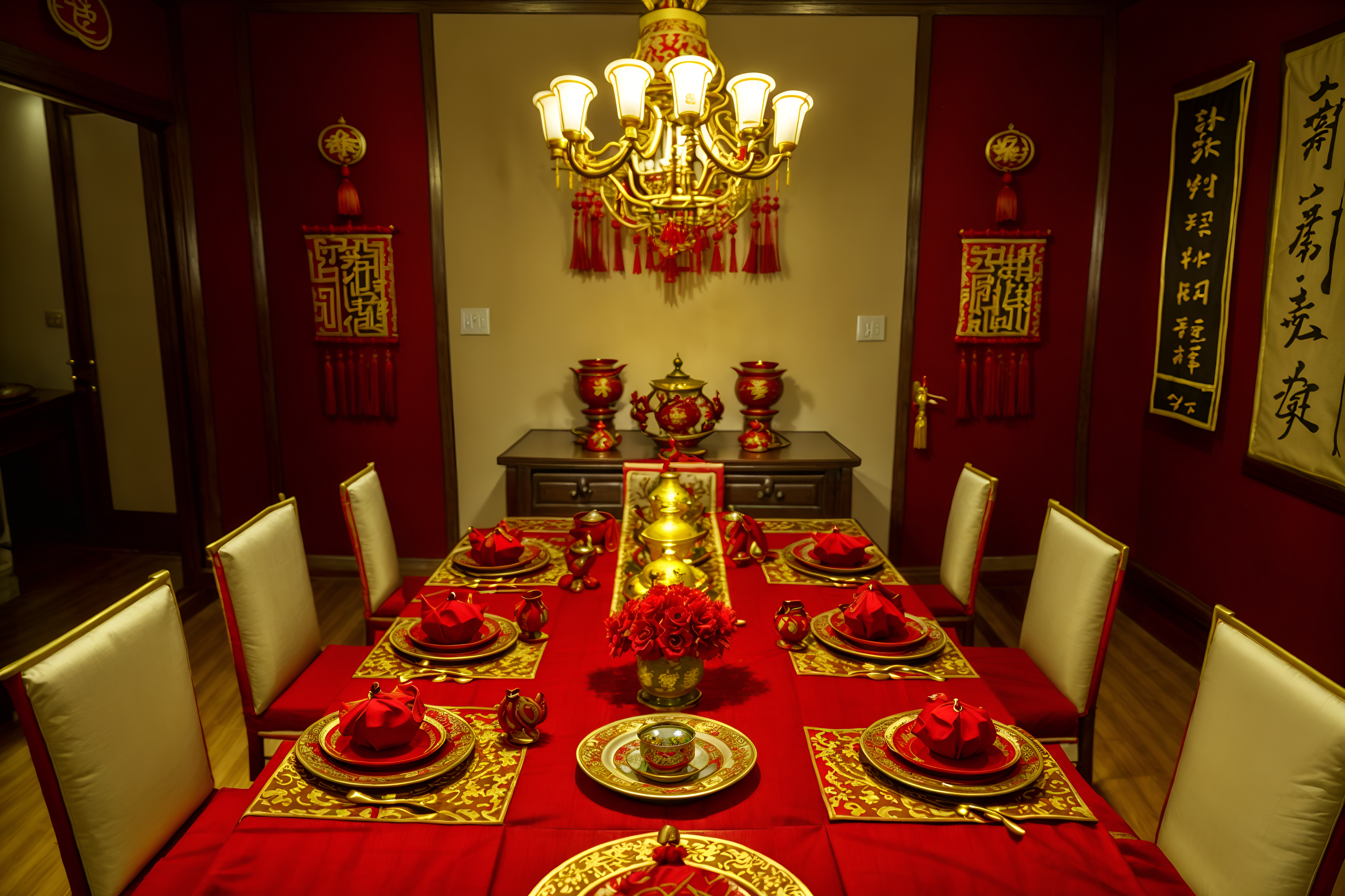 photo from pinterest of chinese new year-style interior designed (dining room interior) with painting or photo on wall and plant and vase and dining table chairs and dining table and light or chandelier and table cloth and plates, cutlery and glasses on dining table. . with fai chun banners and red and gold candles and red and gold tassels and red fabric & pillows and gold ingots and door couplets and kumquat trees and chinese knots. . cinematic photo, highly detailed, cinematic lighting, ultra-detailed, ultrarealistic, photorealism, 8k. trending on pinterest. chinese new year interior design style. masterpiece, cinematic light, ultrarealistic+, photorealistic+, 8k, raw photo, realistic, sharp focus on eyes, (symmetrical eyes), (intact eyes), hyperrealistic, highest quality, best quality, , highly detailed, masterpiece, best quality, extremely detailed 8k wallpaper, masterpiece, best quality, ultra-detailed, best shadow, detailed background, detailed face, detailed eyes, high contrast, best illumination, detailed face, dulux, caustic, dynamic angle, detailed glow. dramatic lighting. highly detailed, insanely detailed hair, symmetrical, intricate details, professionally retouched, 8k high definition. strong bokeh. award winning photo.