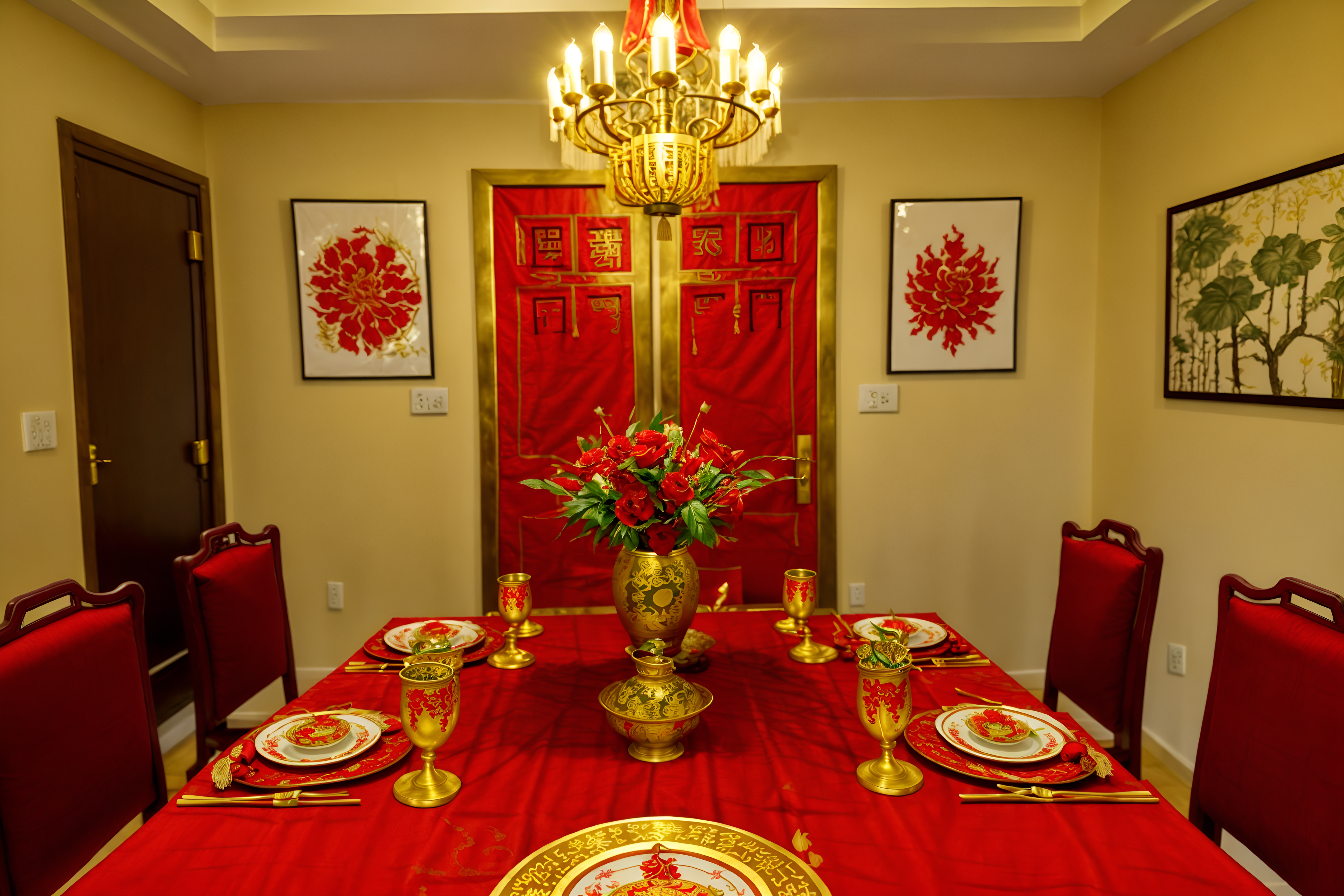 photo from pinterest of chinese new year-style interior designed (dining room interior) with painting or photo on wall and plant and vase and dining table chairs and dining table and light or chandelier and table cloth and plates, cutlery and glasses on dining table. . with fai chun banners and red and gold candles and red and gold tassels and red fabric & pillows and gold ingots and door couplets and kumquat trees and chinese knots. . cinematic photo, highly detailed, cinematic lighting, ultra-detailed, ultrarealistic, photorealism, 8k. trending on pinterest. chinese new year interior design style. masterpiece, cinematic light, ultrarealistic+, photorealistic+, 8k, raw photo, realistic, sharp focus on eyes, (symmetrical eyes), (intact eyes), hyperrealistic, highest quality, best quality, , highly detailed, masterpiece, best quality, extremely detailed 8k wallpaper, masterpiece, best quality, ultra-detailed, best shadow, detailed background, detailed face, detailed eyes, high contrast, best illumination, detailed face, dulux, caustic, dynamic angle, detailed glow. dramatic lighting. highly detailed, insanely detailed hair, symmetrical, intricate details, professionally retouched, 8k high definition. strong bokeh. award winning photo.