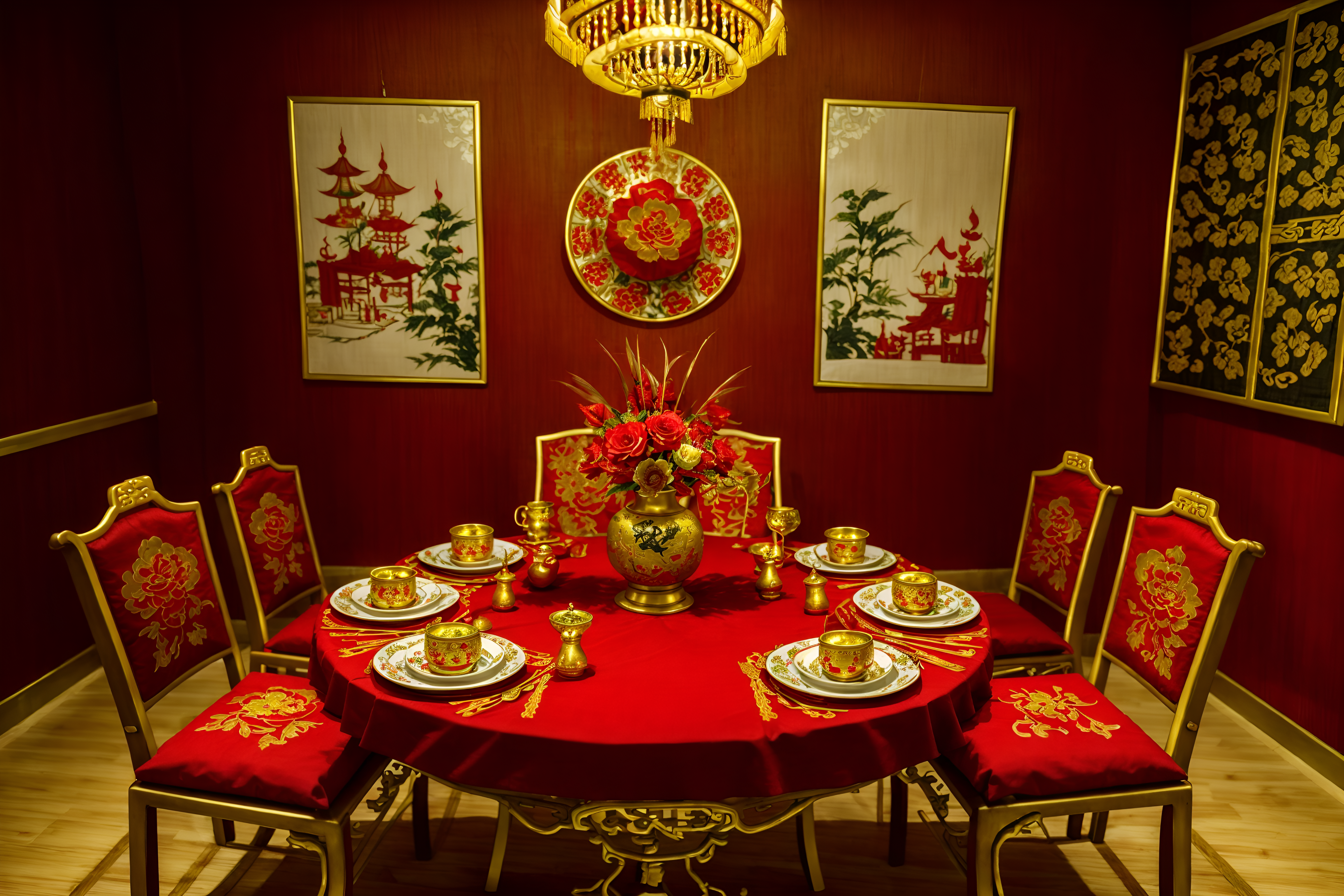 photo from pinterest of chinese new year-style interior designed (dining room interior) with painting or photo on wall and plant and vase and dining table chairs and dining table and light or chandelier and table cloth and plates, cutlery and glasses on dining table. . with fai chun banners and red and gold candles and red and gold tassels and red fabric & pillows and gold ingots and door couplets and kumquat trees and chinese knots. . cinematic photo, highly detailed, cinematic lighting, ultra-detailed, ultrarealistic, photorealism, 8k. trending on pinterest. chinese new year interior design style. masterpiece, cinematic light, ultrarealistic+, photorealistic+, 8k, raw photo, realistic, sharp focus on eyes, (symmetrical eyes), (intact eyes), hyperrealistic, highest quality, best quality, , highly detailed, masterpiece, best quality, extremely detailed 8k wallpaper, masterpiece, best quality, ultra-detailed, best shadow, detailed background, detailed face, detailed eyes, high contrast, best illumination, detailed face, dulux, caustic, dynamic angle, detailed glow. dramatic lighting. highly detailed, insanely detailed hair, symmetrical, intricate details, professionally retouched, 8k high definition. strong bokeh. award winning photo.