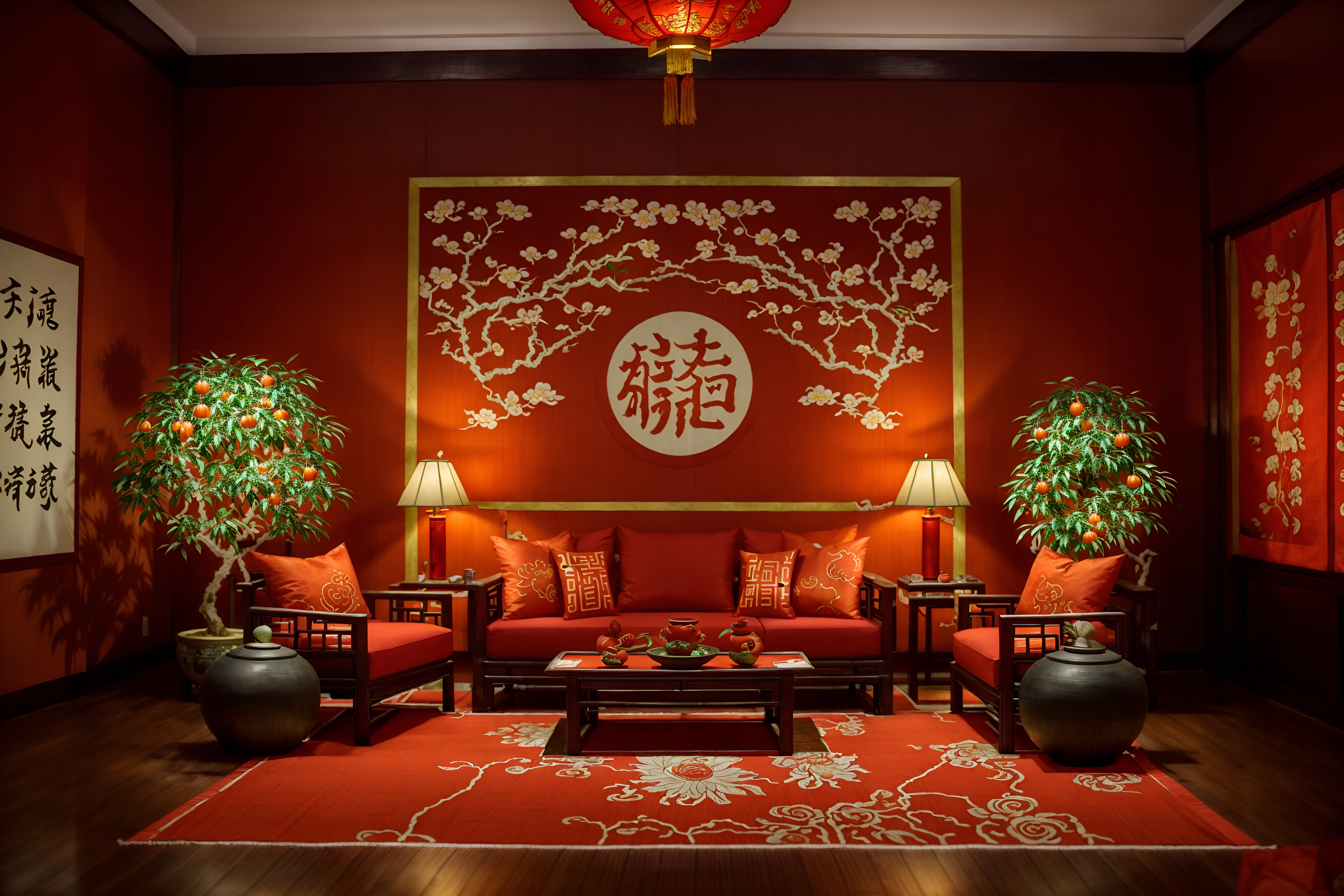 photo from pinterest of chinese new year-style interior designed (exhibition space interior) . with money tree and mei hwa flowers and kumquat trees and orange trees and zodiac calendar and chinese red lanterns and chinese knots and red fabric & pillows. . cinematic photo, highly detailed, cinematic lighting, ultra-detailed, ultrarealistic, photorealism, 8k. trending on pinterest. chinese new year interior design style. masterpiece, cinematic light, ultrarealistic+, photorealistic+, 8k, raw photo, realistic, sharp focus on eyes, (symmetrical eyes), (intact eyes), hyperrealistic, highest quality, best quality, , highly detailed, masterpiece, best quality, extremely detailed 8k wallpaper, masterpiece, best quality, ultra-detailed, best shadow, detailed background, detailed face, detailed eyes, high contrast, best illumination, detailed face, dulux, caustic, dynamic angle, detailed glow. dramatic lighting. highly detailed, insanely detailed hair, symmetrical, intricate details, professionally retouched, 8k high definition. strong bokeh. award winning photo.