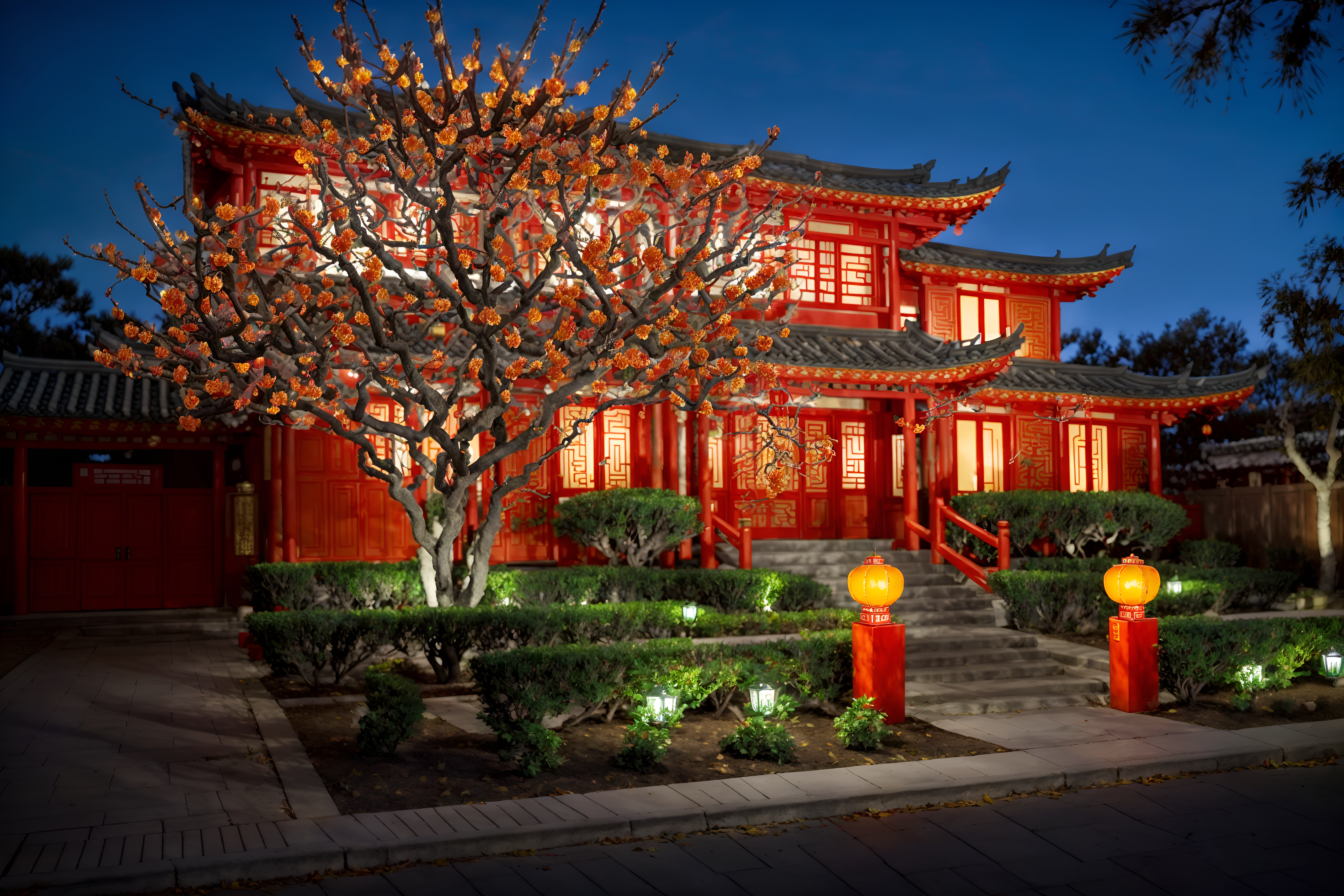 photo from pinterest of chinese new year-style exterior designed (house exterior exterior) . with red and gold candles and orange trees and zodiac calendar and vases of plum blossoms and orchids and chinese red lanterns and door couplets and red and gold tassels and kumquat trees. . cinematic photo, highly detailed, cinematic lighting, ultra-detailed, ultrarealistic, photorealism, 8k. trending on pinterest. chinese new year exterior design style. masterpiece, cinematic light, ultrarealistic+, photorealistic+, 8k, raw photo, realistic, sharp focus on eyes, (symmetrical eyes), (intact eyes), hyperrealistic, highest quality, best quality, , highly detailed, masterpiece, best quality, extremely detailed 8k wallpaper, masterpiece, best quality, ultra-detailed, best shadow, detailed background, detailed face, detailed eyes, high contrast, best illumination, detailed face, dulux, caustic, dynamic angle, detailed glow. dramatic lighting. highly detailed, insanely detailed hair, symmetrical, intricate details, professionally retouched, 8k high definition. strong bokeh. award winning photo.