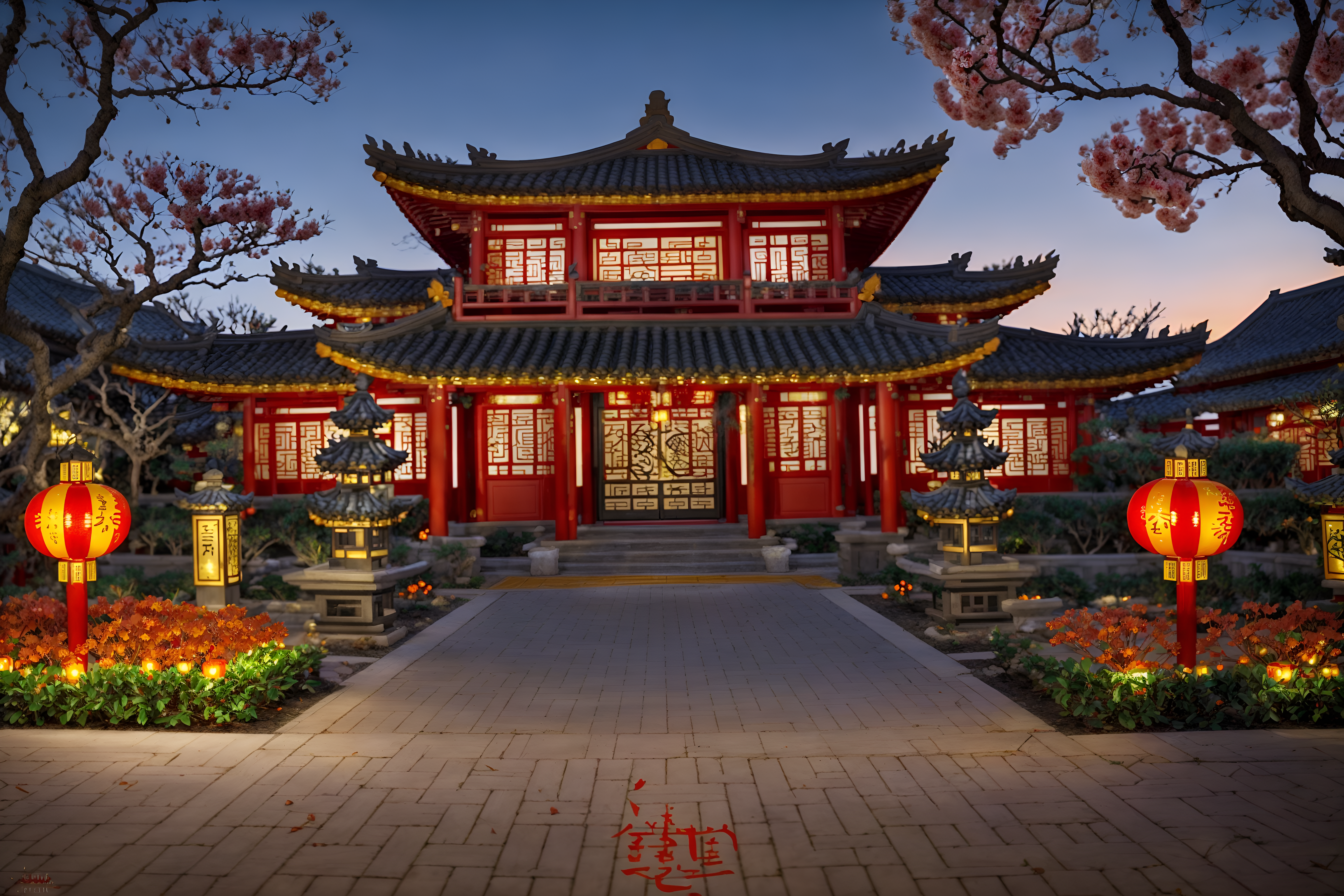 photo from pinterest of chinese new year-style exterior designed (house exterior exterior) . with red and gold candles and orange trees and zodiac calendar and vases of plum blossoms and orchids and chinese red lanterns and door couplets and red and gold tassels and kumquat trees. . cinematic photo, highly detailed, cinematic lighting, ultra-detailed, ultrarealistic, photorealism, 8k. trending on pinterest. chinese new year exterior design style. masterpiece, cinematic light, ultrarealistic+, photorealistic+, 8k, raw photo, realistic, sharp focus on eyes, (symmetrical eyes), (intact eyes), hyperrealistic, highest quality, best quality, , highly detailed, masterpiece, best quality, extremely detailed 8k wallpaper, masterpiece, best quality, ultra-detailed, best shadow, detailed background, detailed face, detailed eyes, high contrast, best illumination, detailed face, dulux, caustic, dynamic angle, detailed glow. dramatic lighting. highly detailed, insanely detailed hair, symmetrical, intricate details, professionally retouched, 8k high definition. strong bokeh. award winning photo.