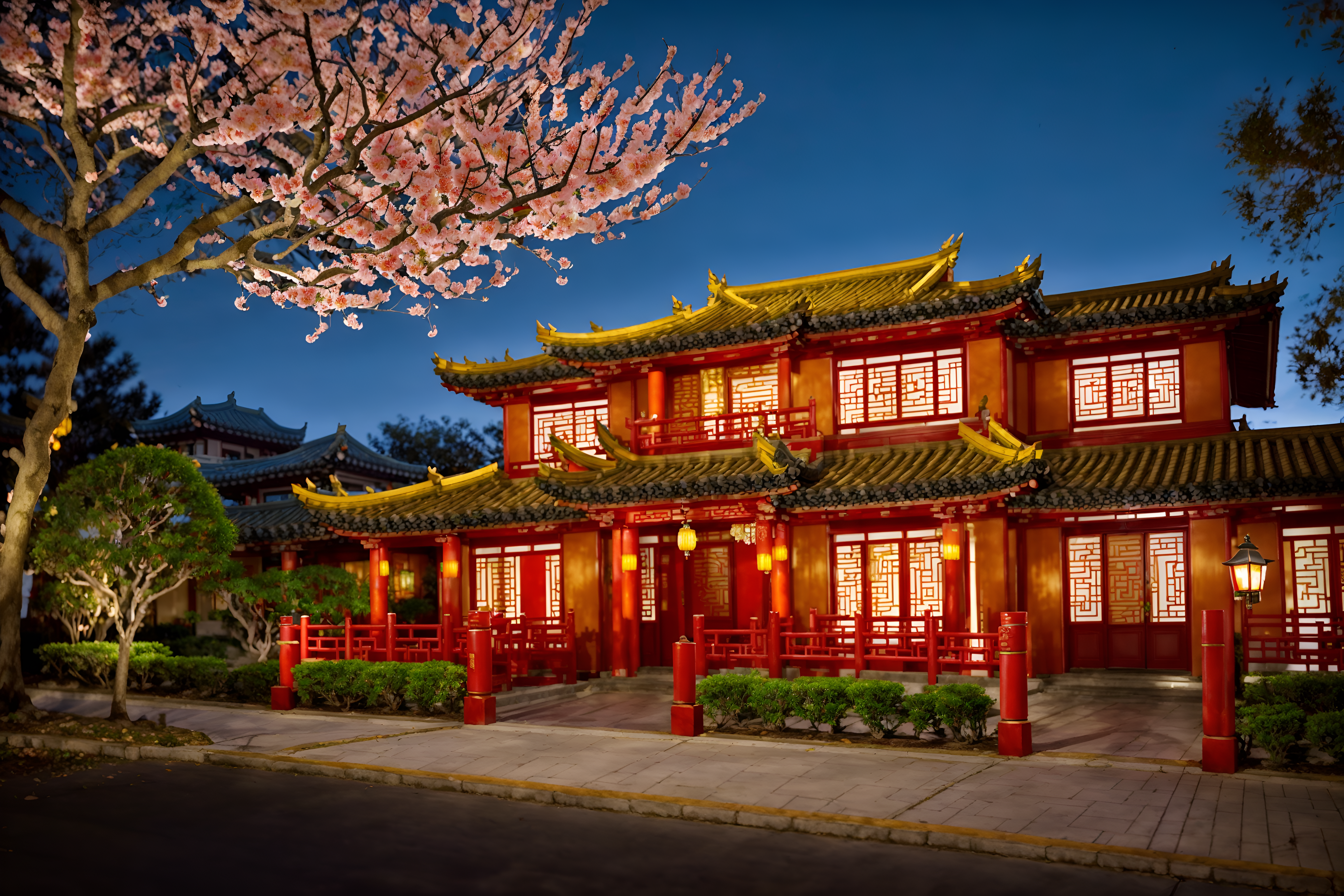 photo from pinterest of chinese new year-style exterior designed (house exterior exterior) . with red and gold candles and orange trees and zodiac calendar and vases of plum blossoms and orchids and chinese red lanterns and door couplets and red and gold tassels and kumquat trees. . cinematic photo, highly detailed, cinematic lighting, ultra-detailed, ultrarealistic, photorealism, 8k. trending on pinterest. chinese new year exterior design style. masterpiece, cinematic light, ultrarealistic+, photorealistic+, 8k, raw photo, realistic, sharp focus on eyes, (symmetrical eyes), (intact eyes), hyperrealistic, highest quality, best quality, , highly detailed, masterpiece, best quality, extremely detailed 8k wallpaper, masterpiece, best quality, ultra-detailed, best shadow, detailed background, detailed face, detailed eyes, high contrast, best illumination, detailed face, dulux, caustic, dynamic angle, detailed glow. dramatic lighting. highly detailed, insanely detailed hair, symmetrical, intricate details, professionally retouched, 8k high definition. strong bokeh. award winning photo.