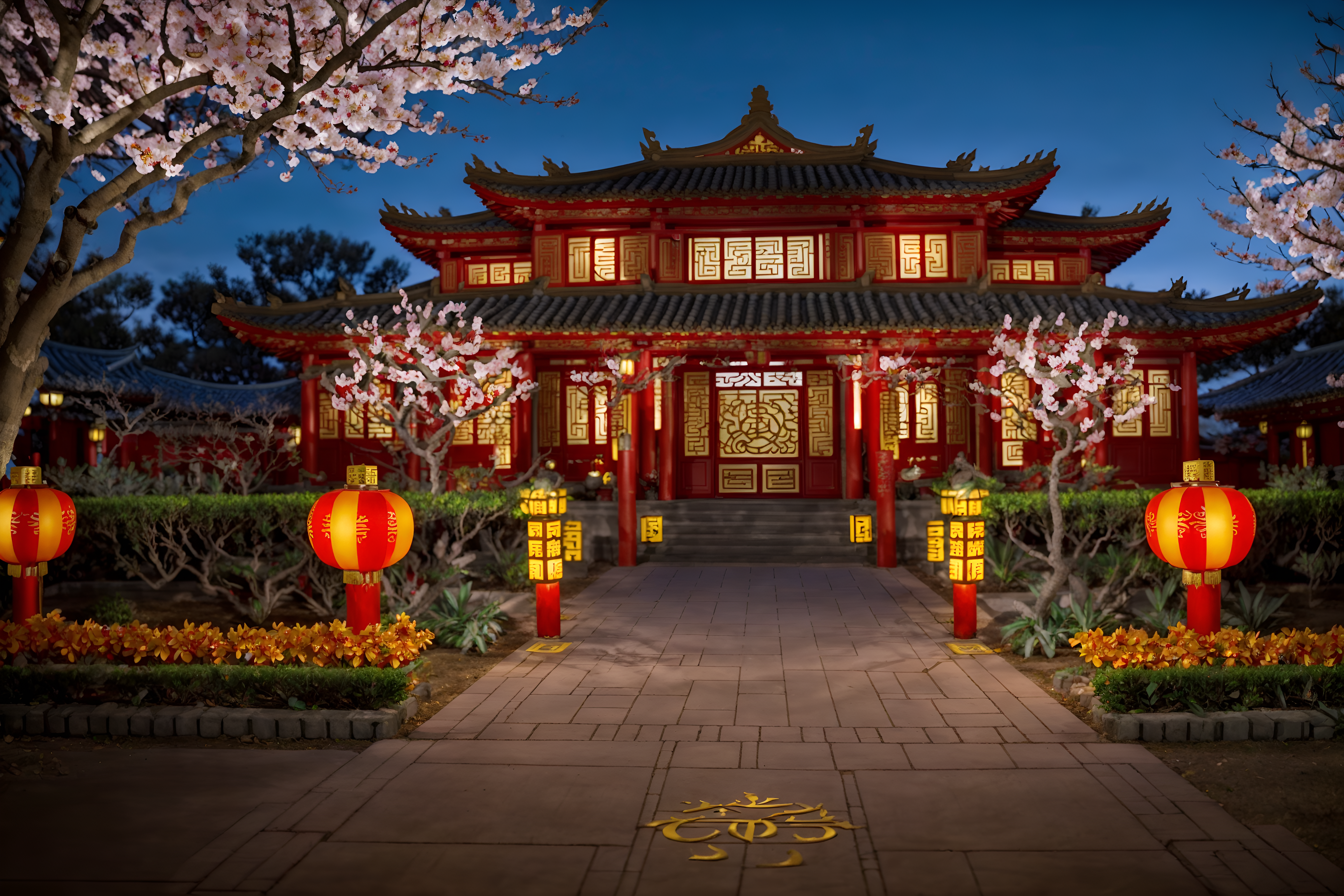 photo from pinterest of chinese new year-style exterior designed (house exterior exterior) . with red and gold candles and orange trees and zodiac calendar and vases of plum blossoms and orchids and chinese red lanterns and door couplets and red and gold tassels and kumquat trees. . cinematic photo, highly detailed, cinematic lighting, ultra-detailed, ultrarealistic, photorealism, 8k. trending on pinterest. chinese new year exterior design style. masterpiece, cinematic light, ultrarealistic+, photorealistic+, 8k, raw photo, realistic, sharp focus on eyes, (symmetrical eyes), (intact eyes), hyperrealistic, highest quality, best quality, , highly detailed, masterpiece, best quality, extremely detailed 8k wallpaper, masterpiece, best quality, ultra-detailed, best shadow, detailed background, detailed face, detailed eyes, high contrast, best illumination, detailed face, dulux, caustic, dynamic angle, detailed glow. dramatic lighting. highly detailed, insanely detailed hair, symmetrical, intricate details, professionally retouched, 8k high definition. strong bokeh. award winning photo.