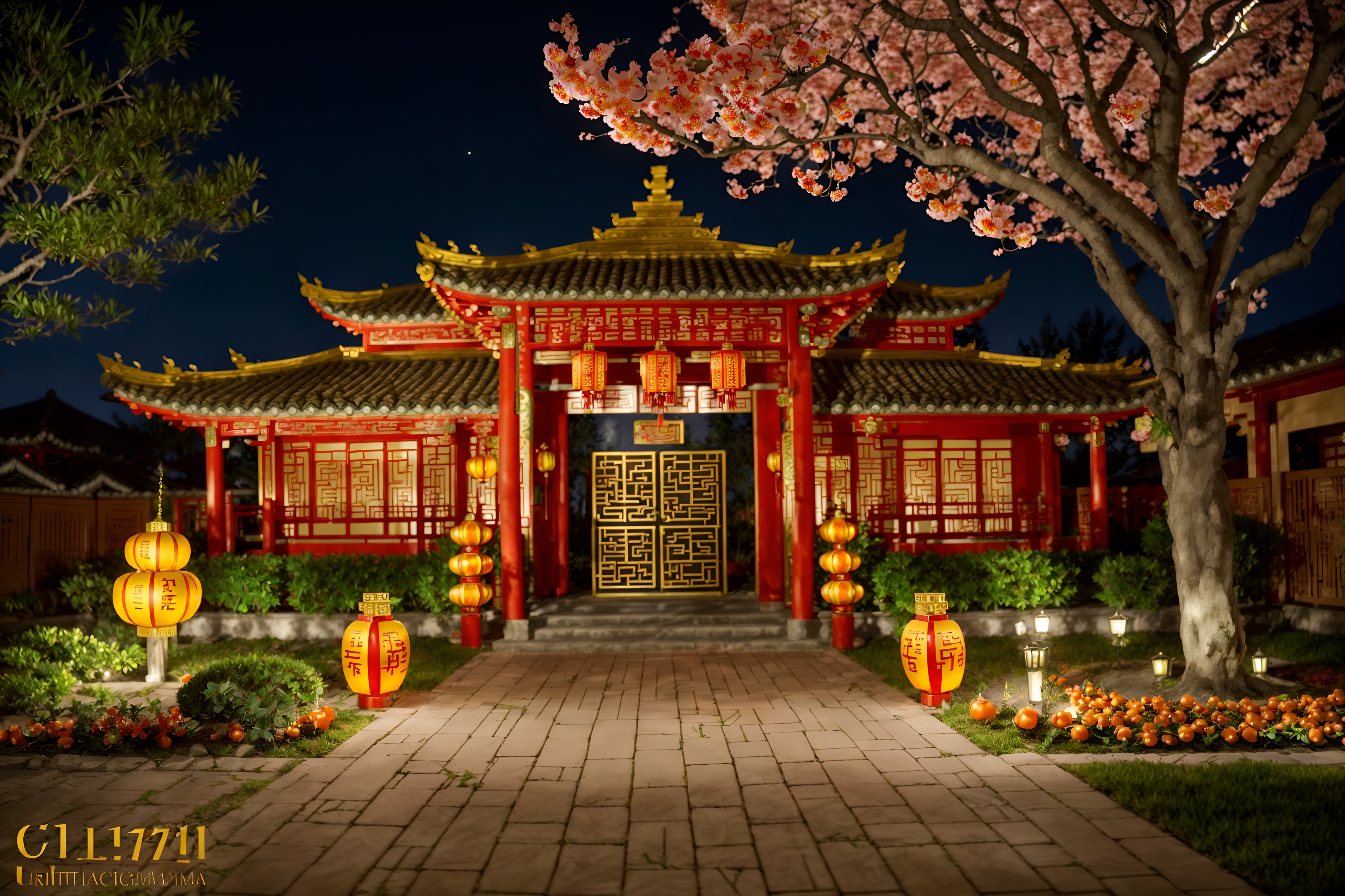 photo from pinterest of chinese new year-style exterior designed (house exterior exterior) . with red and gold candles and orange trees and zodiac calendar and vases of plum blossoms and orchids and chinese red lanterns and door couplets and red and gold tassels and kumquat trees. . cinematic photo, highly detailed, cinematic lighting, ultra-detailed, ultrarealistic, photorealism, 8k. trending on pinterest. chinese new year exterior design style. masterpiece, cinematic light, ultrarealistic+, photorealistic+, 8k, raw photo, realistic, sharp focus on eyes, (symmetrical eyes), (intact eyes), hyperrealistic, highest quality, best quality, , highly detailed, masterpiece, best quality, extremely detailed 8k wallpaper, masterpiece, best quality, ultra-detailed, best shadow, detailed background, detailed face, detailed eyes, high contrast, best illumination, detailed face, dulux, caustic, dynamic angle, detailed glow. dramatic lighting. highly detailed, insanely detailed hair, symmetrical, intricate details, professionally retouched, 8k high definition. strong bokeh. award winning photo.