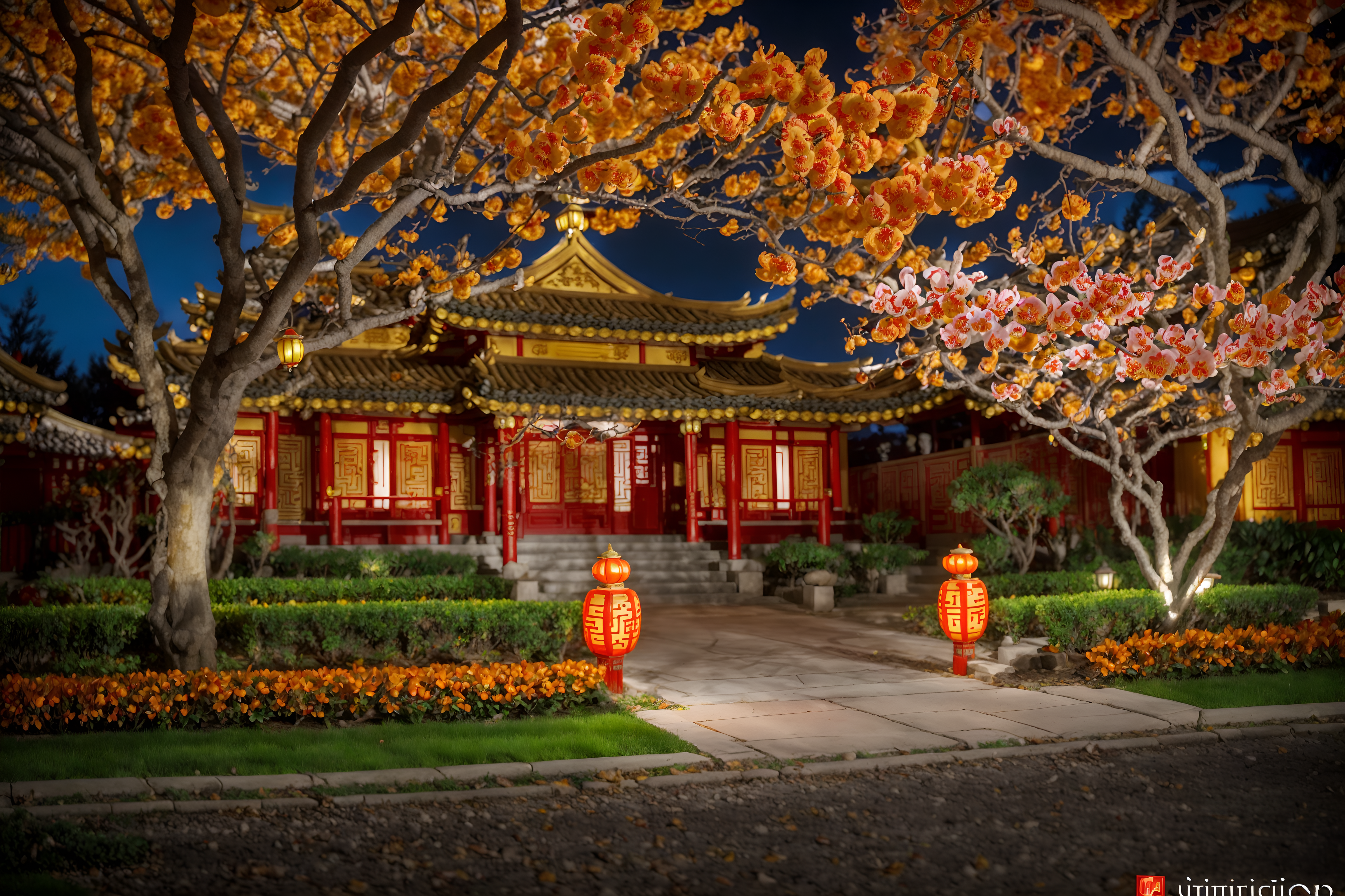 photo from pinterest of chinese new year-style exterior designed (house exterior exterior) . with red and gold candles and orange trees and zodiac calendar and vases of plum blossoms and orchids and chinese red lanterns and door couplets and red and gold tassels and kumquat trees. . cinematic photo, highly detailed, cinematic lighting, ultra-detailed, ultrarealistic, photorealism, 8k. trending on pinterest. chinese new year exterior design style. masterpiece, cinematic light, ultrarealistic+, photorealistic+, 8k, raw photo, realistic, sharp focus on eyes, (symmetrical eyes), (intact eyes), hyperrealistic, highest quality, best quality, , highly detailed, masterpiece, best quality, extremely detailed 8k wallpaper, masterpiece, best quality, ultra-detailed, best shadow, detailed background, detailed face, detailed eyes, high contrast, best illumination, detailed face, dulux, caustic, dynamic angle, detailed glow. dramatic lighting. highly detailed, insanely detailed hair, symmetrical, intricate details, professionally retouched, 8k high definition. strong bokeh. award winning photo.