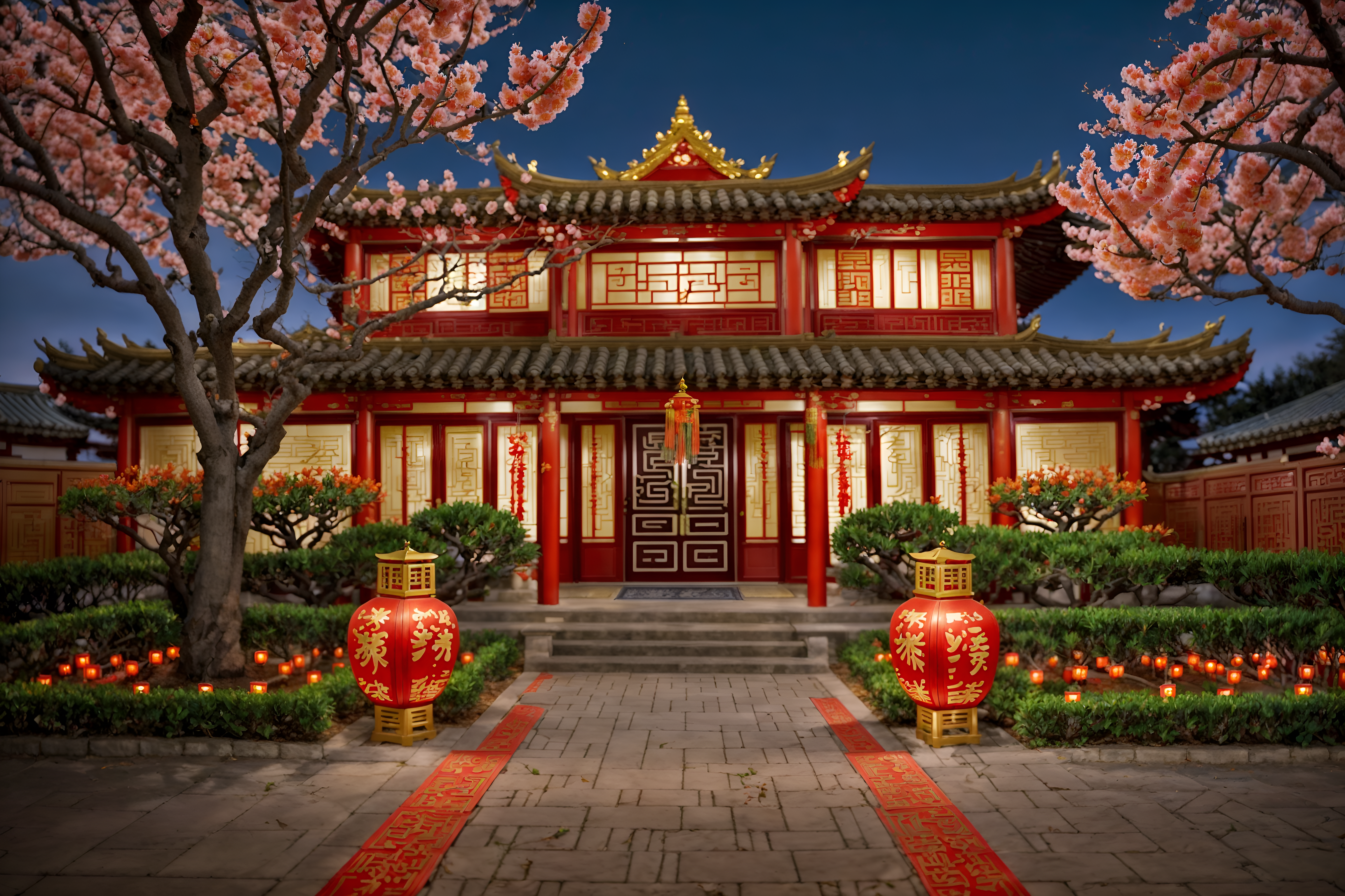 photo from pinterest of chinese new year-style exterior designed (house exterior exterior) . with red and gold candles and orange trees and zodiac calendar and vases of plum blossoms and orchids and chinese red lanterns and door couplets and red and gold tassels and kumquat trees. . cinematic photo, highly detailed, cinematic lighting, ultra-detailed, ultrarealistic, photorealism, 8k. trending on pinterest. chinese new year exterior design style. masterpiece, cinematic light, ultrarealistic+, photorealistic+, 8k, raw photo, realistic, sharp focus on eyes, (symmetrical eyes), (intact eyes), hyperrealistic, highest quality, best quality, , highly detailed, masterpiece, best quality, extremely detailed 8k wallpaper, masterpiece, best quality, ultra-detailed, best shadow, detailed background, detailed face, detailed eyes, high contrast, best illumination, detailed face, dulux, caustic, dynamic angle, detailed glow. dramatic lighting. highly detailed, insanely detailed hair, symmetrical, intricate details, professionally retouched, 8k high definition. strong bokeh. award winning photo.