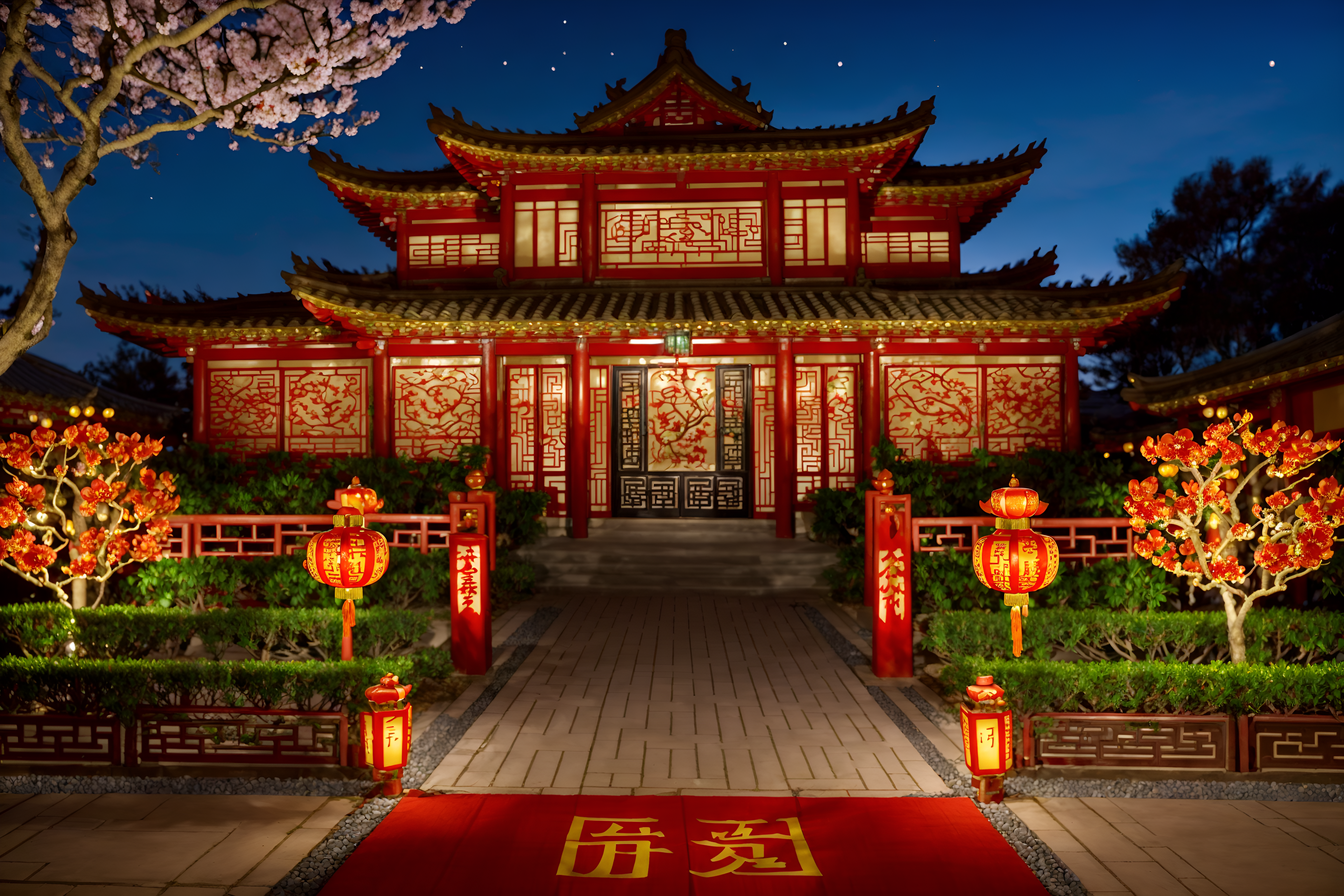photo from pinterest of chinese new year-style exterior designed (house exterior exterior) . with red and gold candles and orange trees and zodiac calendar and vases of plum blossoms and orchids and chinese red lanterns and door couplets and red and gold tassels and kumquat trees. . cinematic photo, highly detailed, cinematic lighting, ultra-detailed, ultrarealistic, photorealism, 8k. trending on pinterest. chinese new year exterior design style. masterpiece, cinematic light, ultrarealistic+, photorealistic+, 8k, raw photo, realistic, sharp focus on eyes, (symmetrical eyes), (intact eyes), hyperrealistic, highest quality, best quality, , highly detailed, masterpiece, best quality, extremely detailed 8k wallpaper, masterpiece, best quality, ultra-detailed, best shadow, detailed background, detailed face, detailed eyes, high contrast, best illumination, detailed face, dulux, caustic, dynamic angle, detailed glow. dramatic lighting. highly detailed, insanely detailed hair, symmetrical, intricate details, professionally retouched, 8k high definition. strong bokeh. award winning photo.