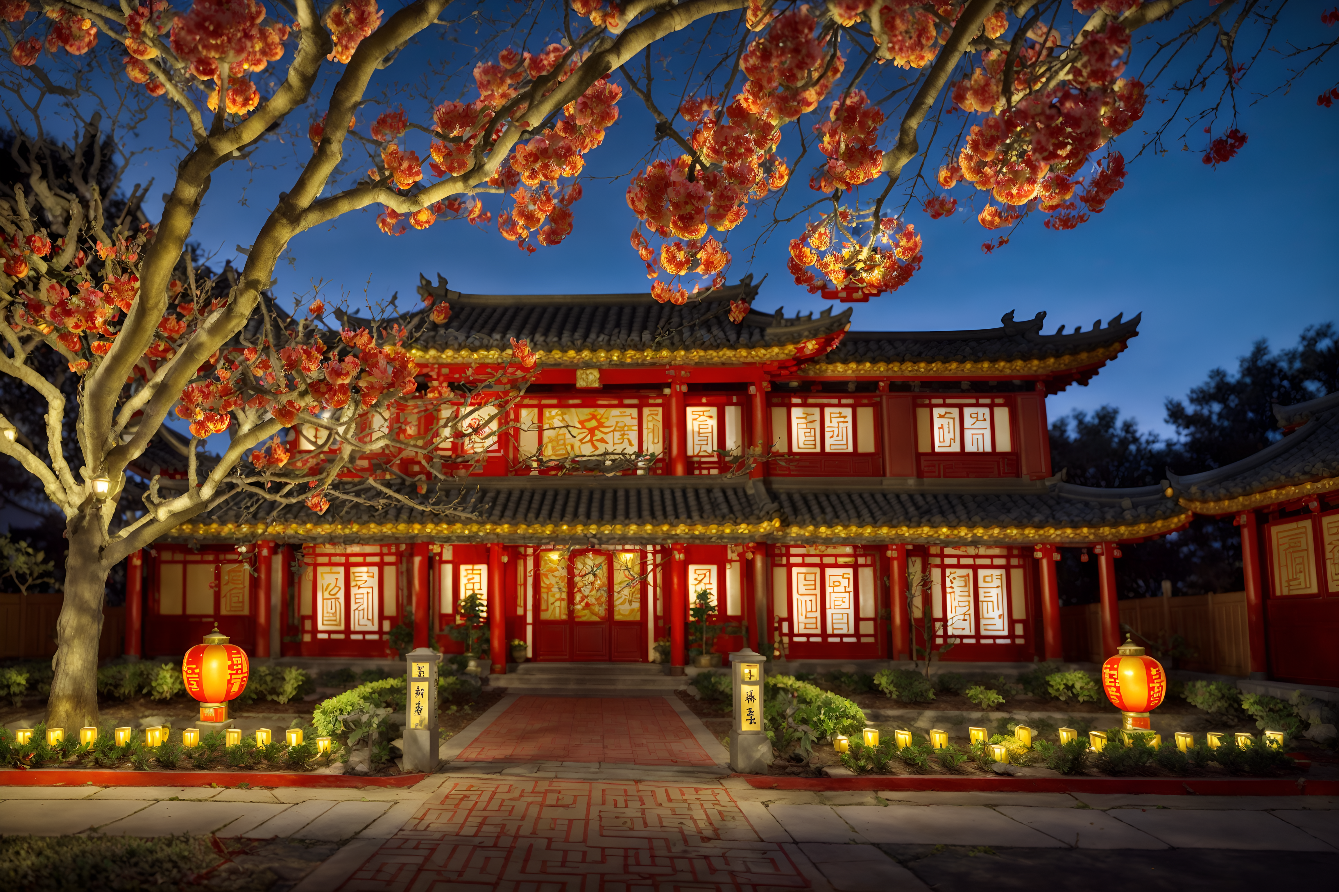photo from pinterest of chinese new year-style exterior designed (house exterior exterior) . with red and gold candles and orange trees and zodiac calendar and vases of plum blossoms and orchids and chinese red lanterns and door couplets and red and gold tassels and kumquat trees. . cinematic photo, highly detailed, cinematic lighting, ultra-detailed, ultrarealistic, photorealism, 8k. trending on pinterest. chinese new year exterior design style. masterpiece, cinematic light, ultrarealistic+, photorealistic+, 8k, raw photo, realistic, sharp focus on eyes, (symmetrical eyes), (intact eyes), hyperrealistic, highest quality, best quality, , highly detailed, masterpiece, best quality, extremely detailed 8k wallpaper, masterpiece, best quality, ultra-detailed, best shadow, detailed background, detailed face, detailed eyes, high contrast, best illumination, detailed face, dulux, caustic, dynamic angle, detailed glow. dramatic lighting. highly detailed, insanely detailed hair, symmetrical, intricate details, professionally retouched, 8k high definition. strong bokeh. award winning photo.