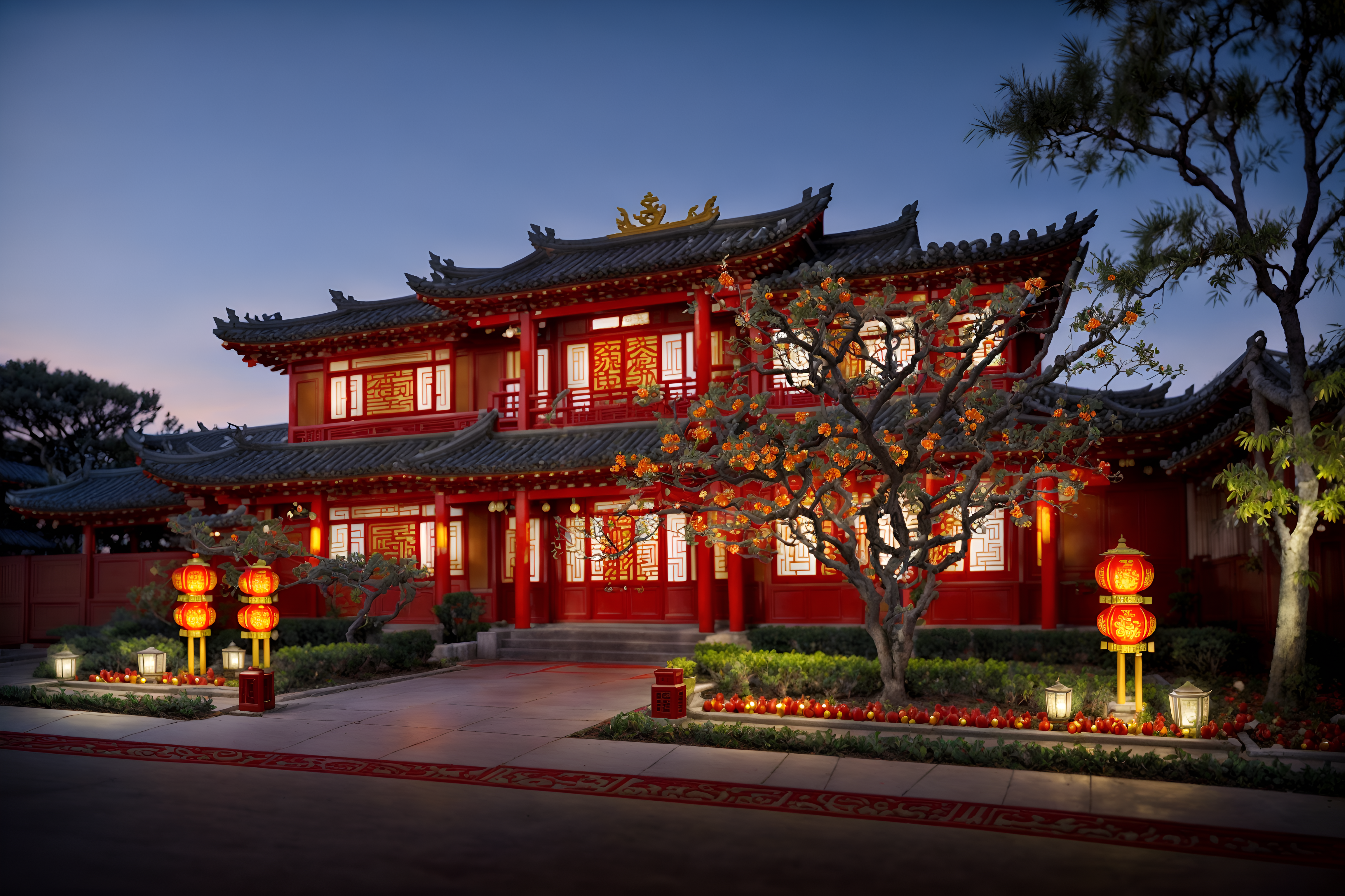 photo from pinterest of chinese new year-style exterior designed (house exterior exterior) . with red and gold candles and orange trees and zodiac calendar and vases of plum blossoms and orchids and chinese red lanterns and door couplets and red and gold tassels and kumquat trees. . cinematic photo, highly detailed, cinematic lighting, ultra-detailed, ultrarealistic, photorealism, 8k. trending on pinterest. chinese new year exterior design style. masterpiece, cinematic light, ultrarealistic+, photorealistic+, 8k, raw photo, realistic, sharp focus on eyes, (symmetrical eyes), (intact eyes), hyperrealistic, highest quality, best quality, , highly detailed, masterpiece, best quality, extremely detailed 8k wallpaper, masterpiece, best quality, ultra-detailed, best shadow, detailed background, detailed face, detailed eyes, high contrast, best illumination, detailed face, dulux, caustic, dynamic angle, detailed glow. dramatic lighting. highly detailed, insanely detailed hair, symmetrical, intricate details, professionally retouched, 8k high definition. strong bokeh. award winning photo.