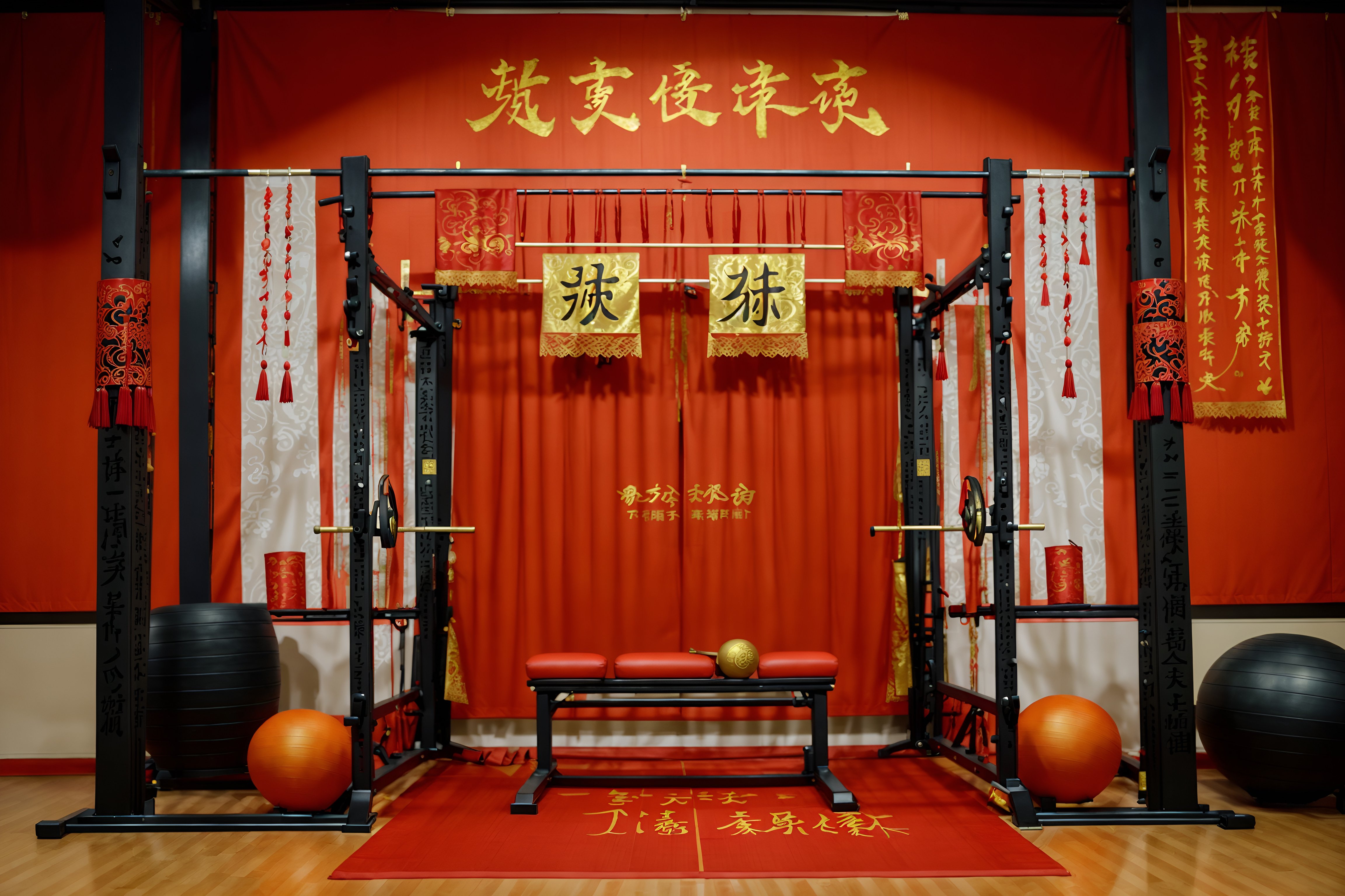 photo from pinterest of chinese new year-style interior designed (fitness gym interior) with crosstrainer and exercise bicycle and squat rack and bench press and dumbbell stand and crosstrainer. . with chinese knots and door couplets and paper cuttings and zodiac calendar and red and gold candles and orange trees and red and gold tassels and fai chun banners. . cinematic photo, highly detailed, cinematic lighting, ultra-detailed, ultrarealistic, photorealism, 8k. trending on pinterest. chinese new year interior design style. masterpiece, cinematic light, ultrarealistic+, photorealistic+, 8k, raw photo, realistic, sharp focus on eyes, (symmetrical eyes), (intact eyes), hyperrealistic, highest quality, best quality, , highly detailed, masterpiece, best quality, extremely detailed 8k wallpaper, masterpiece, best quality, ultra-detailed, best shadow, detailed background, detailed face, detailed eyes, high contrast, best illumination, detailed face, dulux, caustic, dynamic angle, detailed glow. dramatic lighting. highly detailed, insanely detailed hair, symmetrical, intricate details, professionally retouched, 8k high definition. strong bokeh. award winning photo.