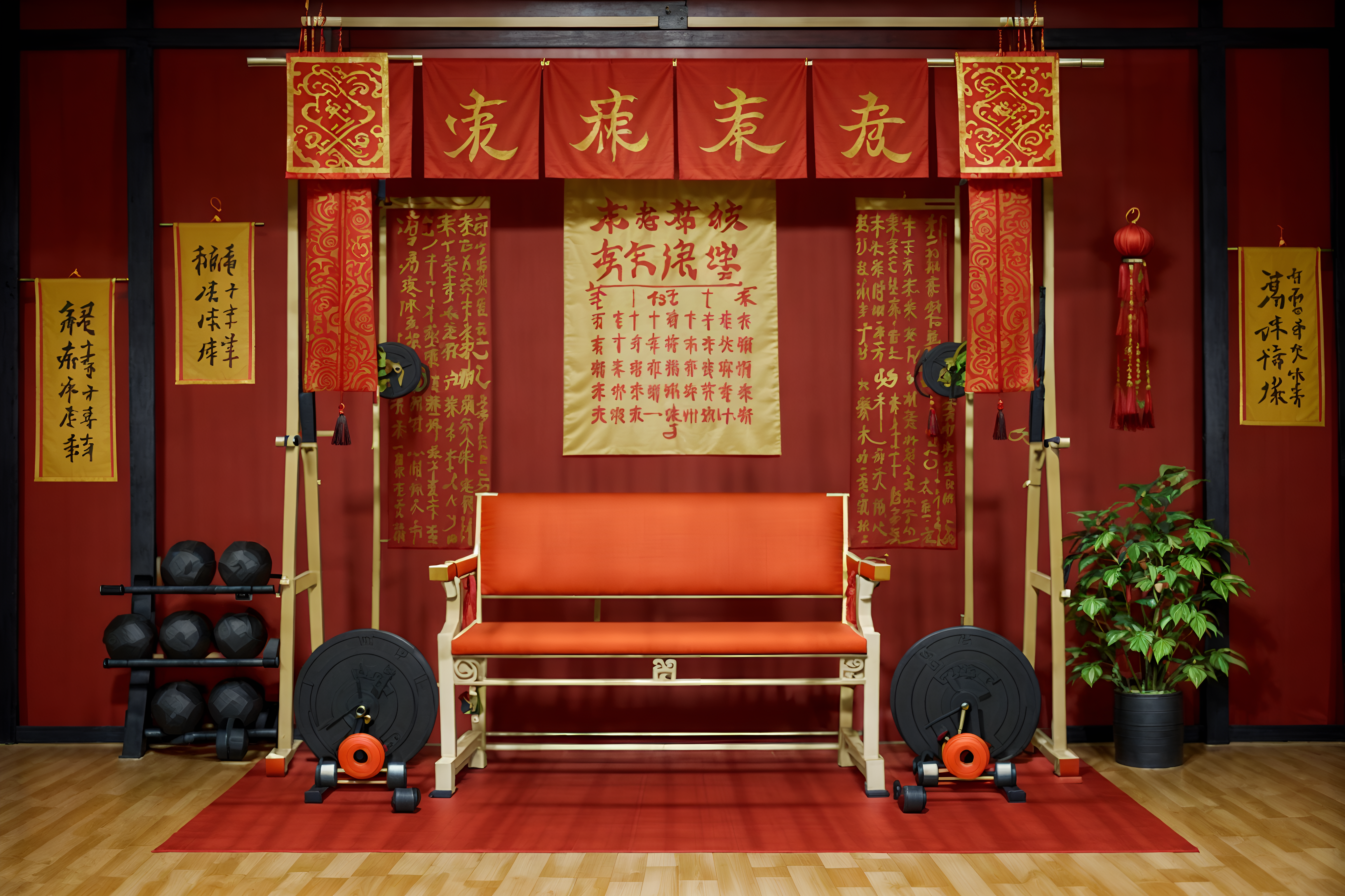 Chinese New Year gymsinterior decorate this fitness gym with chinese new year style. . . with exercise bicycle and squat rack and dumbbell stand and bench press and crosstrainer and exercise bicycle. . with paper firecrackers and red and gold candles and gold ingots and chinese knots and door couplets and money tree and paper cuttings and red and gold tassels. . .