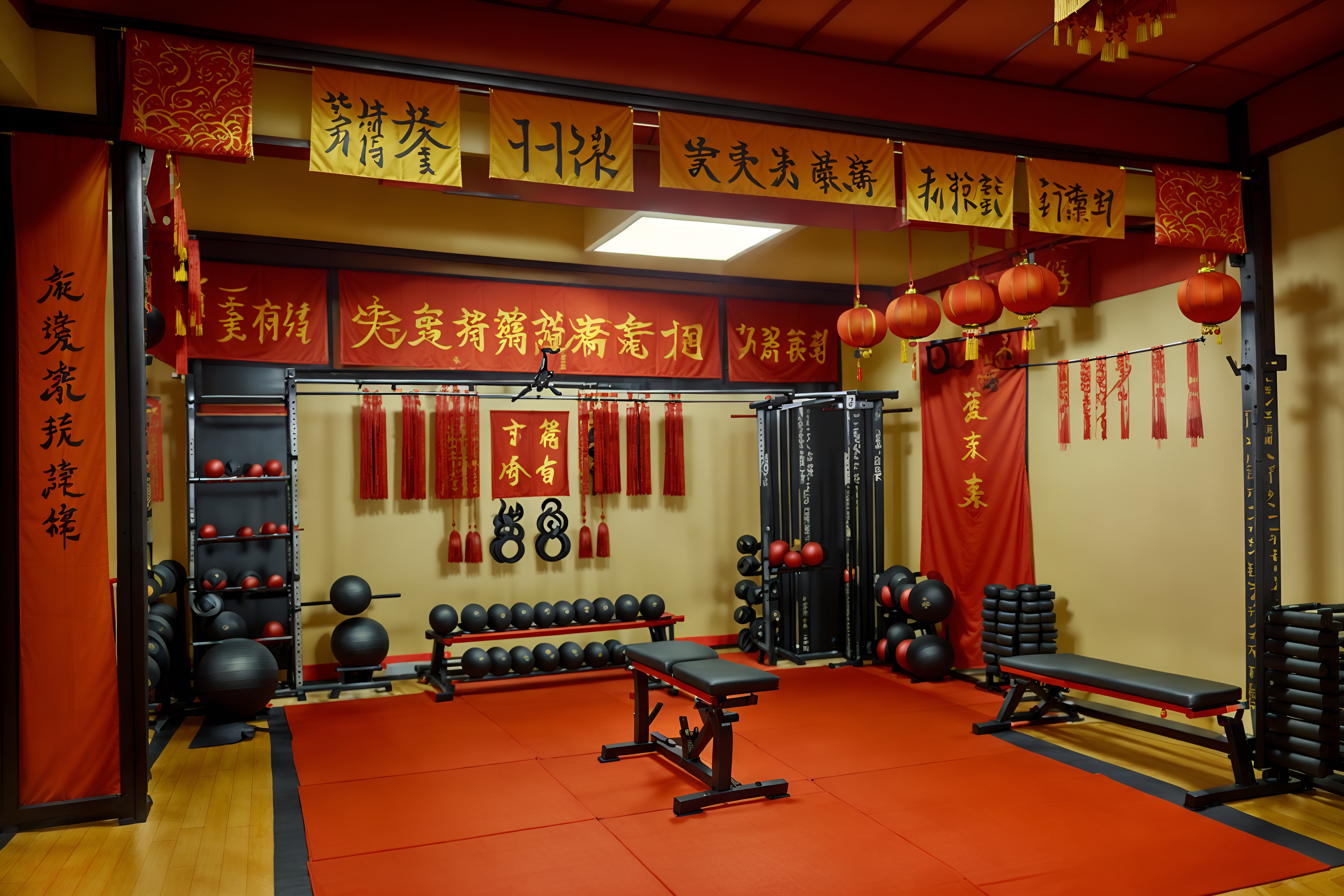 photo from pinterest of chinese new year-style interior designed (fitness gym interior) with crosstrainer and exercise bicycle and squat rack and bench press and dumbbell stand and crosstrainer. . with chinese knots and door couplets and paper cuttings and zodiac calendar and red and gold candles and orange trees and red and gold tassels and fai chun banners. . cinematic photo, highly detailed, cinematic lighting, ultra-detailed, ultrarealistic, photorealism, 8k. trending on pinterest. chinese new year interior design style. masterpiece, cinematic light, ultrarealistic+, photorealistic+, 8k, raw photo, realistic, sharp focus on eyes, (symmetrical eyes), (intact eyes), hyperrealistic, highest quality, best quality, , highly detailed, masterpiece, best quality, extremely detailed 8k wallpaper, masterpiece, best quality, ultra-detailed, best shadow, detailed background, detailed face, detailed eyes, high contrast, best illumination, detailed face, dulux, caustic, dynamic angle, detailed glow. dramatic lighting. highly detailed, insanely detailed hair, symmetrical, intricate details, professionally retouched, 8k high definition. strong bokeh. award winning photo.
