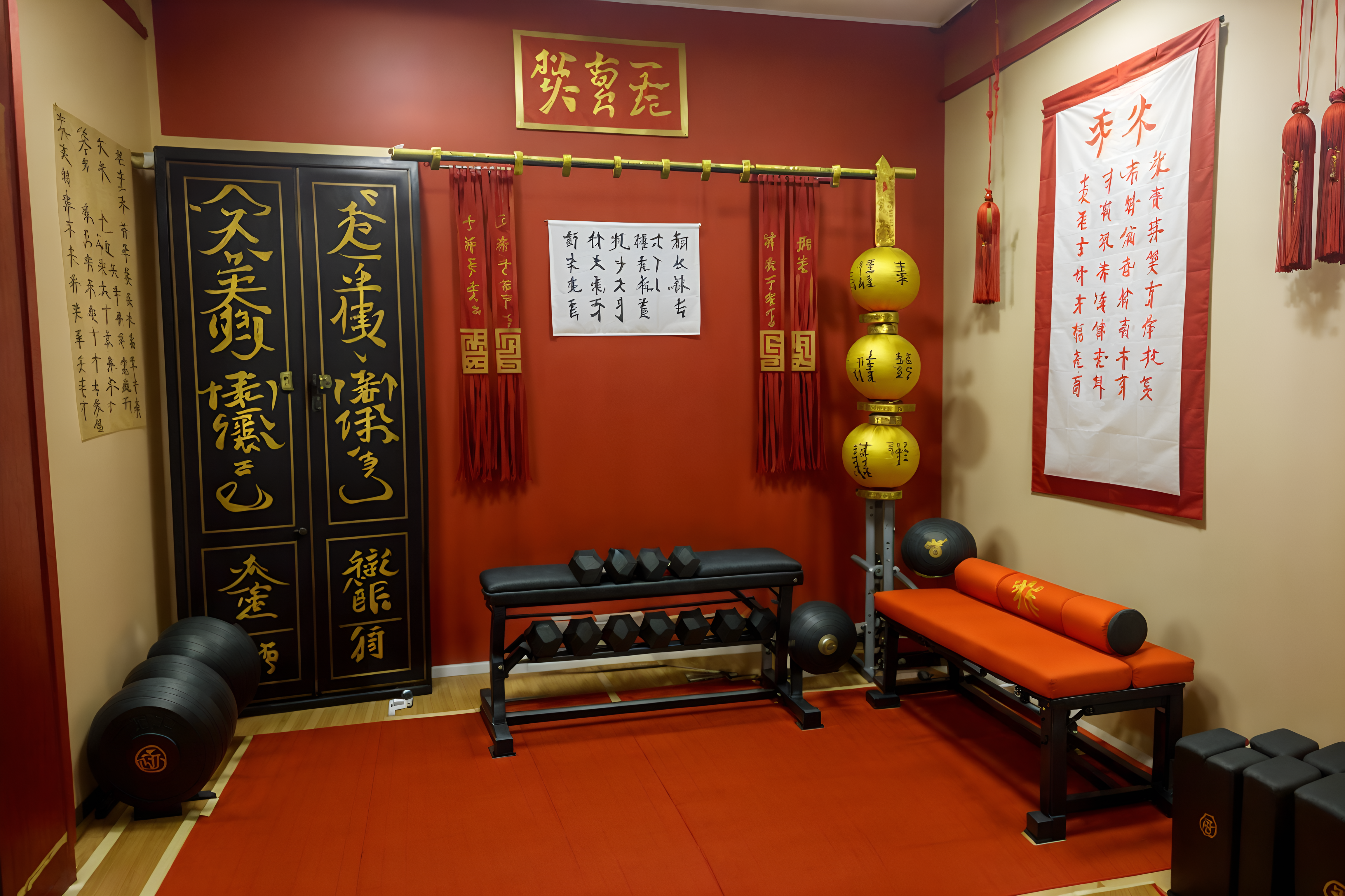 photo from pinterest of chinese new year-style interior designed (fitness gym interior) with crosstrainer and exercise bicycle and squat rack and bench press and dumbbell stand and crosstrainer. . with chinese knots and door couplets and paper cuttings and zodiac calendar and red and gold candles and orange trees and red and gold tassels and fai chun banners. . cinematic photo, highly detailed, cinematic lighting, ultra-detailed, ultrarealistic, photorealism, 8k. trending on pinterest. chinese new year interior design style. masterpiece, cinematic light, ultrarealistic+, photorealistic+, 8k, raw photo, realistic, sharp focus on eyes, (symmetrical eyes), (intact eyes), hyperrealistic, highest quality, best quality, , highly detailed, masterpiece, best quality, extremely detailed 8k wallpaper, masterpiece, best quality, ultra-detailed, best shadow, detailed background, detailed face, detailed eyes, high contrast, best illumination, detailed face, dulux, caustic, dynamic angle, detailed glow. dramatic lighting. highly detailed, insanely detailed hair, symmetrical, intricate details, professionally retouched, 8k high definition. strong bokeh. award winning photo.