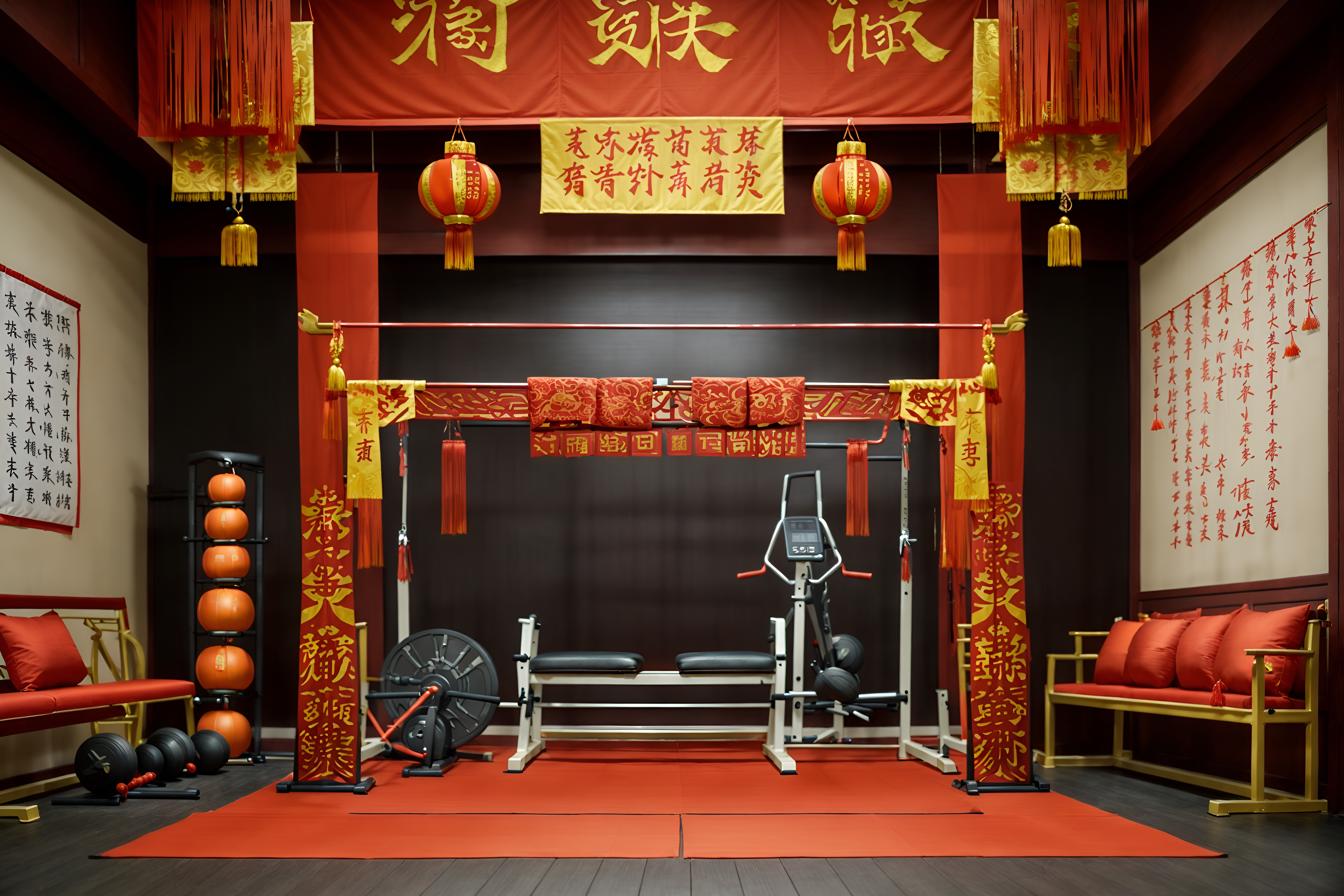 photo from pinterest of chinese new year-style interior designed (fitness gym interior) with crosstrainer and exercise bicycle and squat rack and bench press and dumbbell stand and crosstrainer. . with chinese knots and door couplets and paper cuttings and zodiac calendar and red and gold candles and orange trees and red and gold tassels and fai chun banners. . cinematic photo, highly detailed, cinematic lighting, ultra-detailed, ultrarealistic, photorealism, 8k. trending on pinterest. chinese new year interior design style. masterpiece, cinematic light, ultrarealistic+, photorealistic+, 8k, raw photo, realistic, sharp focus on eyes, (symmetrical eyes), (intact eyes), hyperrealistic, highest quality, best quality, , highly detailed, masterpiece, best quality, extremely detailed 8k wallpaper, masterpiece, best quality, ultra-detailed, best shadow, detailed background, detailed face, detailed eyes, high contrast, best illumination, detailed face, dulux, caustic, dynamic angle, detailed glow. dramatic lighting. highly detailed, insanely detailed hair, symmetrical, intricate details, professionally retouched, 8k high definition. strong bokeh. award winning photo.