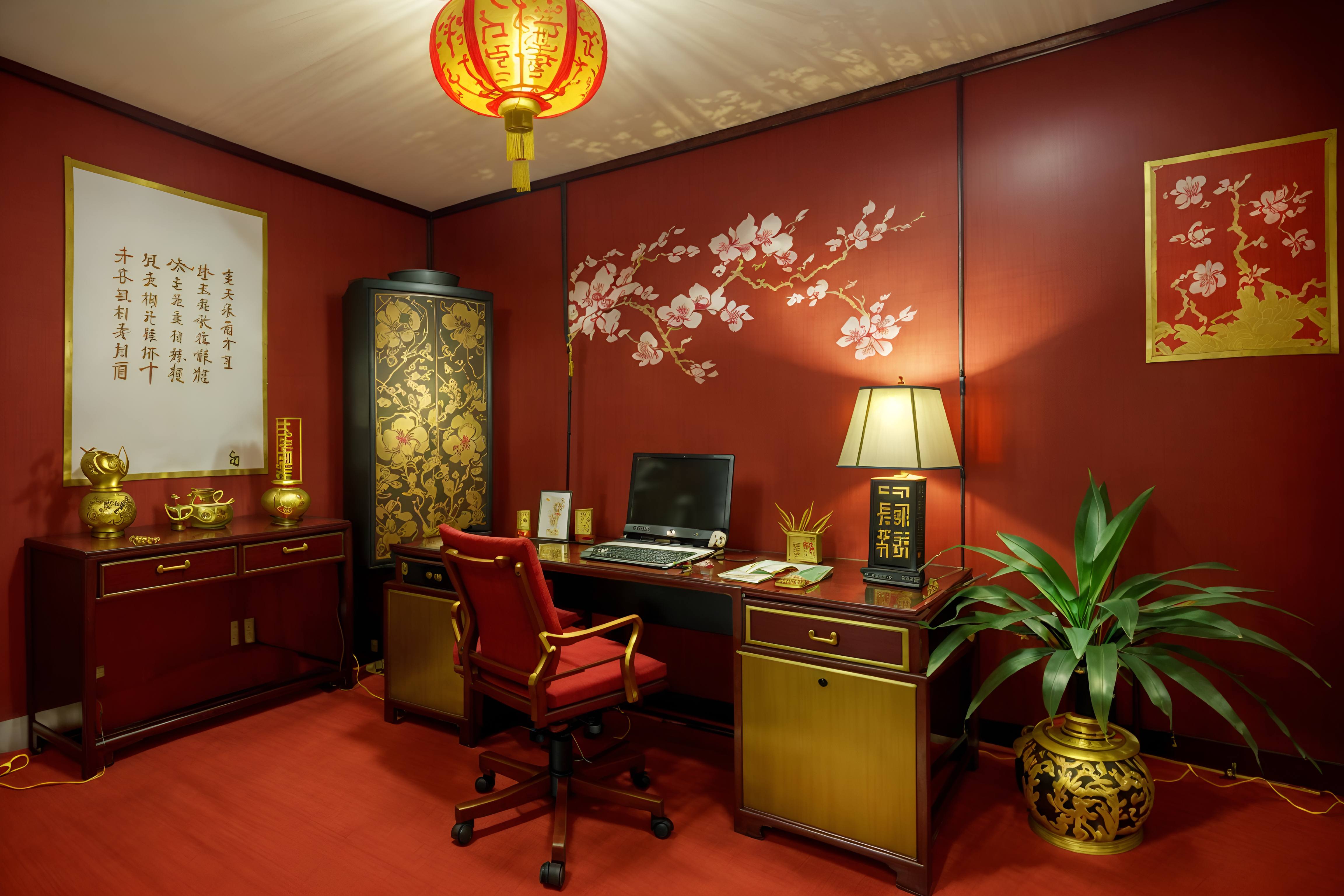 photo from pinterest of chinese new year-style interior designed (home office interior) with office chair and desk lamp and computer desk and cabinets and plant and office chair. . with fai chun banners and paper cuttings and mei hwa flowers and zodiac calendar and vases of plum blossoms and orchids and red and gold candles and gold ingots and chinese red lanterns. . cinematic photo, highly detailed, cinematic lighting, ultra-detailed, ultrarealistic, photorealism, 8k. trending on pinterest. chinese new year interior design style. masterpiece, cinematic light, ultrarealistic+, photorealistic+, 8k, raw photo, realistic, sharp focus on eyes, (symmetrical eyes), (intact eyes), hyperrealistic, highest quality, best quality, , highly detailed, masterpiece, best quality, extremely detailed 8k wallpaper, masterpiece, best quality, ultra-detailed, best shadow, detailed background, detailed face, detailed eyes, high contrast, best illumination, detailed face, dulux, caustic, dynamic angle, detailed glow. dramatic lighting. highly detailed, insanely detailed hair, symmetrical, intricate details, professionally retouched, 8k high definition. strong bokeh. award winning photo.
