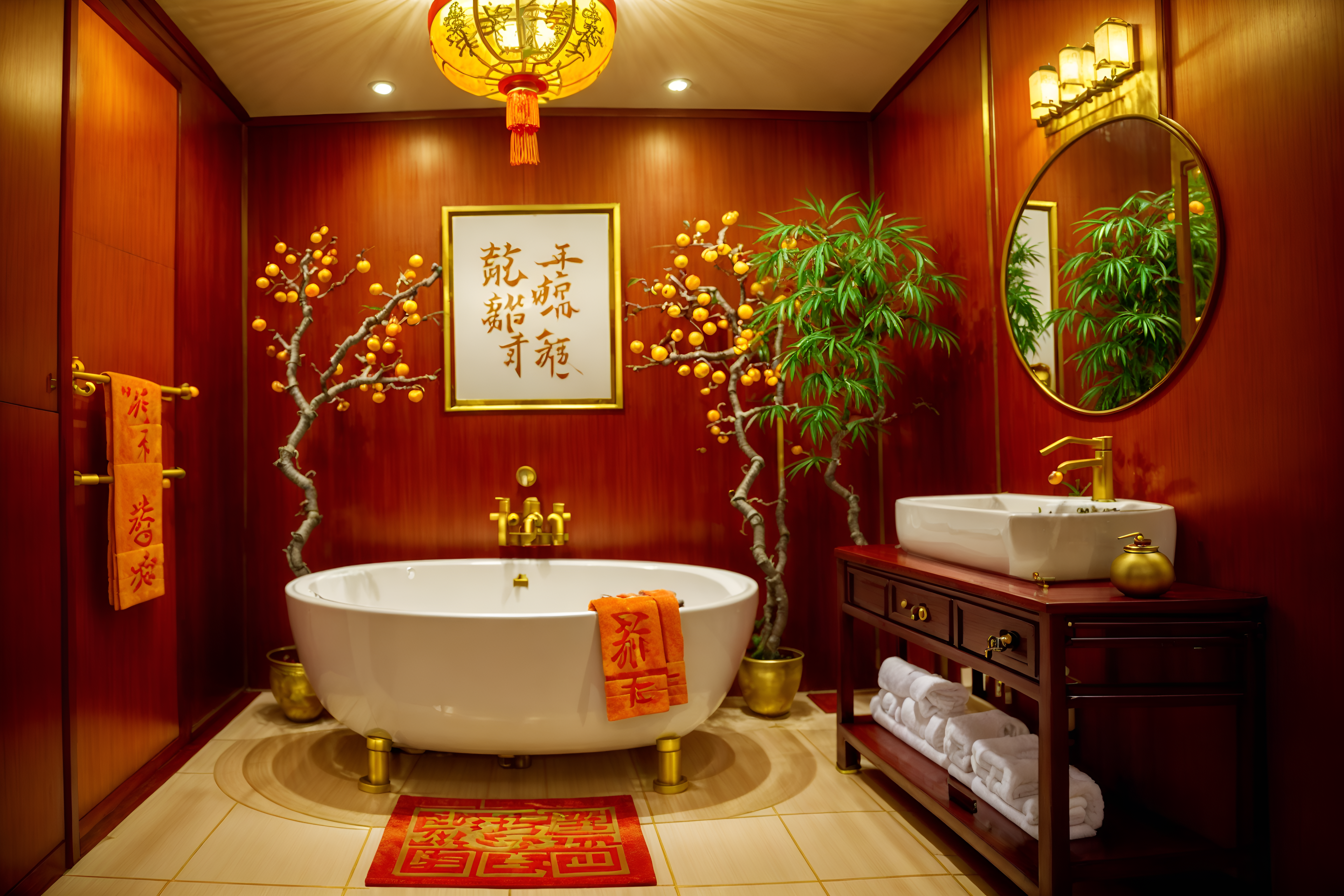 photo from pinterest of chinese new year-style interior designed (hotel bathroom interior) with waste basket and bathroom sink with faucet and shower and bathroom cabinet and bathtub and plant and toilet seat and mirror. . with red and gold candles and chinese knots and kumquat trees and zodiac calendar and vases of plum blossoms and orchids and orange trees and gold ingots and money tree. . cinematic photo, highly detailed, cinematic lighting, ultra-detailed, ultrarealistic, photorealism, 8k. trending on pinterest. chinese new year interior design style. masterpiece, cinematic light, ultrarealistic+, photorealistic+, 8k, raw photo, realistic, sharp focus on eyes, (symmetrical eyes), (intact eyes), hyperrealistic, highest quality, best quality, , highly detailed, masterpiece, best quality, extremely detailed 8k wallpaper, masterpiece, best quality, ultra-detailed, best shadow, detailed background, detailed face, detailed eyes, high contrast, best illumination, detailed face, dulux, caustic, dynamic angle, detailed glow. dramatic lighting. highly detailed, insanely detailed hair, symmetrical, intricate details, professionally retouched, 8k high definition. strong bokeh. award winning photo.