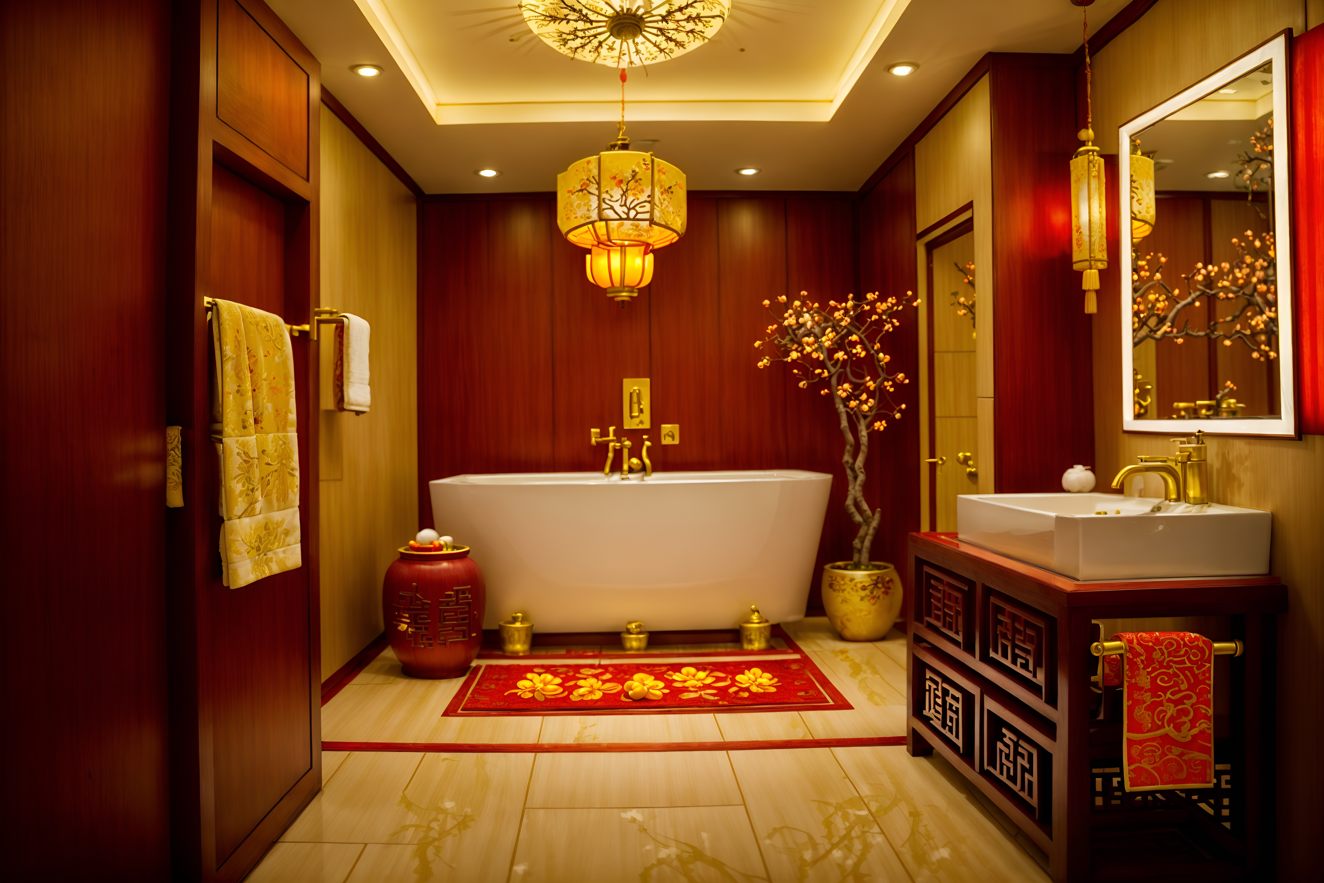 photo from pinterest of chinese new year-style interior designed (hotel bathroom interior) with waste basket and bathroom sink with faucet and shower and bathroom cabinet and bathtub and plant and toilet seat and mirror. . with red and gold candles and chinese knots and kumquat trees and zodiac calendar and vases of plum blossoms and orchids and orange trees and gold ingots and money tree. . cinematic photo, highly detailed, cinematic lighting, ultra-detailed, ultrarealistic, photorealism, 8k. trending on pinterest. chinese new year interior design style. masterpiece, cinematic light, ultrarealistic+, photorealistic+, 8k, raw photo, realistic, sharp focus on eyes, (symmetrical eyes), (intact eyes), hyperrealistic, highest quality, best quality, , highly detailed, masterpiece, best quality, extremely detailed 8k wallpaper, masterpiece, best quality, ultra-detailed, best shadow, detailed background, detailed face, detailed eyes, high contrast, best illumination, detailed face, dulux, caustic, dynamic angle, detailed glow. dramatic lighting. highly detailed, insanely detailed hair, symmetrical, intricate details, professionally retouched, 8k high definition. strong bokeh. award winning photo.