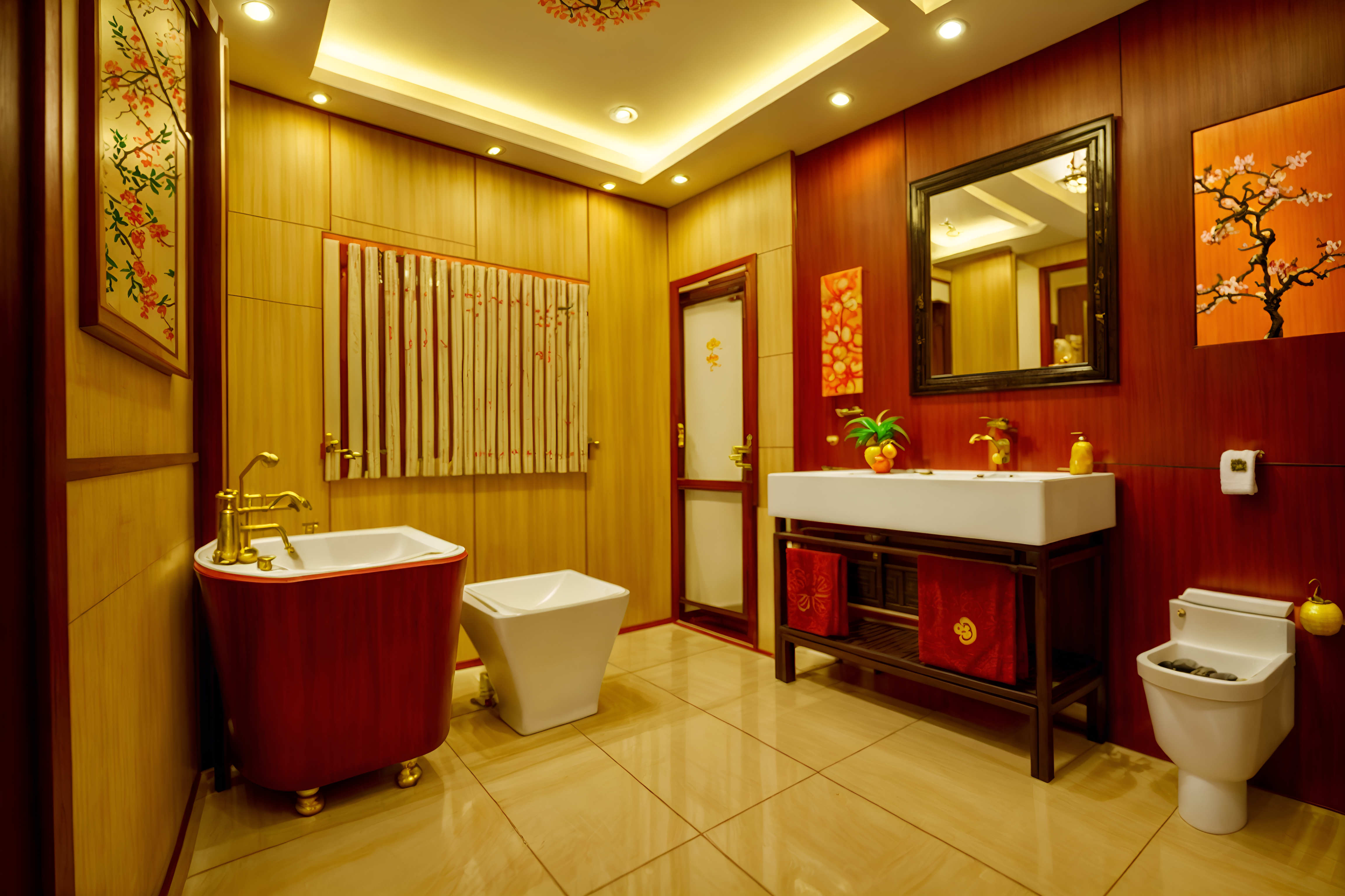 Chinese New Year hotel bathroomsinterior decorate this hotel bathroom with chinese new year style. . . with shower and bathtub and plant and bathroom cabinet and bath rail and toilet seat and bathroom sink with faucet and bath towel. . with red and gold tassels and mei hwa flowers and red and gold candles and kumquat trees and orange trees and zodiac calendar and chinese knots and paper firecrackers. . .