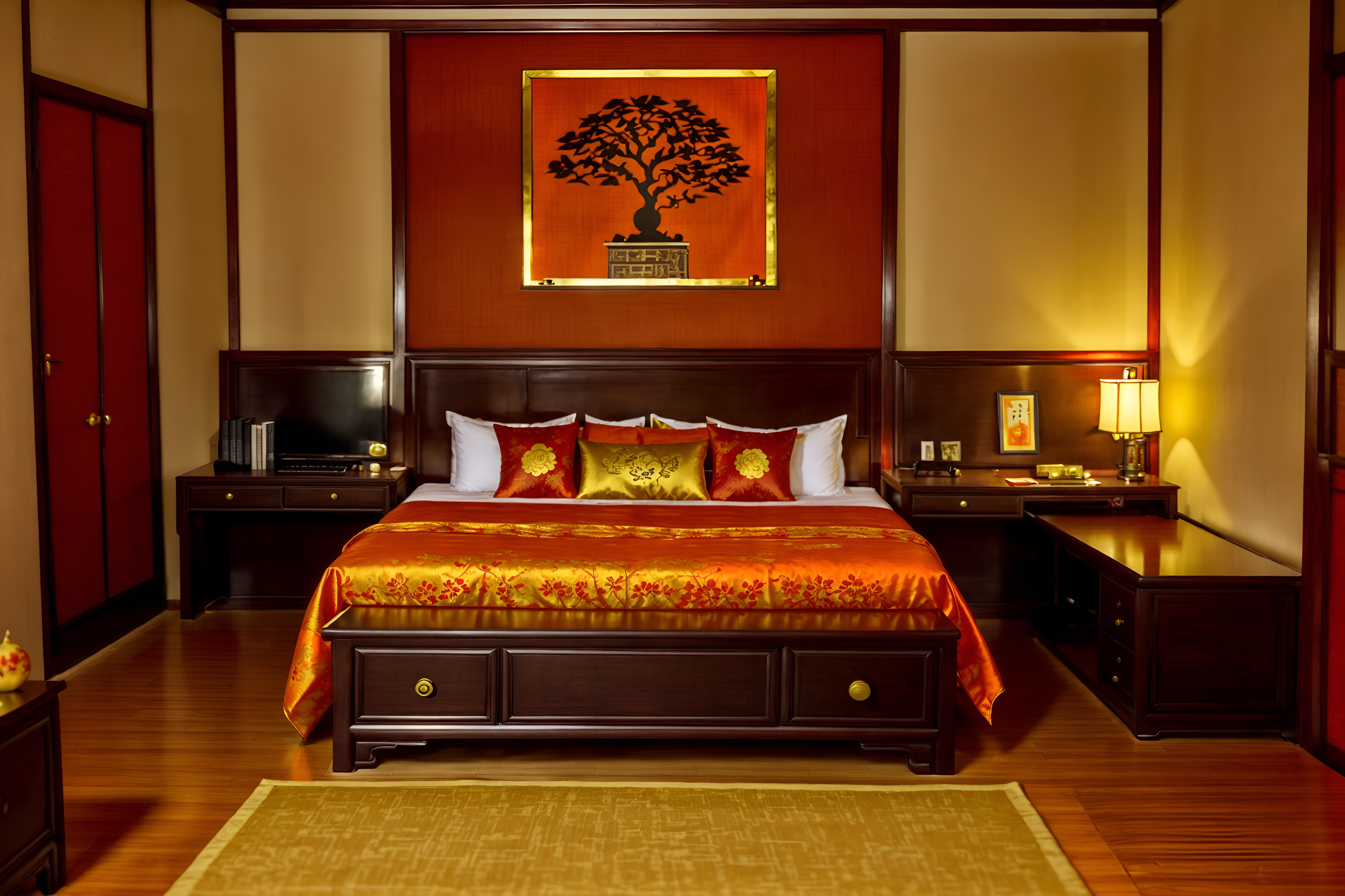 Chinese New Year hotel roomsinterior decorate this hotel room with chinese new year style. . . with plant and bedside table or night stand and working desk with desk chair and night light and bed and hotel bathroom and headboard and mirror. . with red and gold tassels and vases of plum blossoms and orchids and paper firecrackers and gold ingots and paper cuttings and mei hwa flowers and chinese red lanterns and zodiac calendar. . .