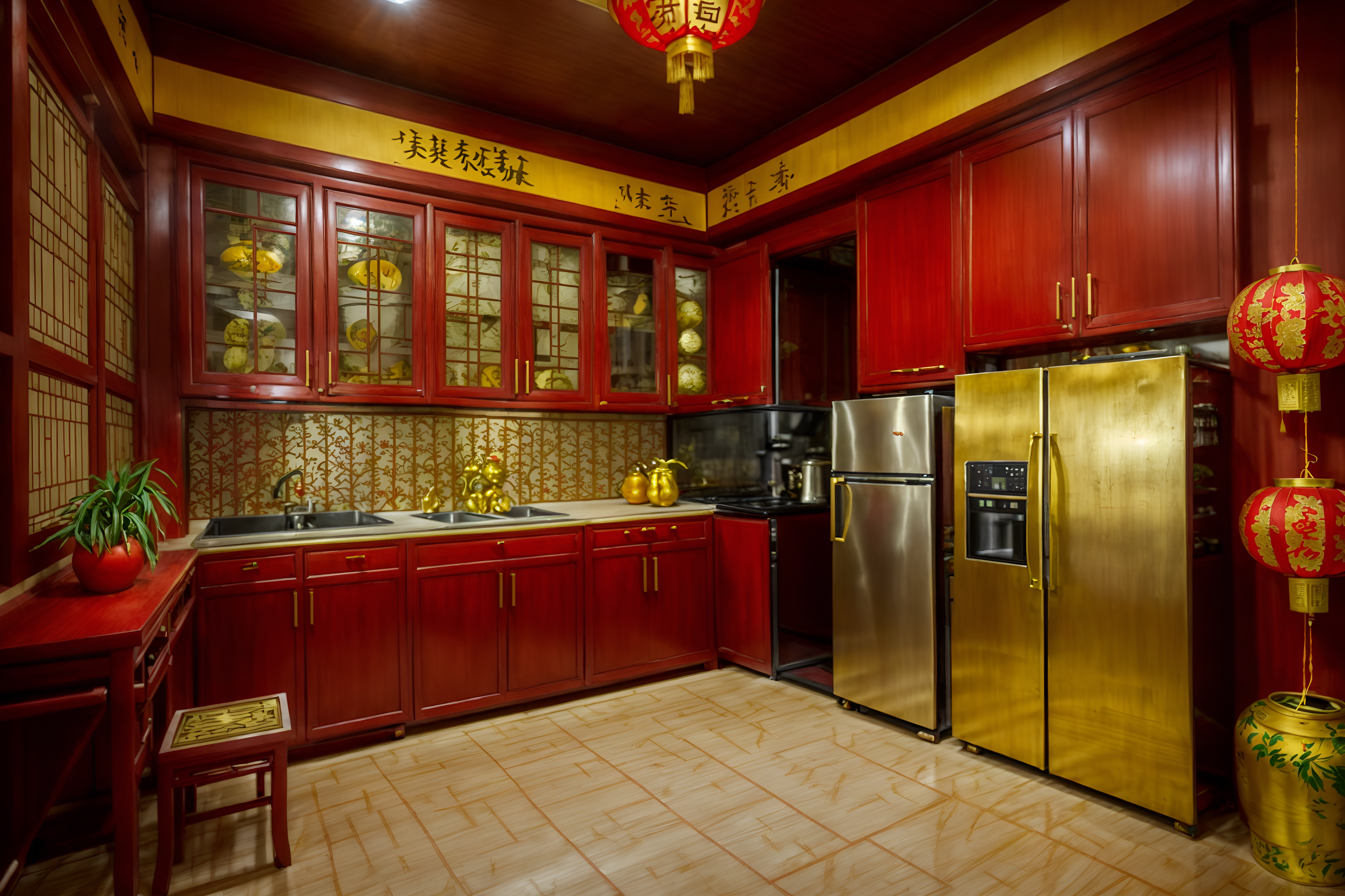 photo from pinterest of chinese new year-style interior designed (kitchen interior) with plant and kitchen cabinets and refrigerator and stove and sink and worktops and plant. . with gold ingots and kumquat trees and paper firecrackers and vases of plum blossoms and orchids and door couplets and red fabric & pillows and chinese knots and chinese red lanterns. . cinematic photo, highly detailed, cinematic lighting, ultra-detailed, ultrarealistic, photorealism, 8k. trending on pinterest. chinese new year interior design style. masterpiece, cinematic light, ultrarealistic+, photorealistic+, 8k, raw photo, realistic, sharp focus on eyes, (symmetrical eyes), (intact eyes), hyperrealistic, highest quality, best quality, , highly detailed, masterpiece, best quality, extremely detailed 8k wallpaper, masterpiece, best quality, ultra-detailed, best shadow, detailed background, detailed face, detailed eyes, high contrast, best illumination, detailed face, dulux, caustic, dynamic angle, detailed glow. dramatic lighting. highly detailed, insanely detailed hair, symmetrical, intricate details, professionally retouched, 8k high definition. strong bokeh. award winning photo.