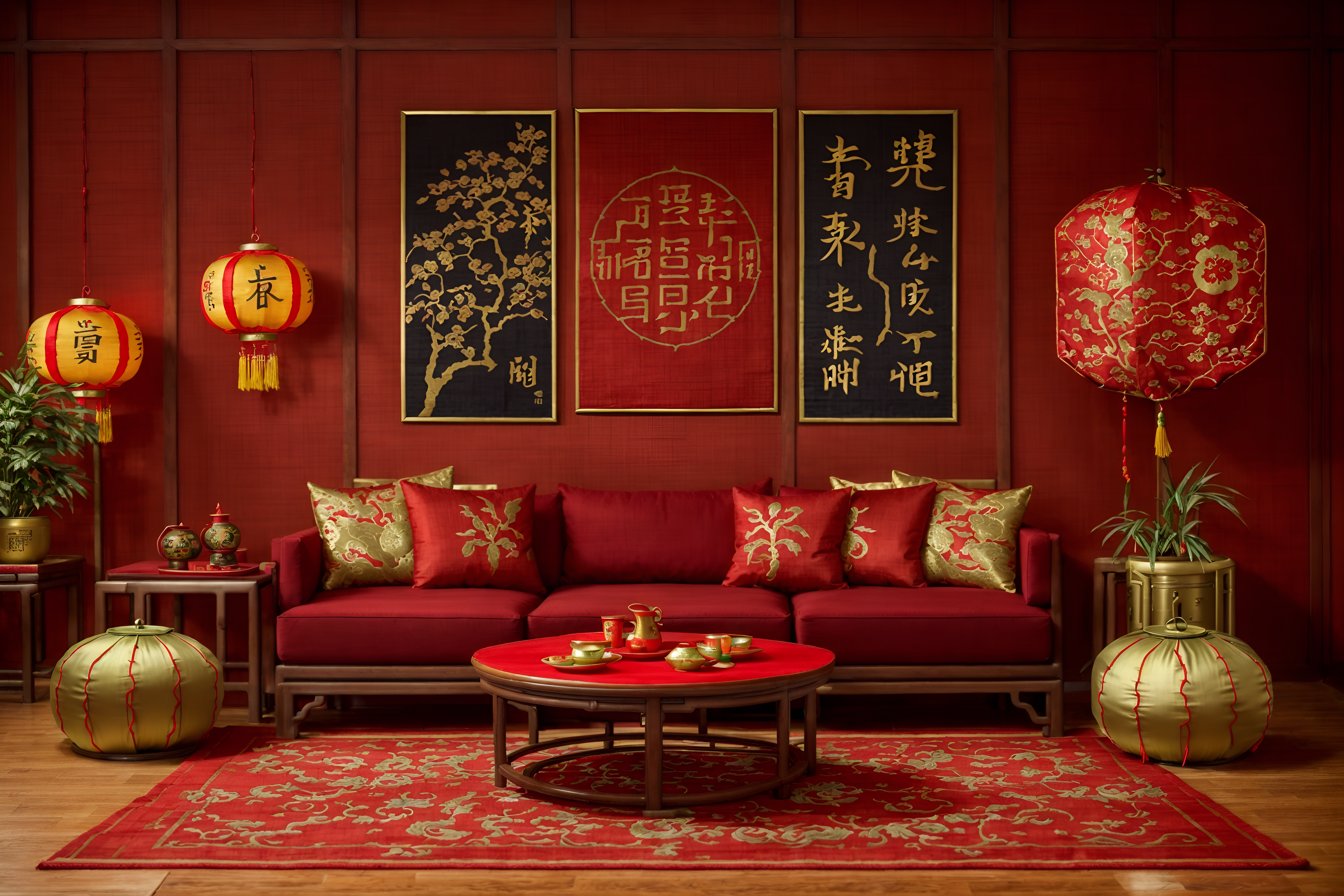 photo from pinterest of chinese new year-style interior designed (kitchen living combo interior) with televisions and refrigerator and furniture and plant and coffee tables and rug and occasional tables and chairs. . with money tree and red fabric & pillows and paper firecrackers and chinese knots and chinese red lanterns and door couplets and kumquat trees and zodiac calendar. . cinematic photo, highly detailed, cinematic lighting, ultra-detailed, ultrarealistic, photorealism, 8k. trending on pinterest. chinese new year interior design style. masterpiece, cinematic light, ultrarealistic+, photorealistic+, 8k, raw photo, realistic, sharp focus on eyes, (symmetrical eyes), (intact eyes), hyperrealistic, highest quality, best quality, , highly detailed, masterpiece, best quality, extremely detailed 8k wallpaper, masterpiece, best quality, ultra-detailed, best shadow, detailed background, detailed face, detailed eyes, high contrast, best illumination, detailed face, dulux, caustic, dynamic angle, detailed glow. dramatic lighting. highly detailed, insanely detailed hair, symmetrical, intricate details, professionally retouched, 8k high definition. strong bokeh. award winning photo.