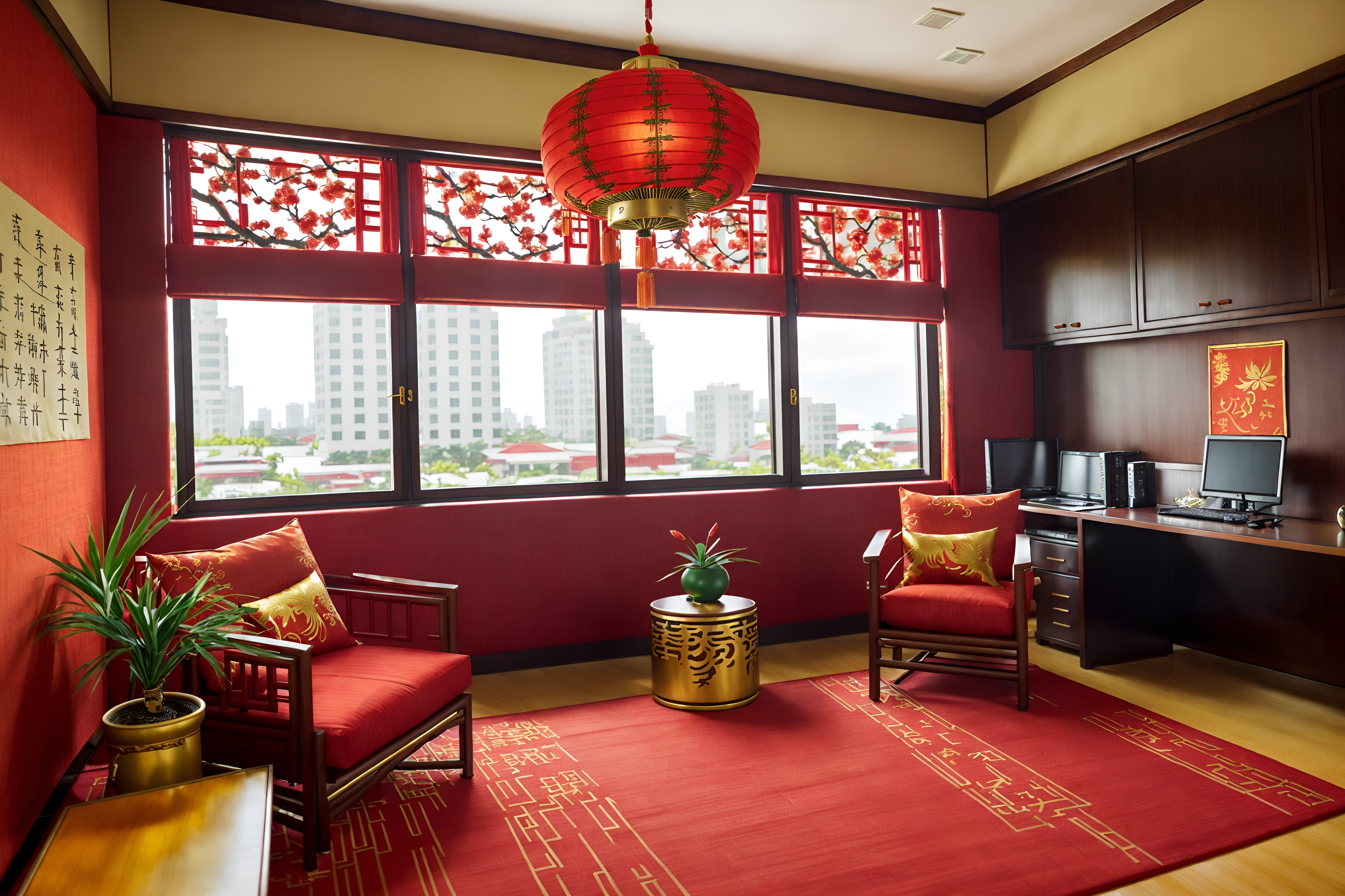 photo from pinterest of chinese new year-style interior designed (office interior) with office chairs and seating area with sofa and windows and cabinets and lounge chairs and office desks and desk lamps and computer desks. . with paper firecrackers and red and gold tassels and red fabric & pillows and red and gold candles and zodiac calendar and vases of plum blossoms and orchids and orange trees and gold ingots. . cinematic photo, highly detailed, cinematic lighting, ultra-detailed, ultrarealistic, photorealism, 8k. trending on pinterest. chinese new year interior design style. masterpiece, cinematic light, ultrarealistic+, photorealistic+, 8k, raw photo, realistic, sharp focus on eyes, (symmetrical eyes), (intact eyes), hyperrealistic, highest quality, best quality, , highly detailed, masterpiece, best quality, extremely detailed 8k wallpaper, masterpiece, best quality, ultra-detailed, best shadow, detailed background, detailed face, detailed eyes, high contrast, best illumination, detailed face, dulux, caustic, dynamic angle, detailed glow. dramatic lighting. highly detailed, insanely detailed hair, symmetrical, intricate details, professionally retouched, 8k high definition. strong bokeh. award winning photo.