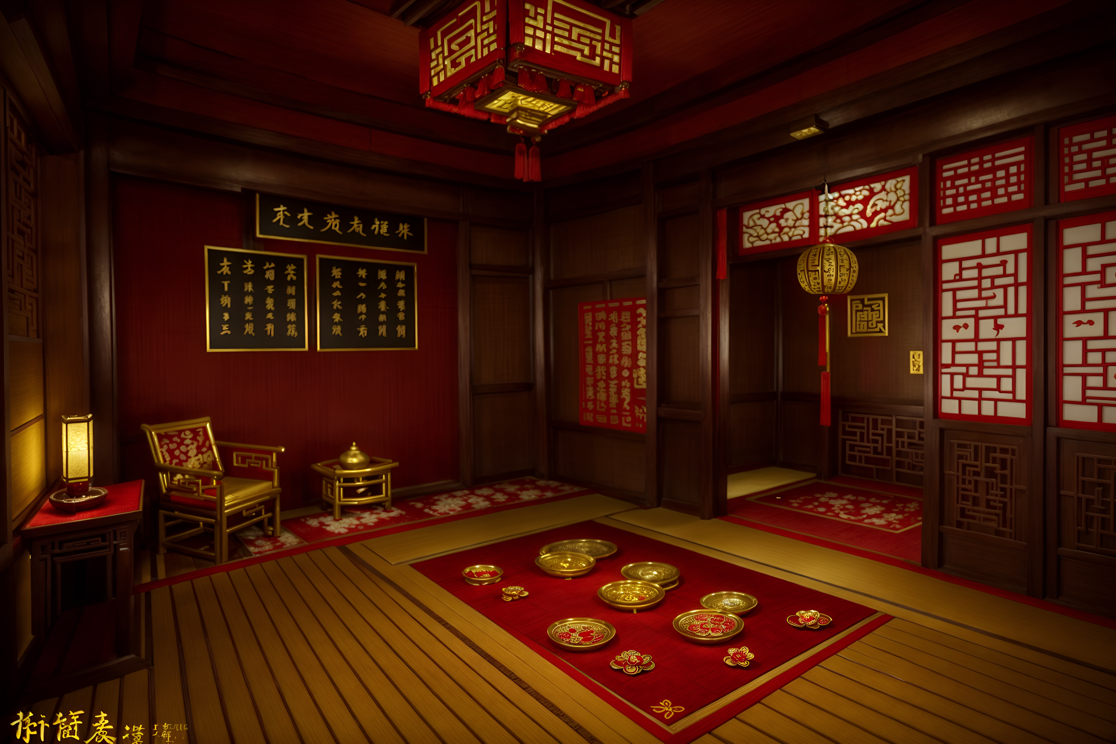 photo from pinterest of chinese new year-style interior designed (onsen interior) . with red and gold tassels and chinese knots and money tree and zodiac calendar and vases of plum blossoms and orchids and door couplets and gold ingots and red and gold candles. . cinematic photo, highly detailed, cinematic lighting, ultra-detailed, ultrarealistic, photorealism, 8k. trending on pinterest. chinese new year interior design style. masterpiece, cinematic light, ultrarealistic+, photorealistic+, 8k, raw photo, realistic, sharp focus on eyes, (symmetrical eyes), (intact eyes), hyperrealistic, highest quality, best quality, , highly detailed, masterpiece, best quality, extremely detailed 8k wallpaper, masterpiece, best quality, ultra-detailed, best shadow, detailed background, detailed face, detailed eyes, high contrast, best illumination, detailed face, dulux, caustic, dynamic angle, detailed glow. dramatic lighting. highly detailed, insanely detailed hair, symmetrical, intricate details, professionally retouched, 8k high definition. strong bokeh. award winning photo.