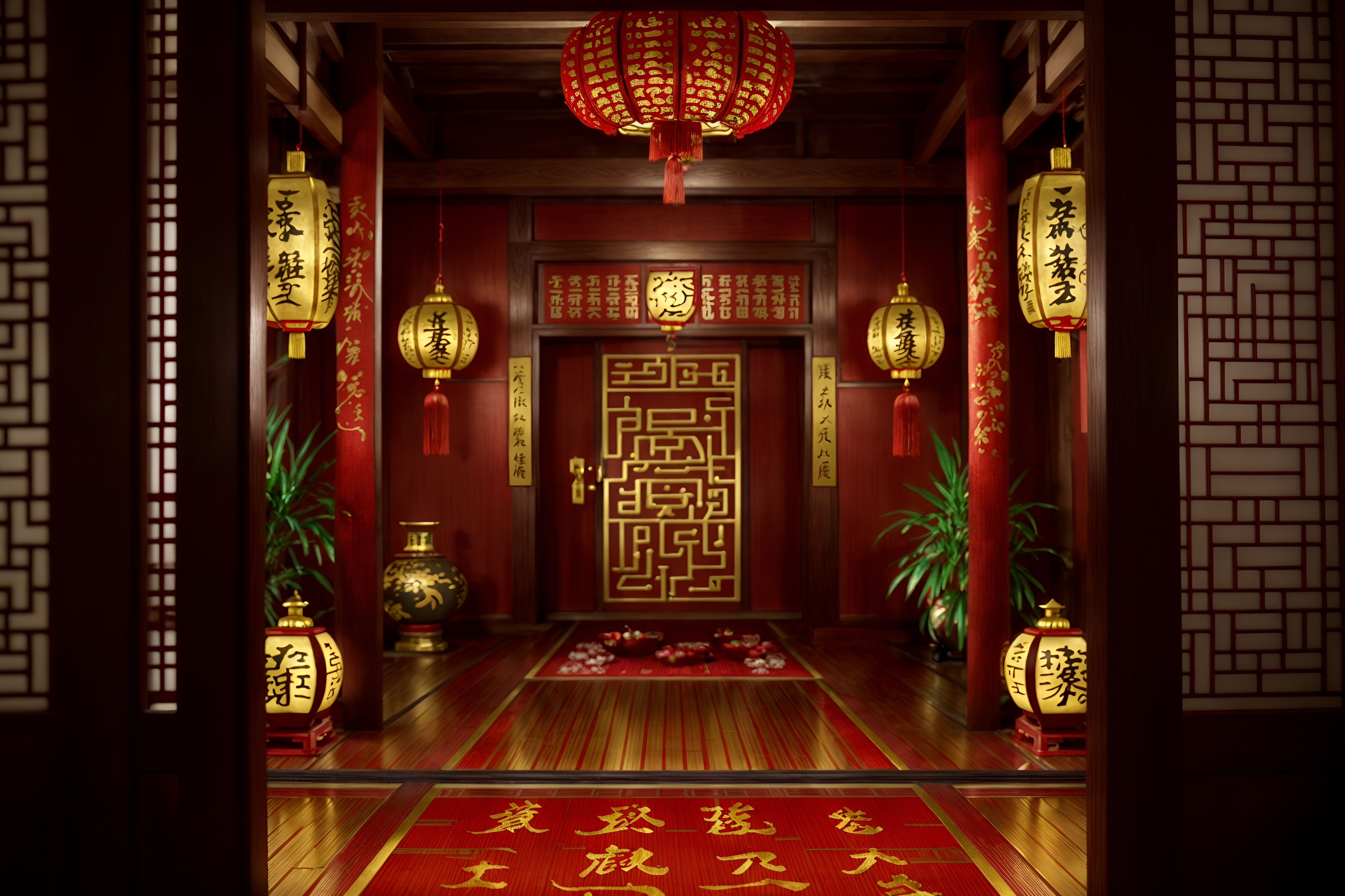 photo from pinterest of chinese new year-style interior designed (onsen interior) . with red and gold tassels and chinese knots and money tree and zodiac calendar and vases of plum blossoms and orchids and door couplets and gold ingots and red and gold candles. . cinematic photo, highly detailed, cinematic lighting, ultra-detailed, ultrarealistic, photorealism, 8k. trending on pinterest. chinese new year interior design style. masterpiece, cinematic light, ultrarealistic+, photorealistic+, 8k, raw photo, realistic, sharp focus on eyes, (symmetrical eyes), (intact eyes), hyperrealistic, highest quality, best quality, , highly detailed, masterpiece, best quality, extremely detailed 8k wallpaper, masterpiece, best quality, ultra-detailed, best shadow, detailed background, detailed face, detailed eyes, high contrast, best illumination, detailed face, dulux, caustic, dynamic angle, detailed glow. dramatic lighting. highly detailed, insanely detailed hair, symmetrical, intricate details, professionally retouched, 8k high definition. strong bokeh. award winning photo.