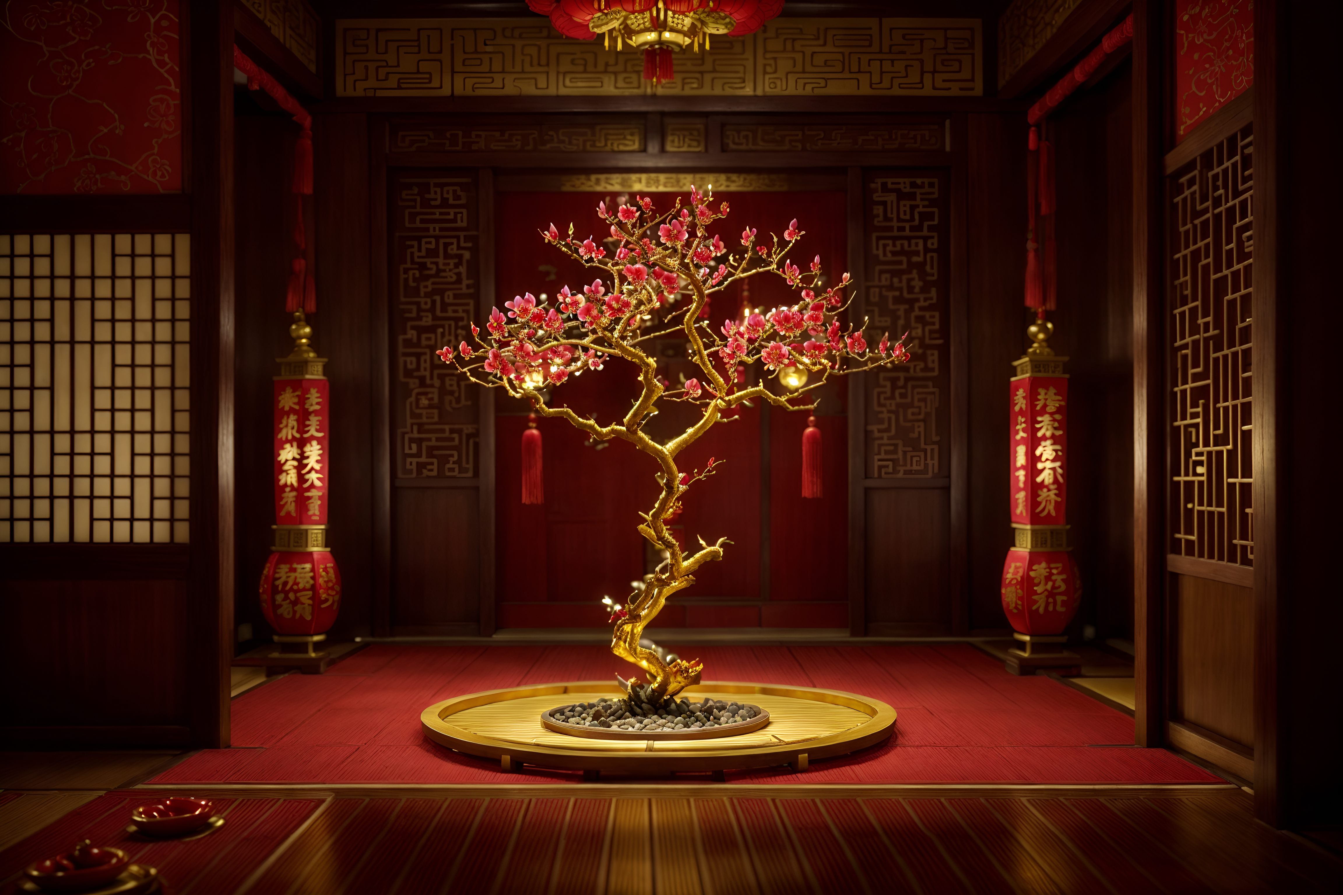 photo from pinterest of chinese new year-style interior designed (onsen interior) . with red and gold tassels and chinese knots and money tree and zodiac calendar and vases of plum blossoms and orchids and door couplets and gold ingots and red and gold candles. . cinematic photo, highly detailed, cinematic lighting, ultra-detailed, ultrarealistic, photorealism, 8k. trending on pinterest. chinese new year interior design style. masterpiece, cinematic light, ultrarealistic+, photorealistic+, 8k, raw photo, realistic, sharp focus on eyes, (symmetrical eyes), (intact eyes), hyperrealistic, highest quality, best quality, , highly detailed, masterpiece, best quality, extremely detailed 8k wallpaper, masterpiece, best quality, ultra-detailed, best shadow, detailed background, detailed face, detailed eyes, high contrast, best illumination, detailed face, dulux, caustic, dynamic angle, detailed glow. dramatic lighting. highly detailed, insanely detailed hair, symmetrical, intricate details, professionally retouched, 8k high definition. strong bokeh. award winning photo.