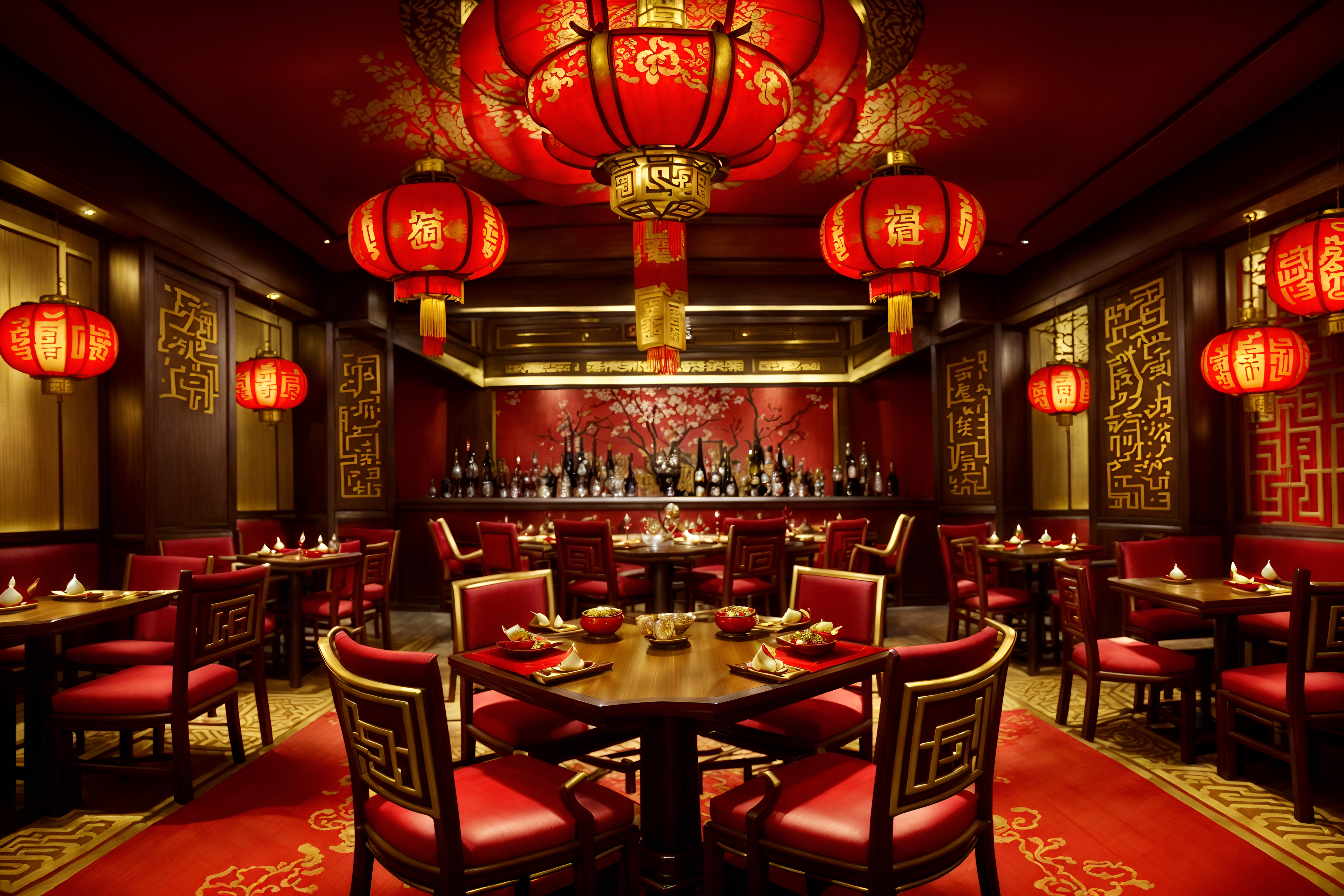 photo from pinterest of chinese new year-style interior designed (restaurant interior) with restaurant bar and restaurant chairs and restaurant dining tables and restaurant decor and restaurant bar. . with fai chun banners and chinese red lanterns and chinese knots and gold ingots and red and gold candles and vases of plum blossoms and orchids and door couplets and paper cuttings. . cinematic photo, highly detailed, cinematic lighting, ultra-detailed, ultrarealistic, photorealism, 8k. trending on pinterest. chinese new year interior design style. masterpiece, cinematic light, ultrarealistic+, photorealistic+, 8k, raw photo, realistic, sharp focus on eyes, (symmetrical eyes), (intact eyes), hyperrealistic, highest quality, best quality, , highly detailed, masterpiece, best quality, extremely detailed 8k wallpaper, masterpiece, best quality, ultra-detailed, best shadow, detailed background, detailed face, detailed eyes, high contrast, best illumination, detailed face, dulux, caustic, dynamic angle, detailed glow. dramatic lighting. highly detailed, insanely detailed hair, symmetrical, intricate details, professionally retouched, 8k high definition. strong bokeh. award winning photo.